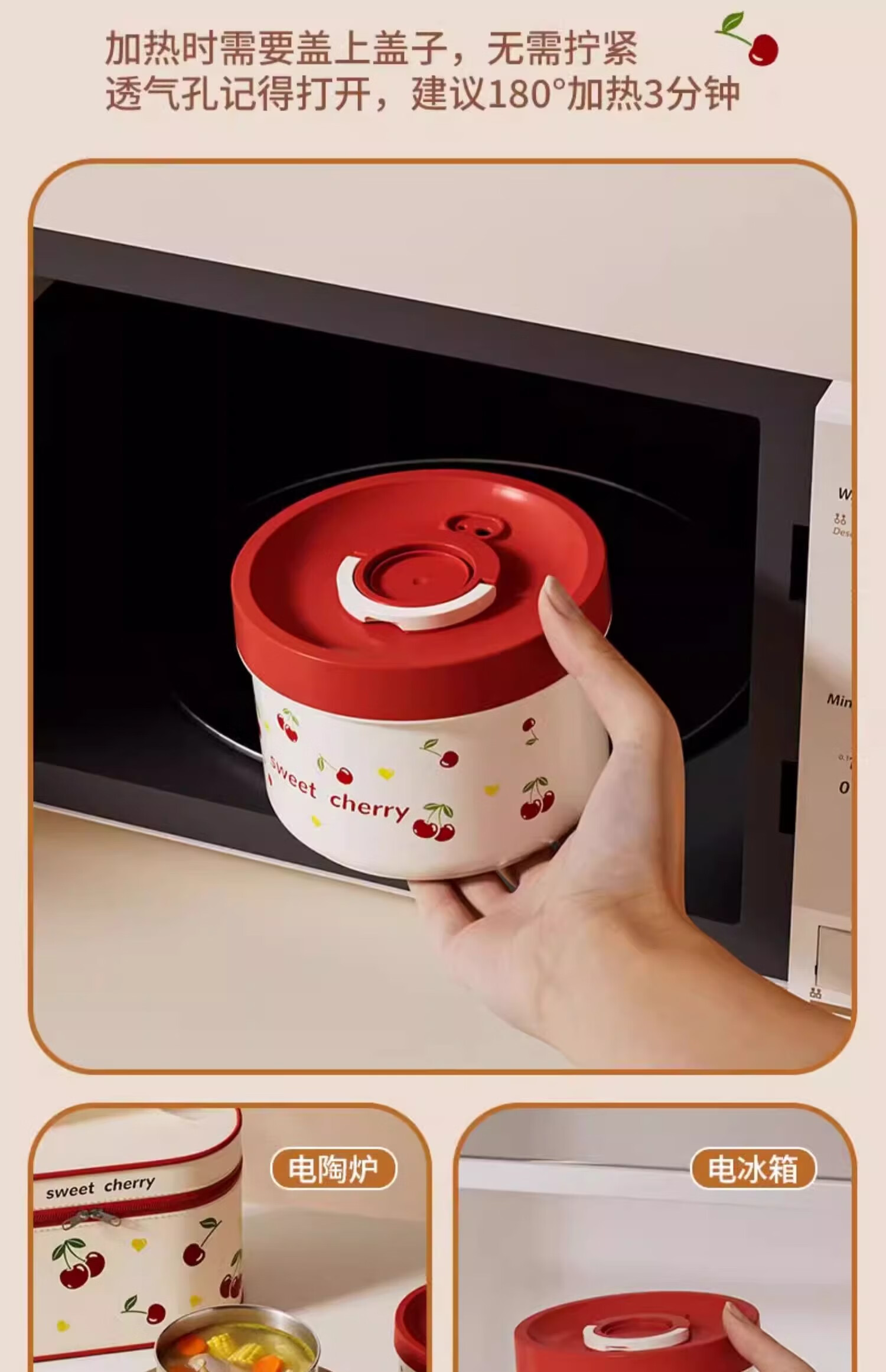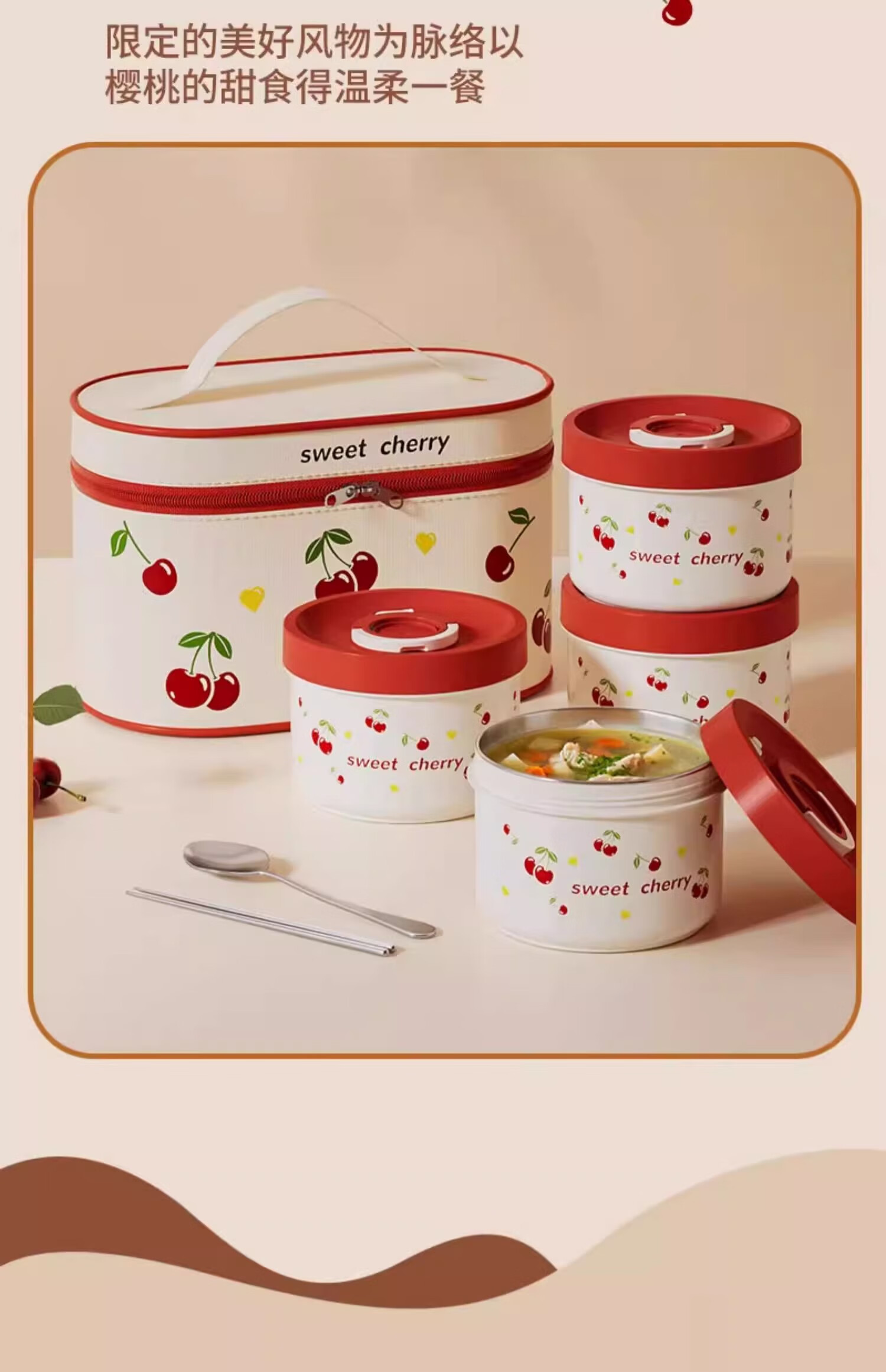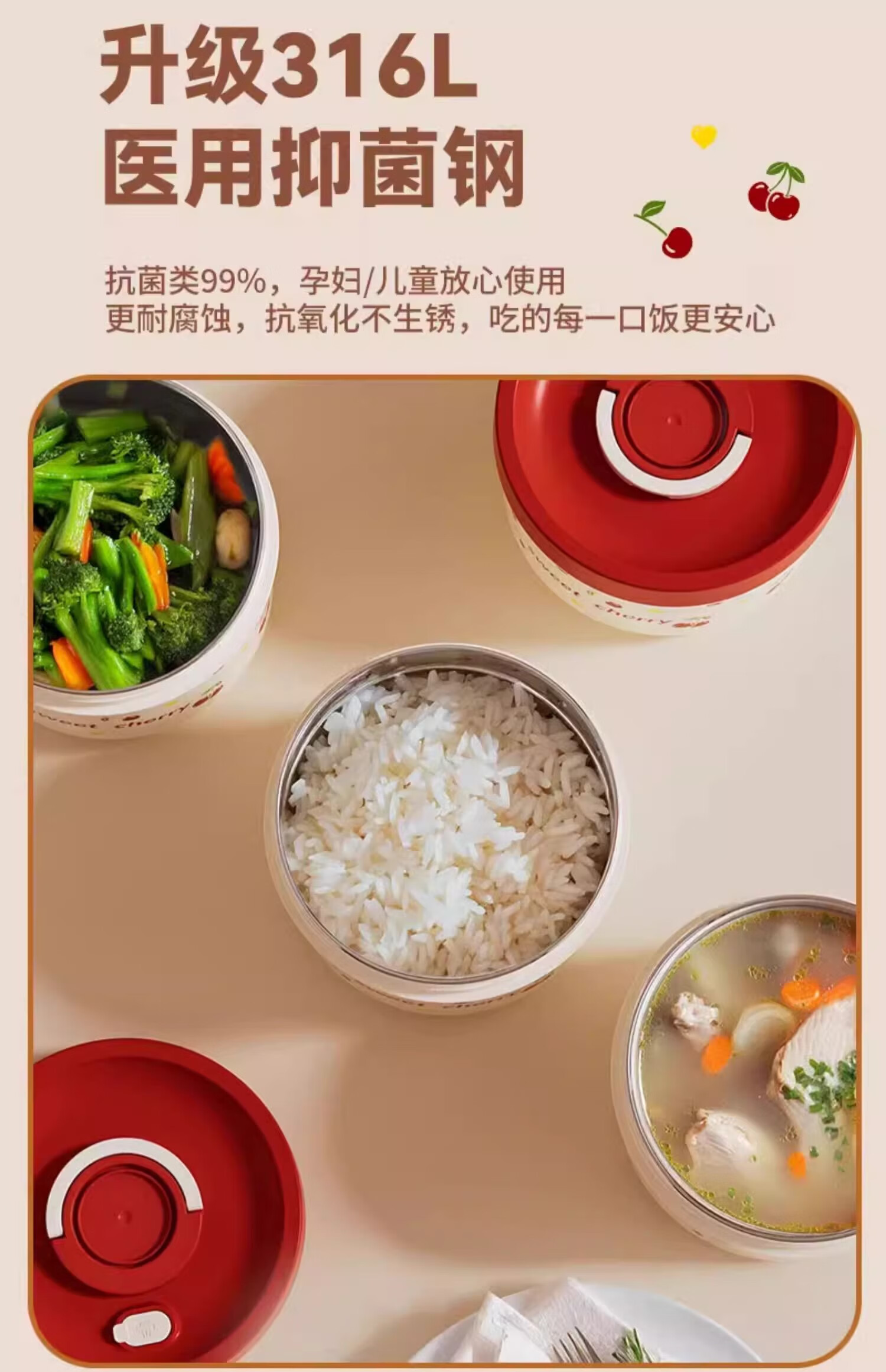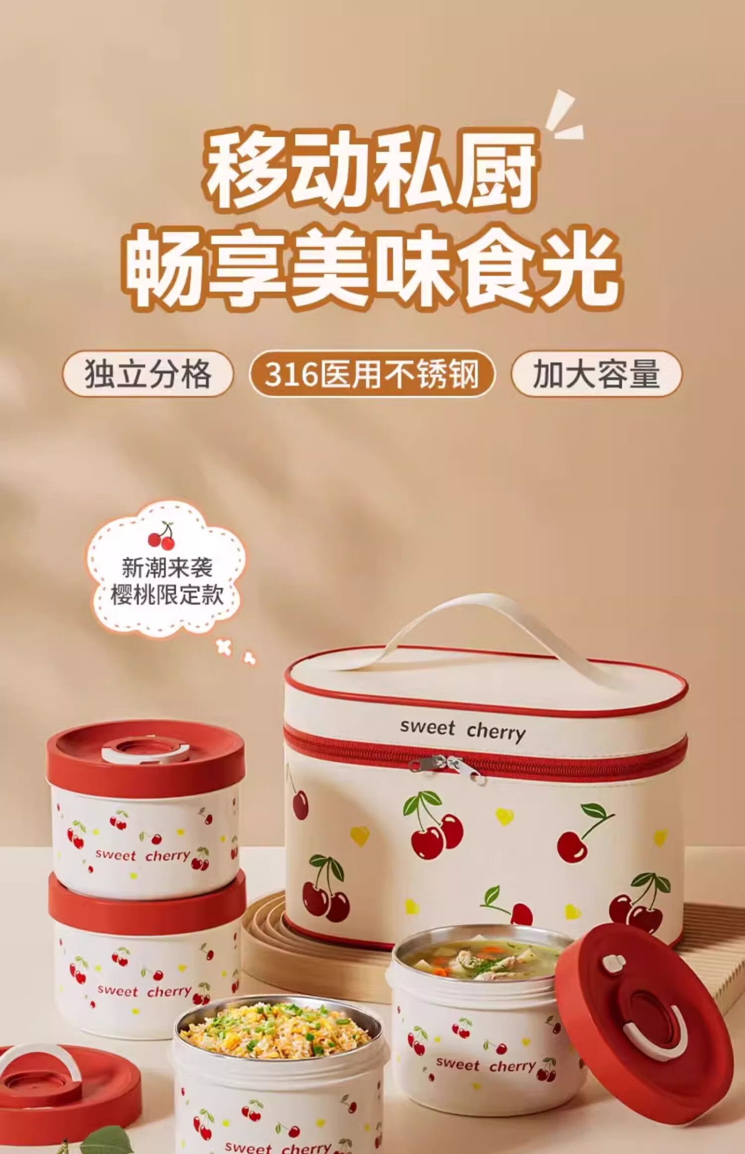 THERMOS Insulated Lunch Box Microwave Heated Office Lunch Box 2025 New Student Special Packed Lunch Box Bowl Three-Layer Cherry 2100ml + Insulation Bag