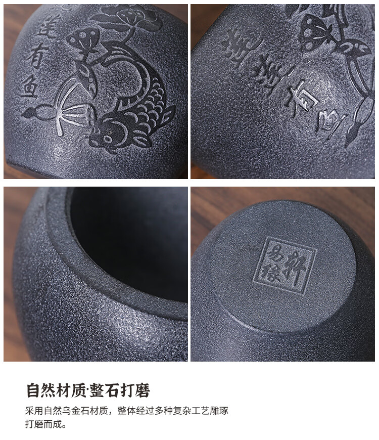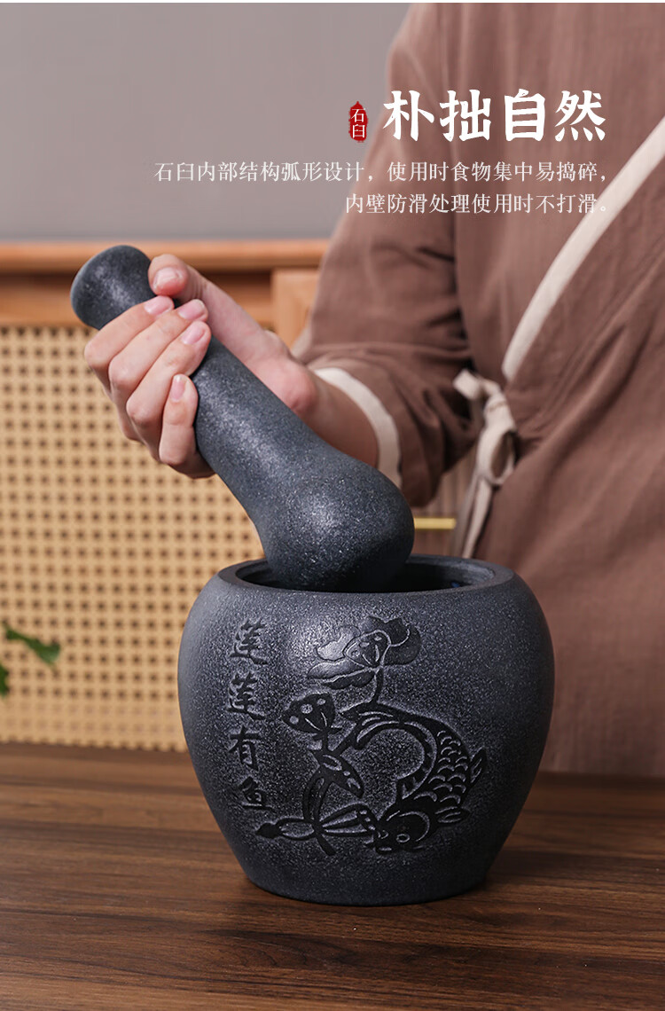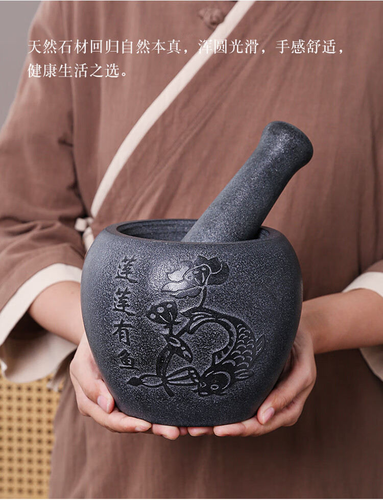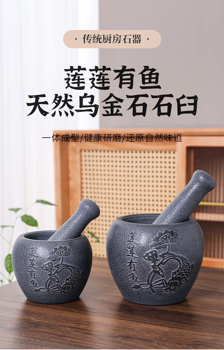 Yi Yuanxuan household natural black gold garlic mortar, stone mortar, medicine jar, stone cup, garlic pounder, pair of wolei bowl, pepper mashing and grinding machine, black gold stone lotus, fish outer diameter 13CM