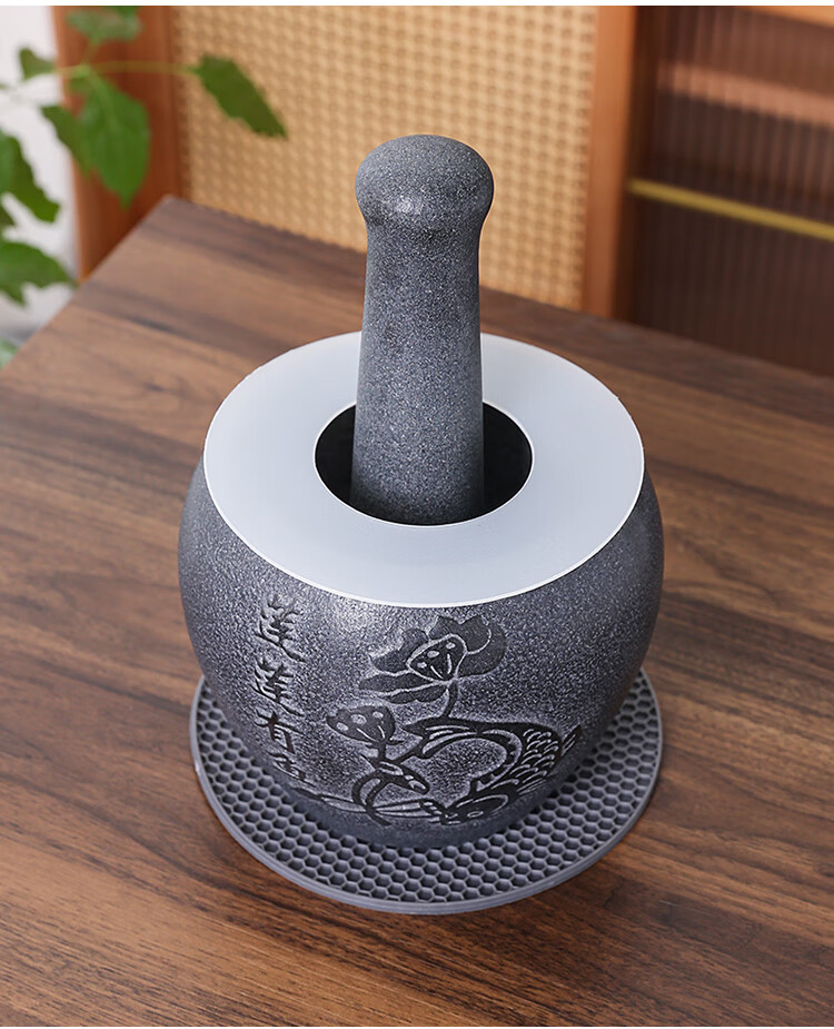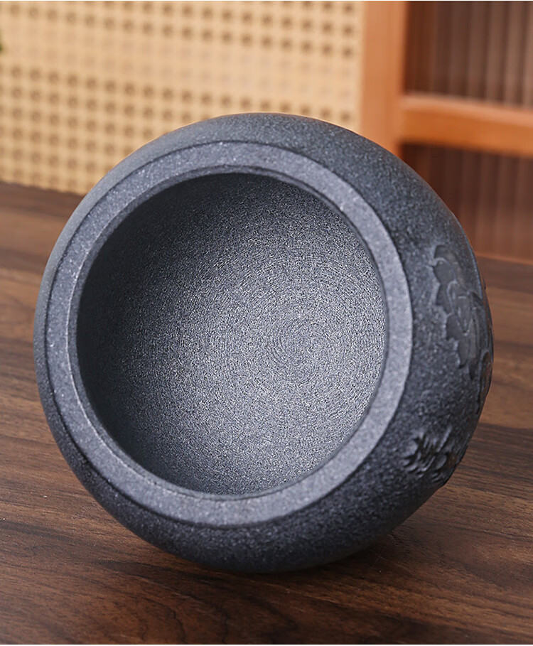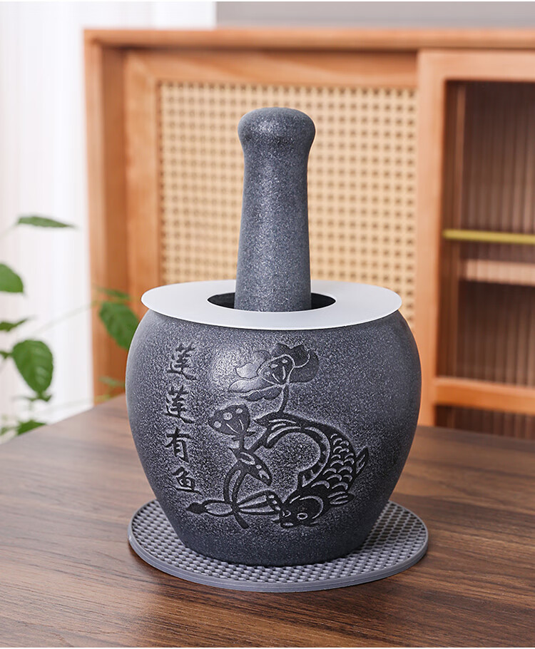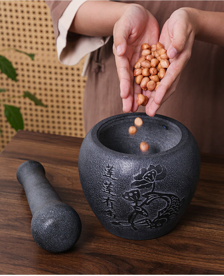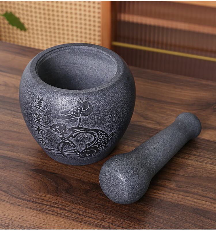 Yi Yuanxuan household natural black gold garlic mortar, stone mortar, medicine jar, stone cup, garlic pounder, pair of wolei bowl, pepper mashing and grinding machine, black gold stone lotus, fish outer diameter 13CM
