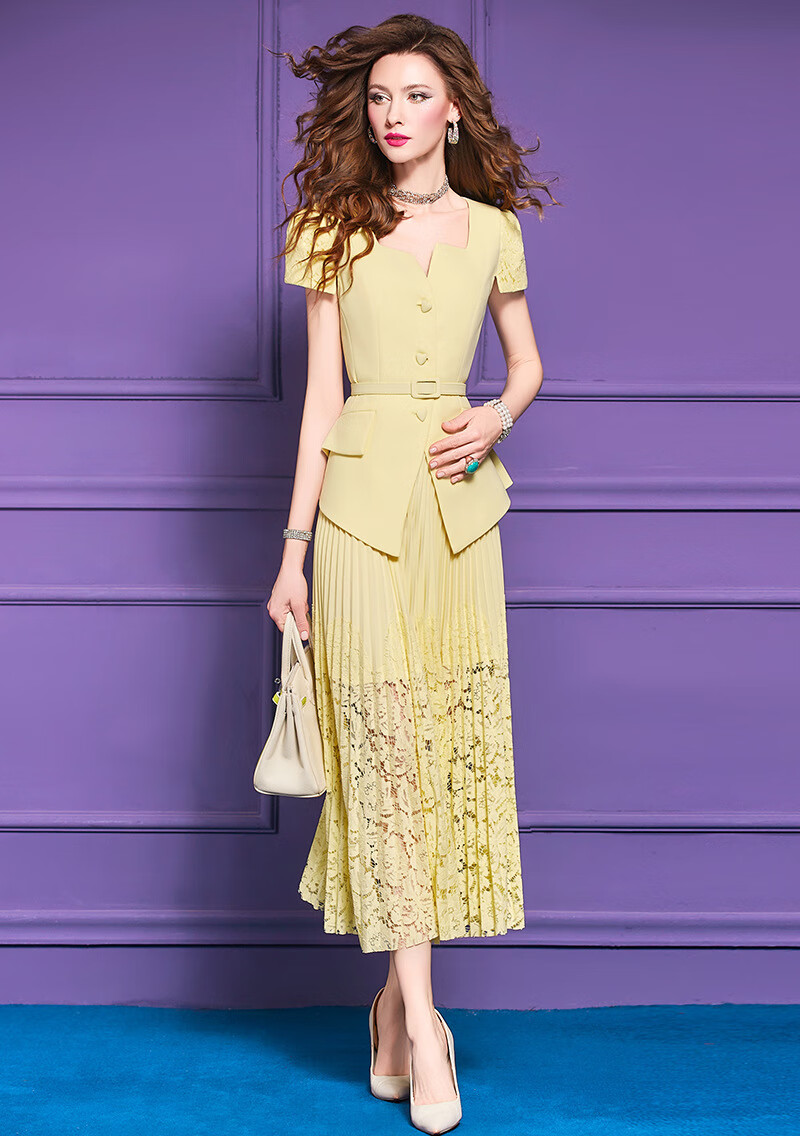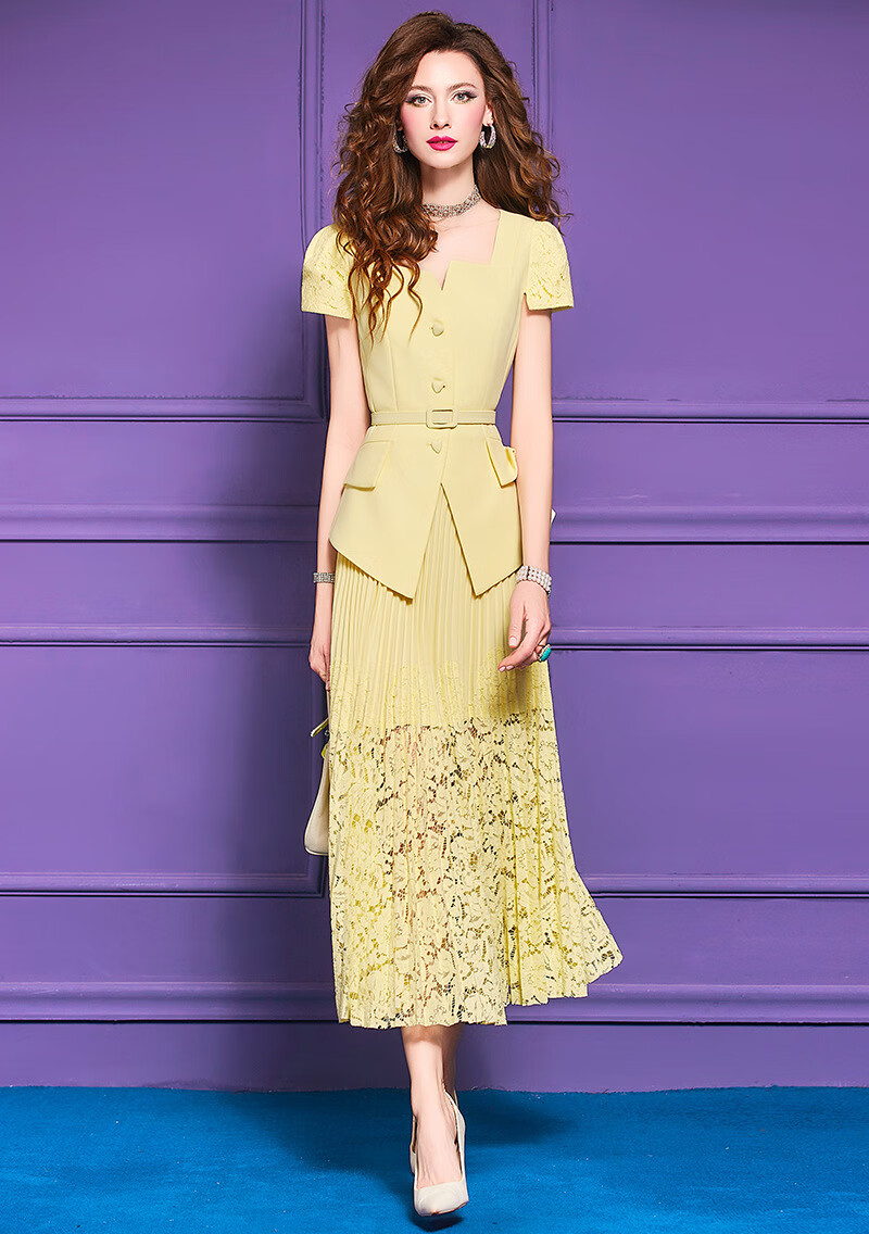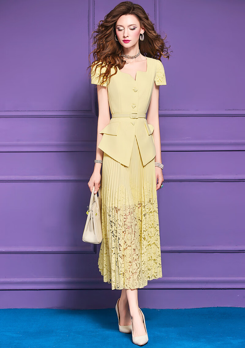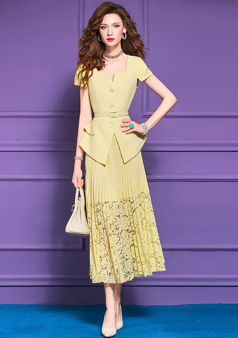 Feimeng Yigan's age-reducing set of women's summer design ruffled waist top lace pleated skirt goose yellow M