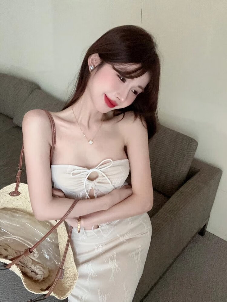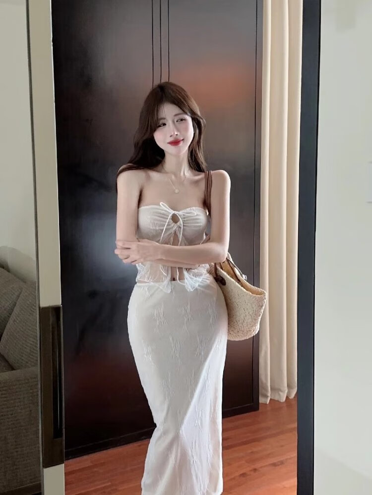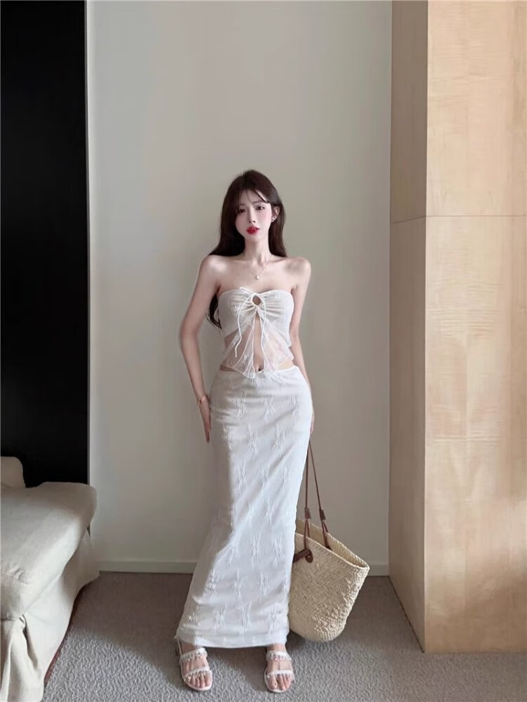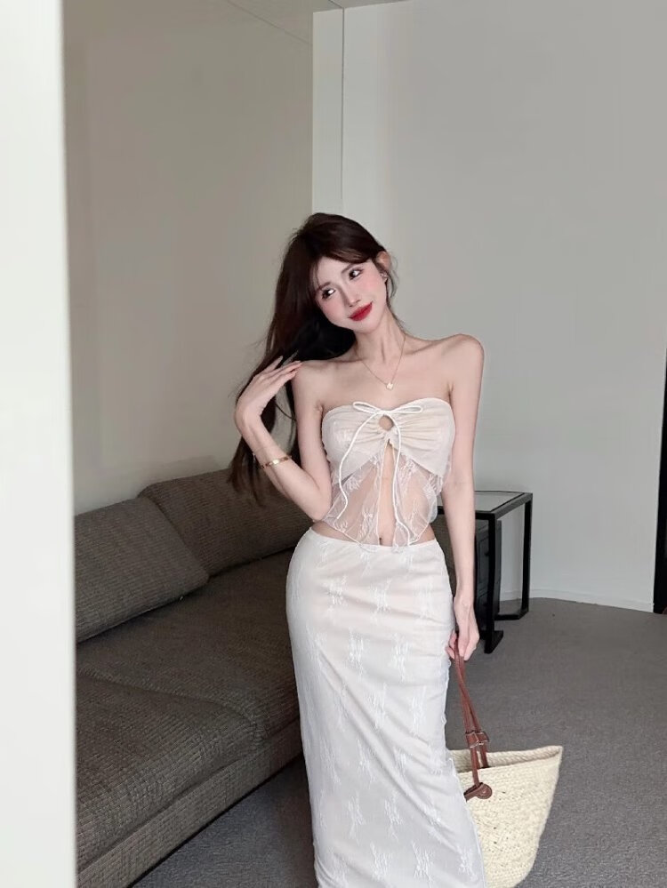 Fu Jian bikini swimsuit for women in Thailand niche lace tube top split vacation sexy slim long skirt hot spring set split three-piece set off-white one size fits all 80-120 Jin Jin is equal to 0.5 kg