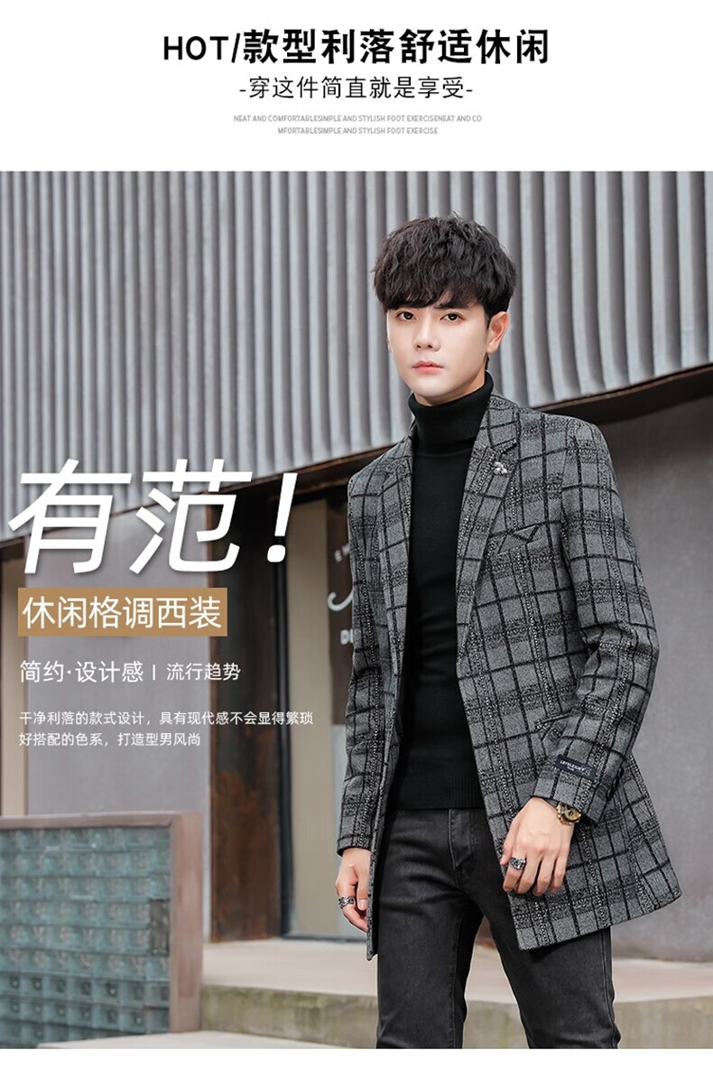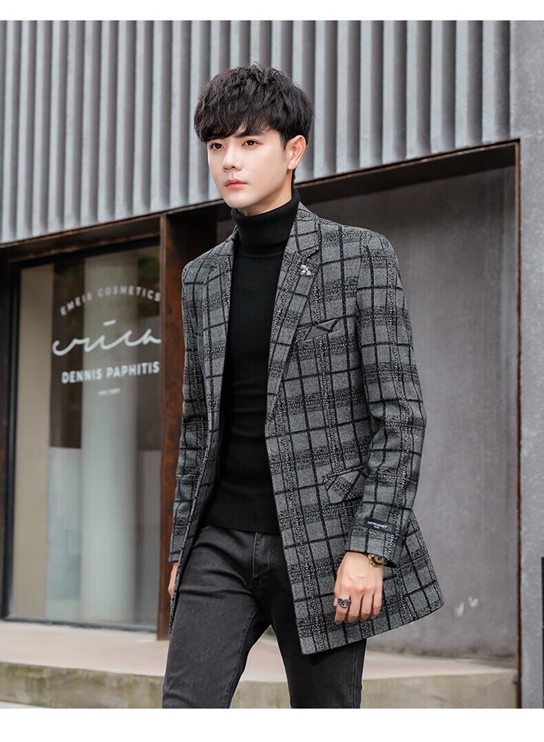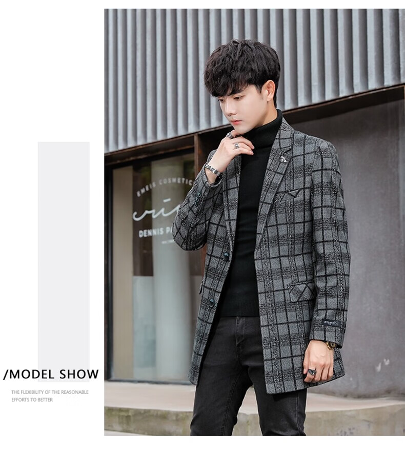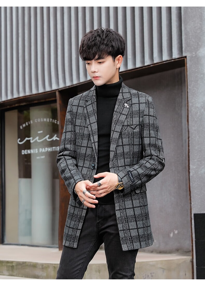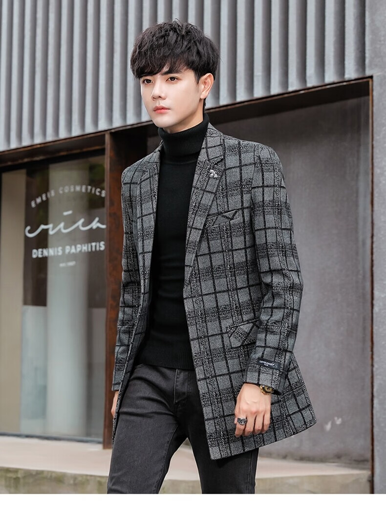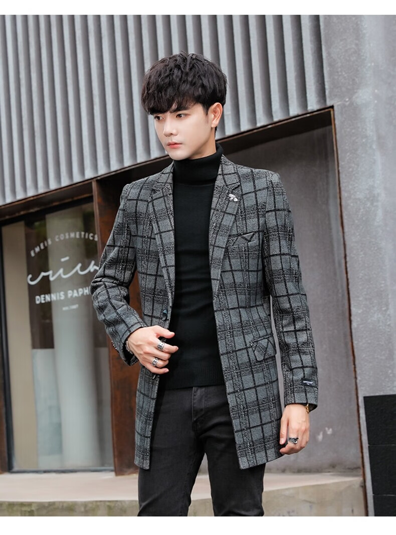 Playboy (PLAYBOY) Men's Suit Mid-Length Windbreaker Jacket Spring and Autumn Slim Woolen Suit Top Youth Trendy Woolen Coat Dark Plaid 2XL
