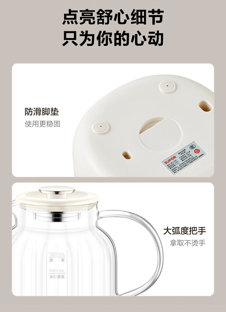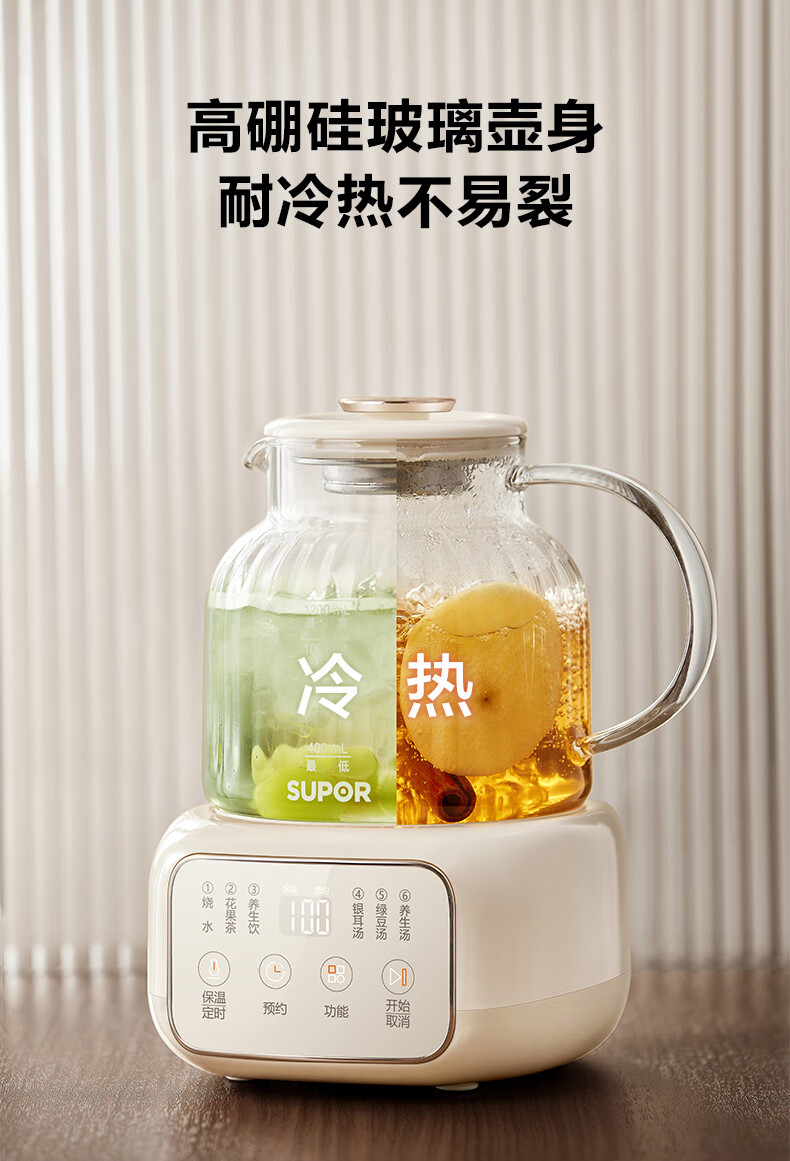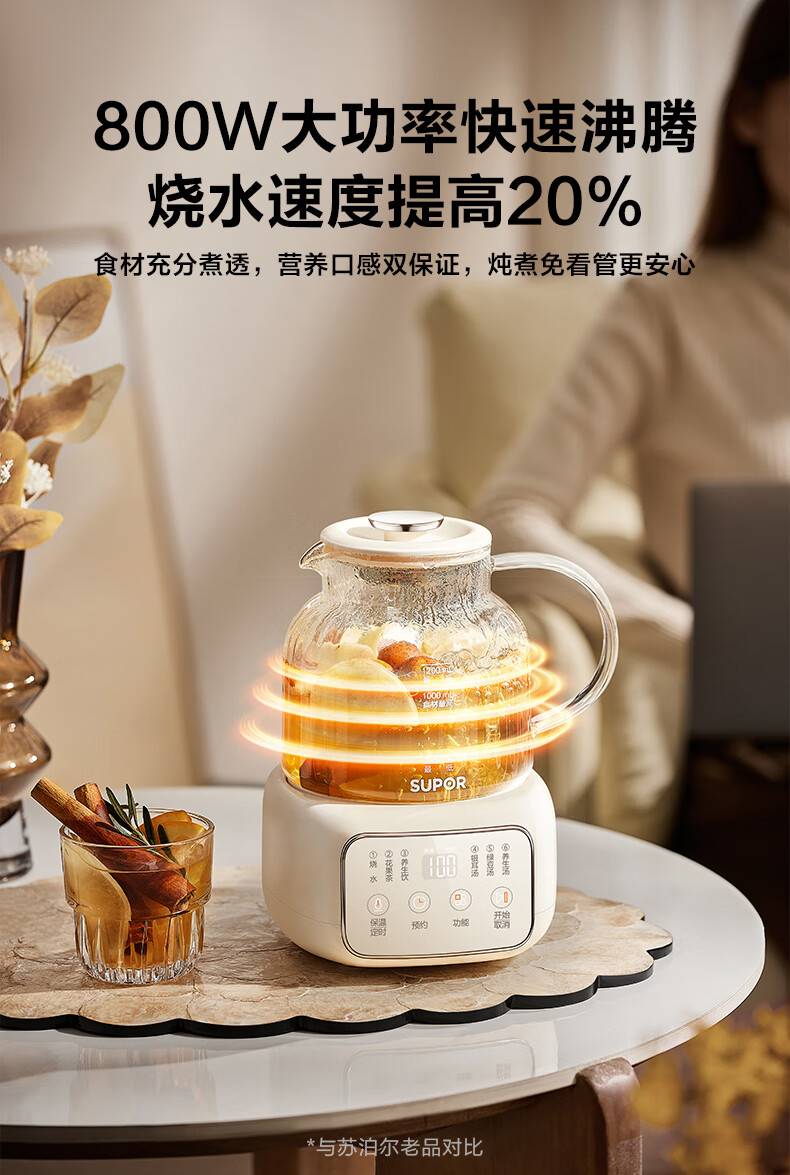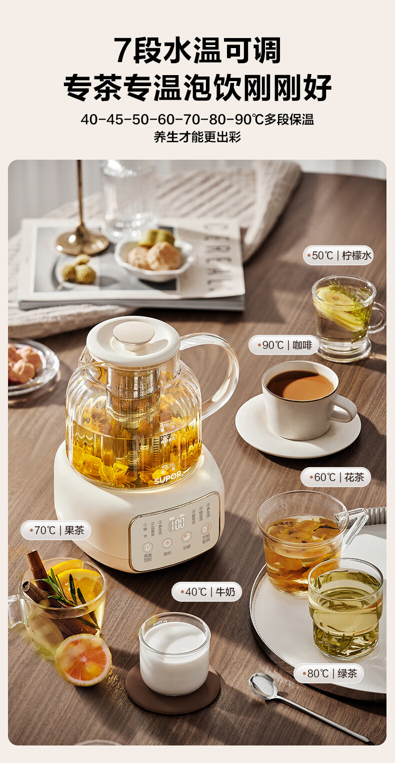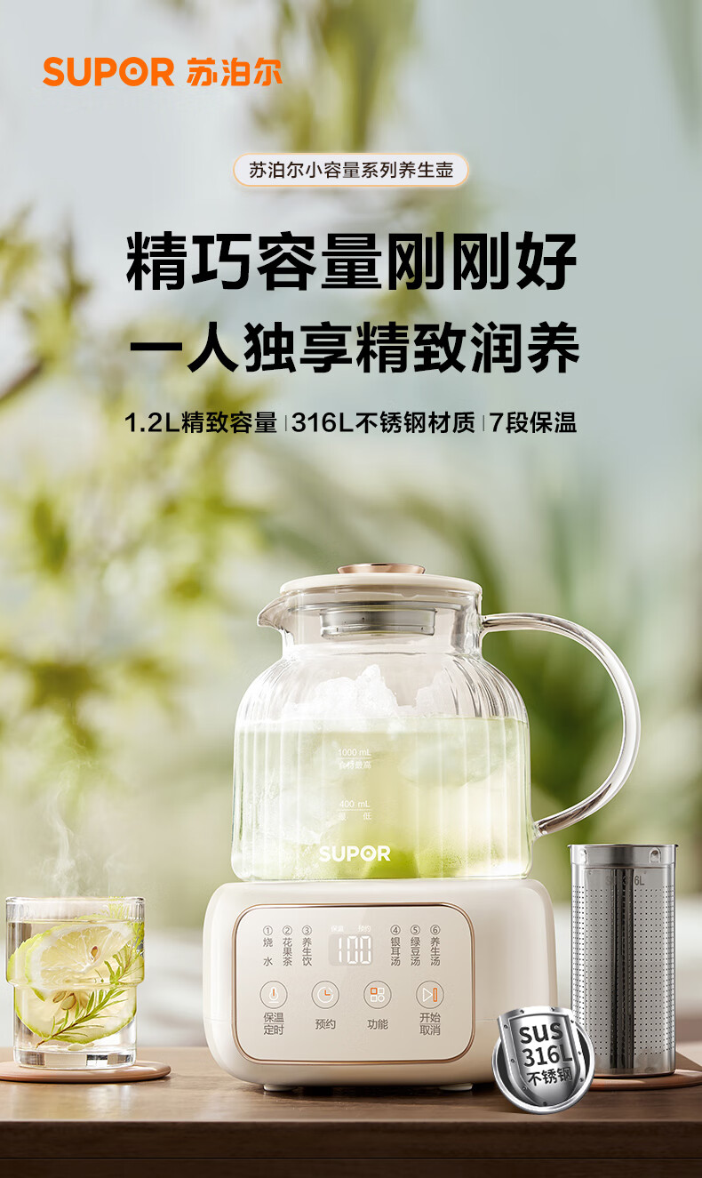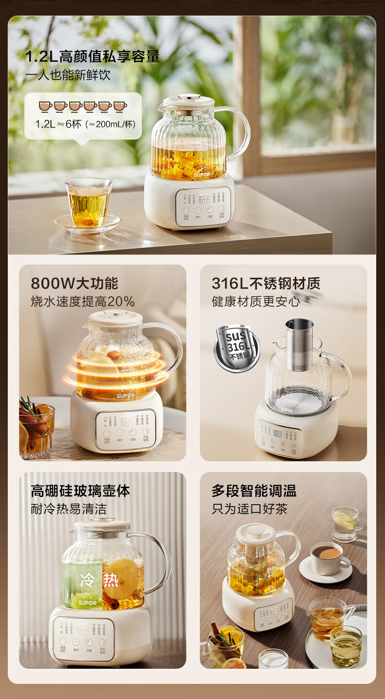 SUPOR health kettle, home office 1.2L health kettle, 0-coated 316L stainless steel health kettle, tea kettle, stewing all-in-one tea kettle, thermostatic kettle, 316L stainless steel heating plate, 6 function menu 1.2L