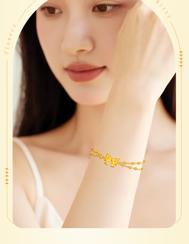 Lao Fengxiang bow gold bracelet for women 18K gold fugitive princess bracelet wedding anniversary gift for girlfriend and wife bow accessories + free 925 silver double layer bracelet