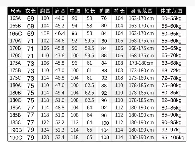 China (cm) 165 / 88-90 170 / 96-98 175 / 108-110 180 / 118-122 185 / 126-130