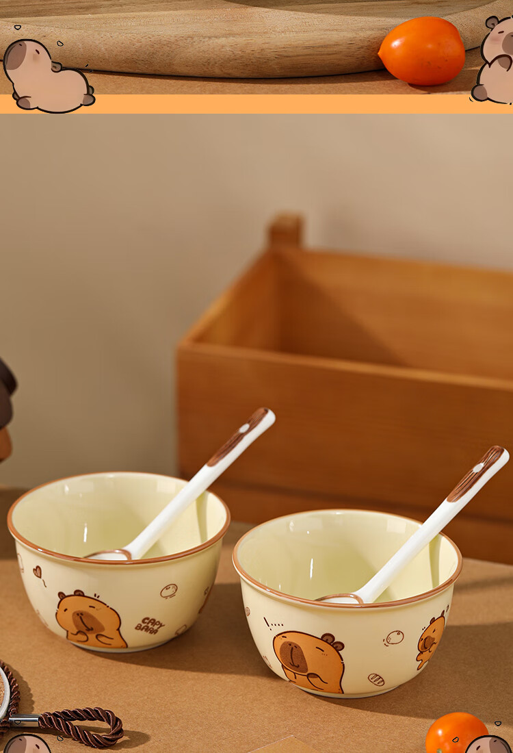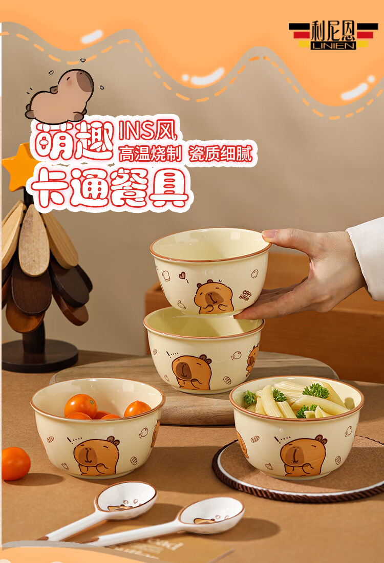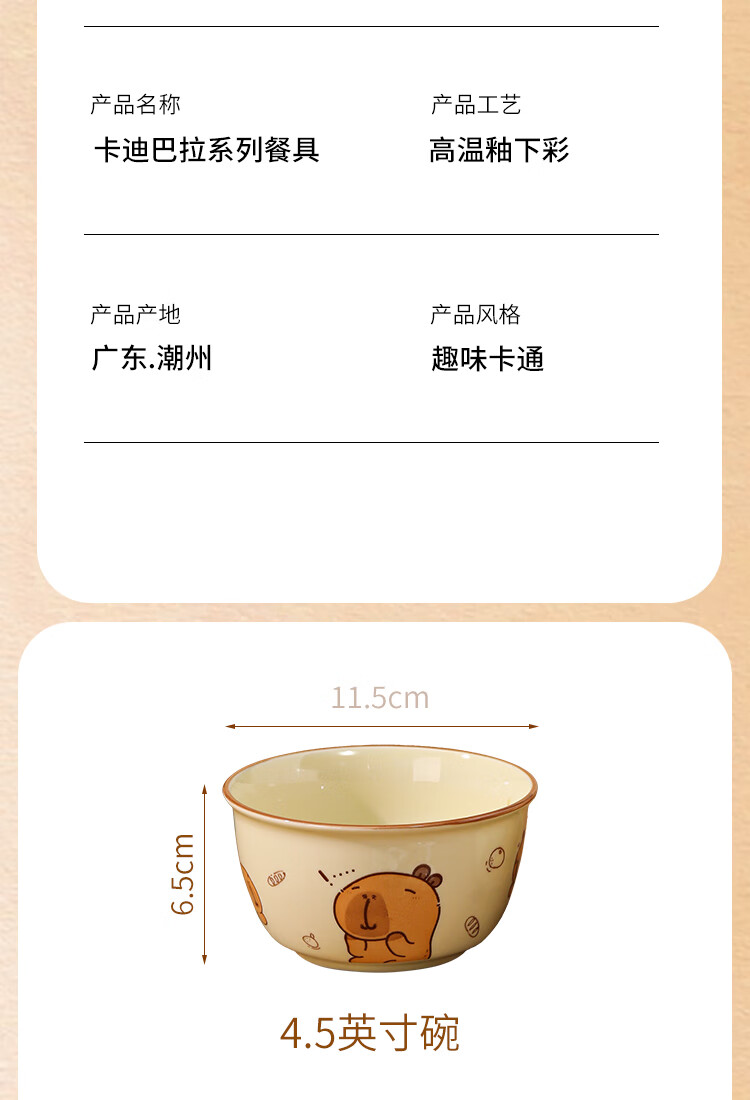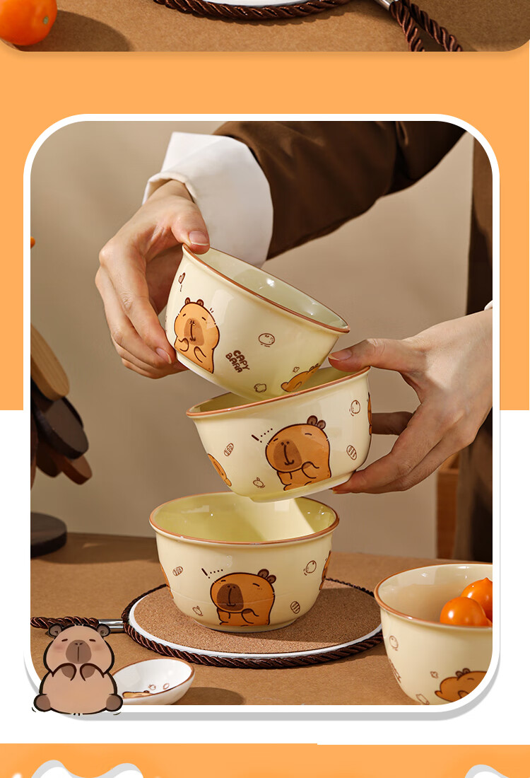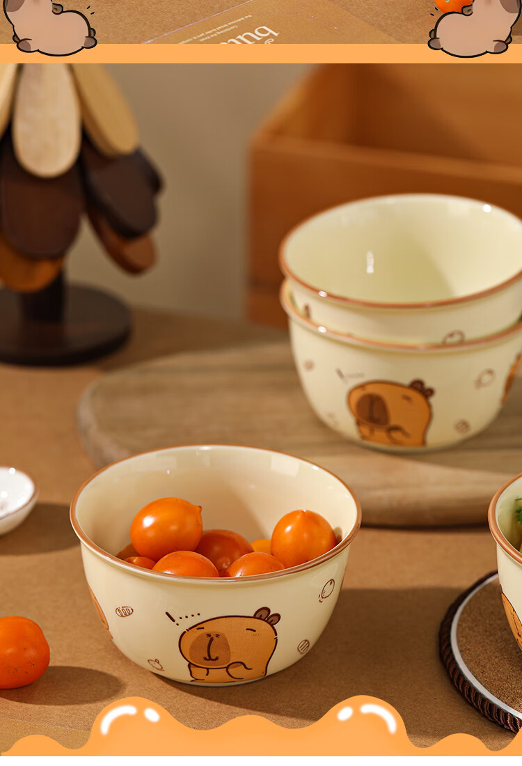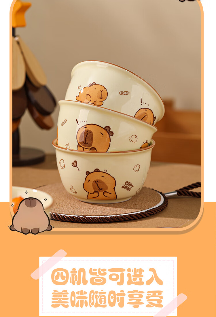 可爱卡皮巴拉斗笠碗4.5英寸饭碗家庭装釉下彩米饭碗精致儿童饭碗 4.5英寸碗【4个装】