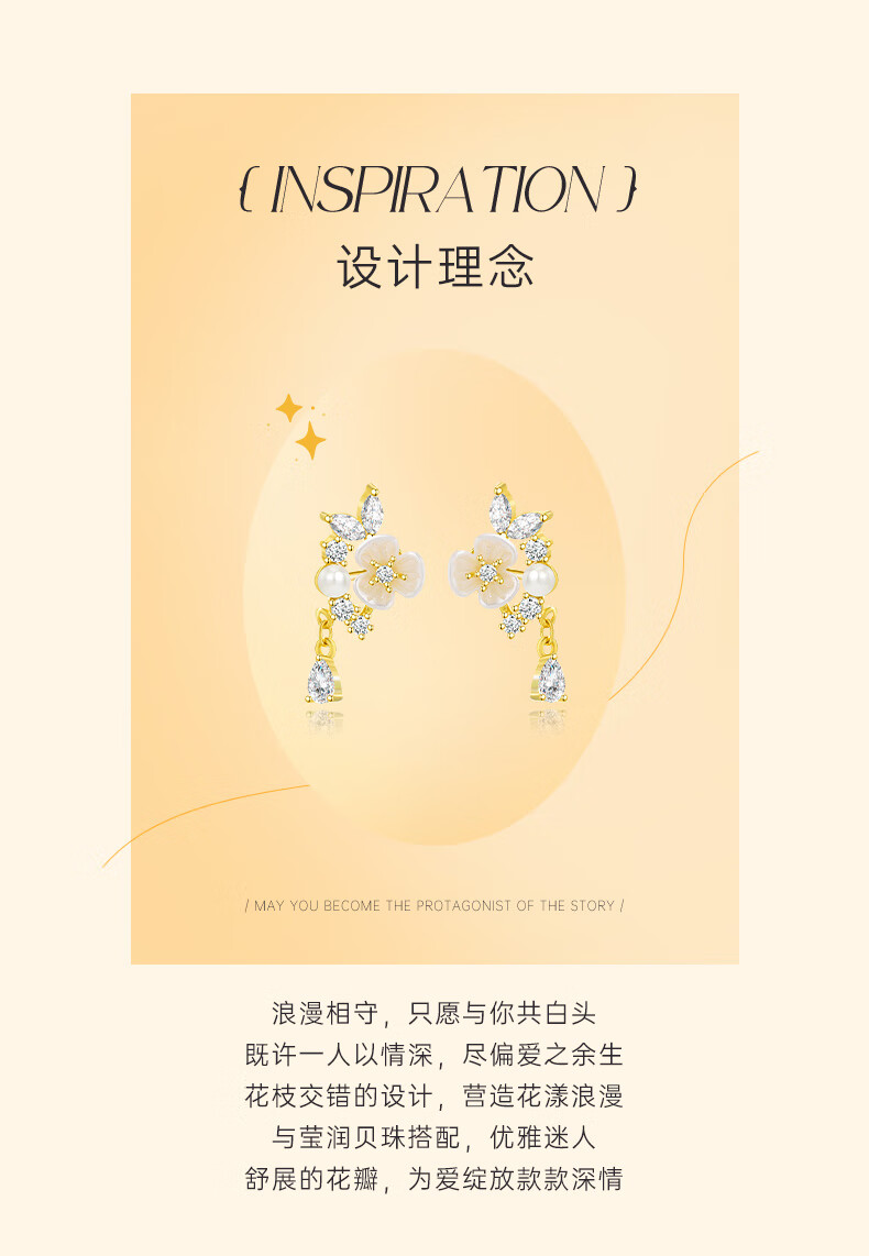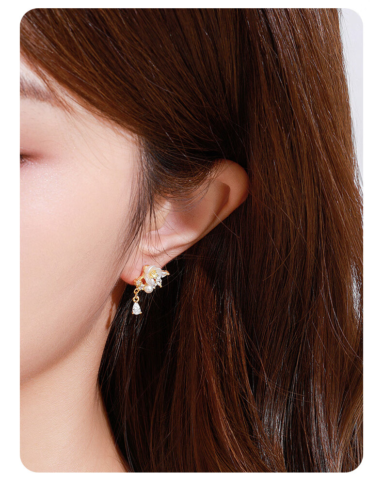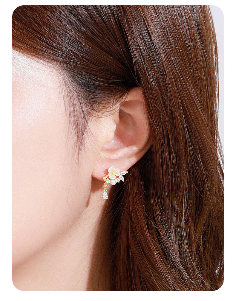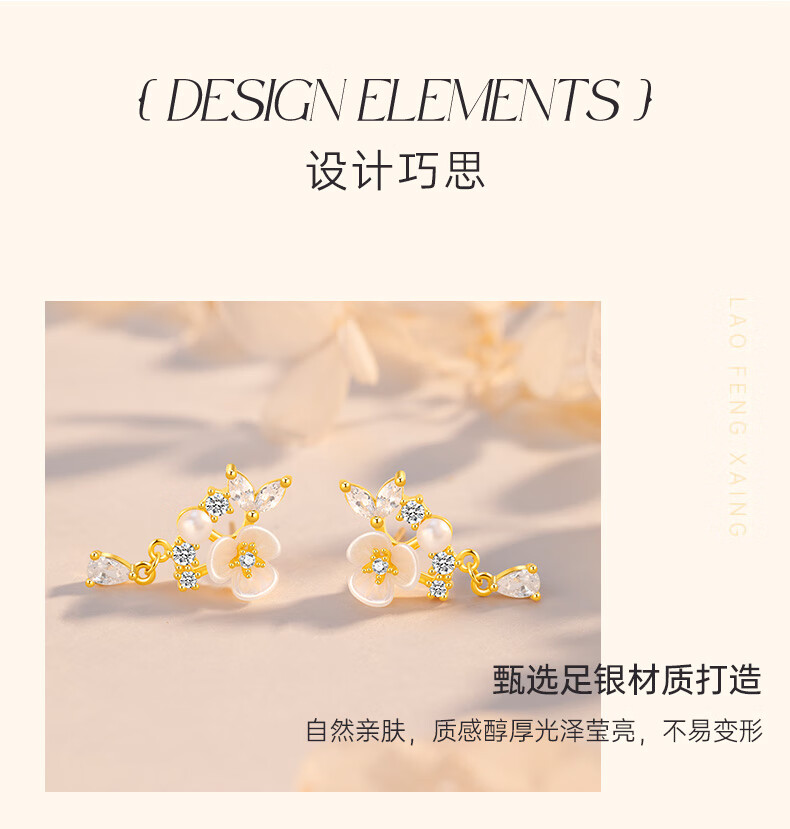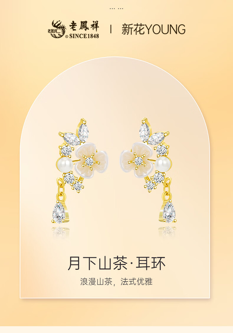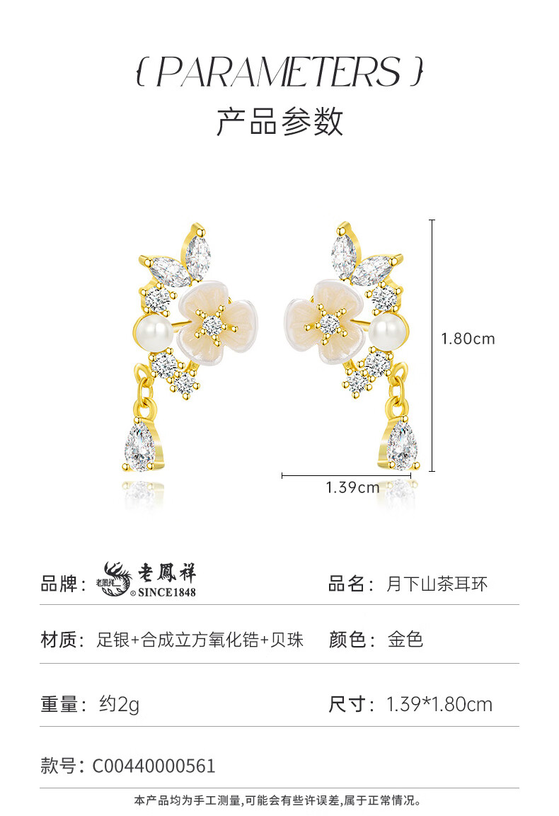 Laofengxiang pure silver earrings for women, light luxury fashion moon camellia earrings birthday anniversary gift for girlfriend and wife, shipped from Yagura, moon camellia earrings
