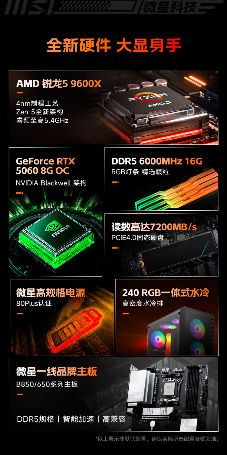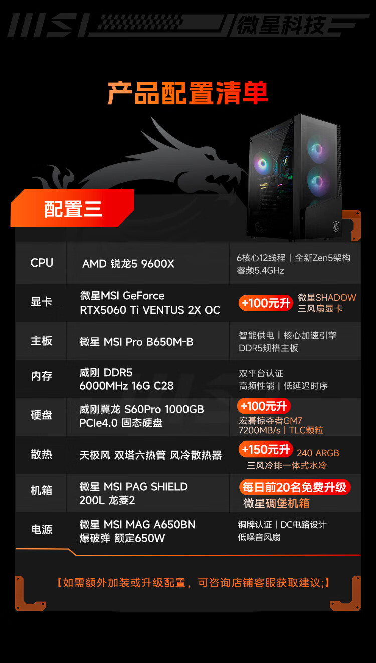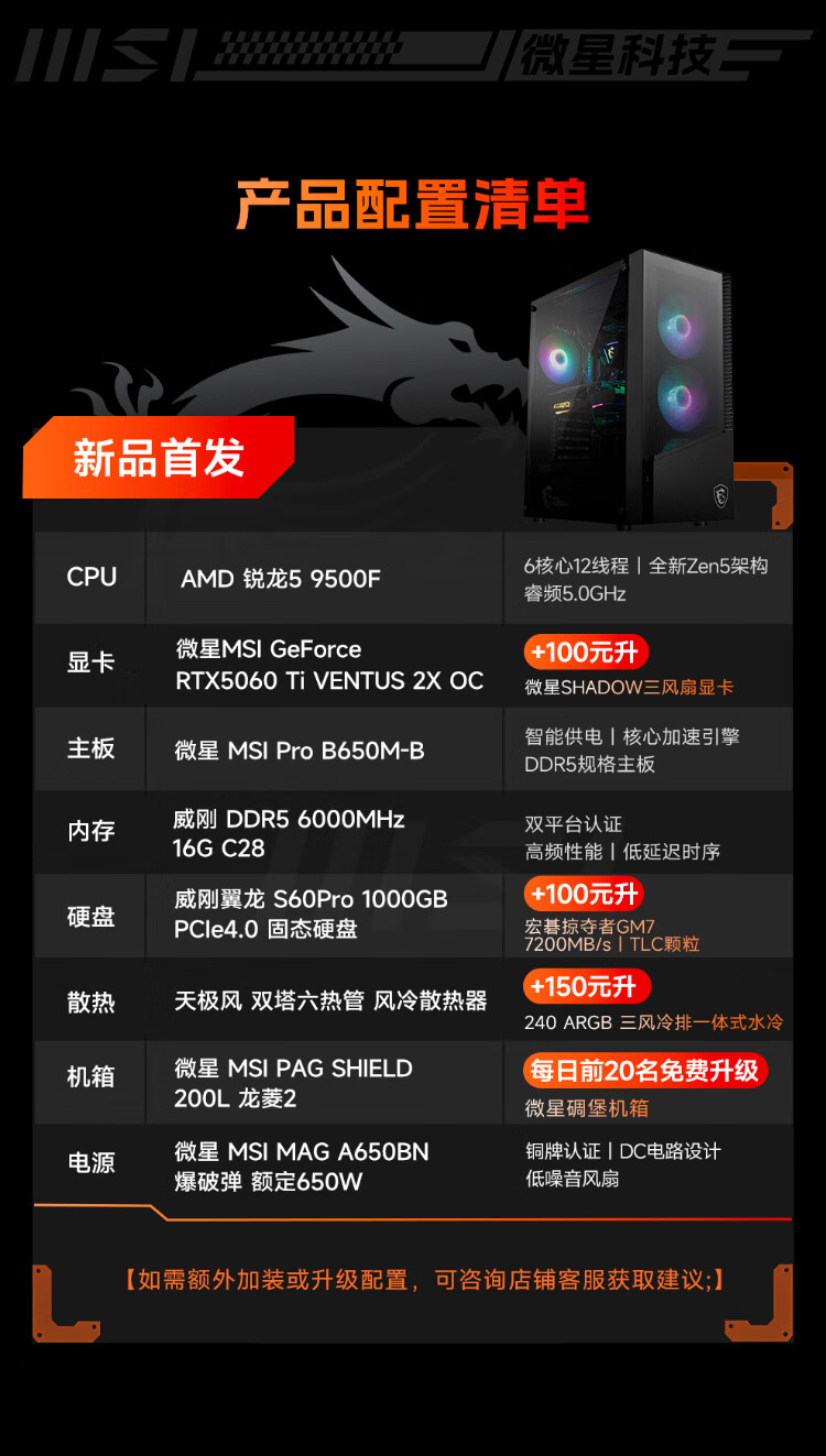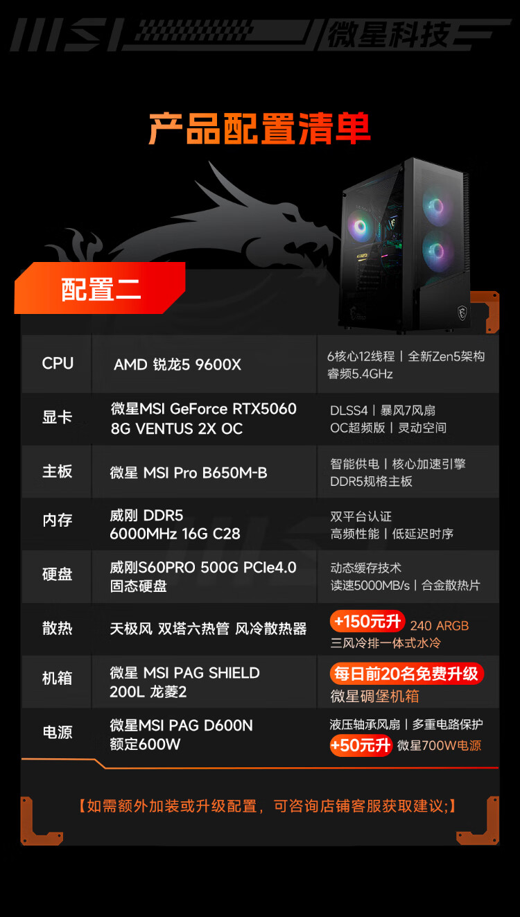 MSI AMD Ryzen 9500F/9600X/7800X3D/9800X3D with 5060/5070 graphics card DIY e-sports assembly desktop complete host game rendering design R5-9600X+RTX5060丨Configuration 2