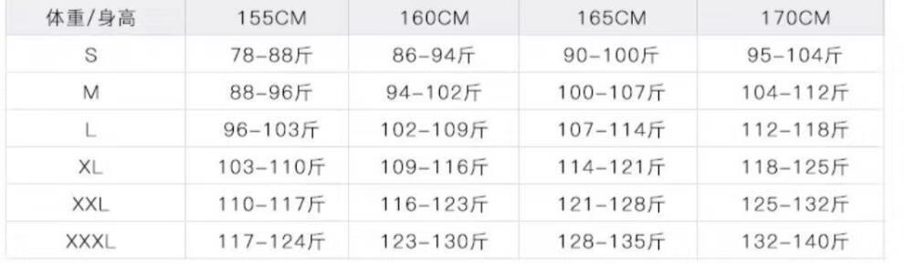 China (cm) 160-165/84-86 165-170 / 88-90 167-172 / 92-96 168-173 / 98-102 170-176 / 106-110