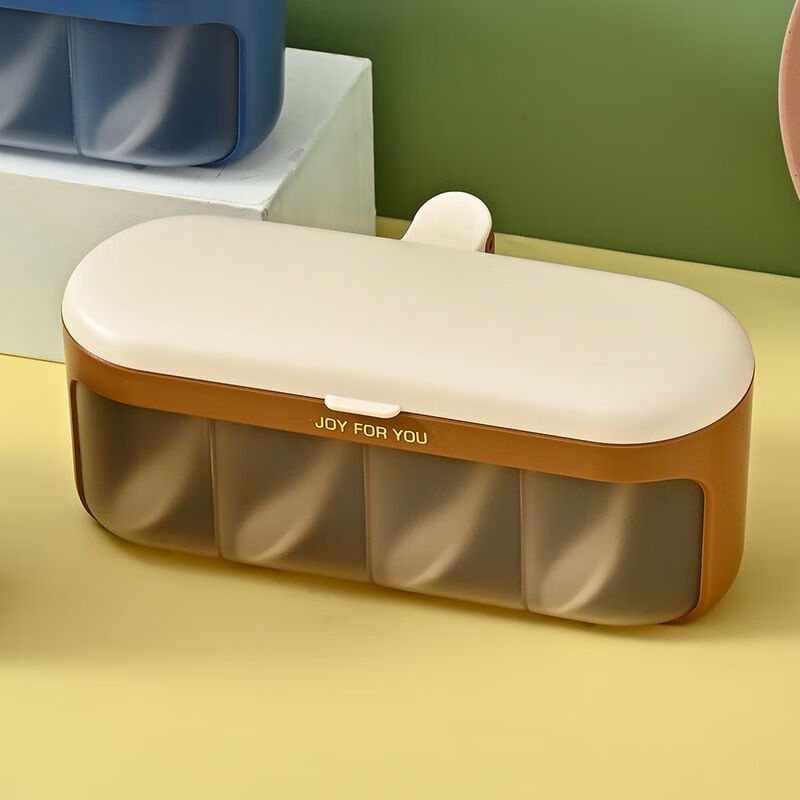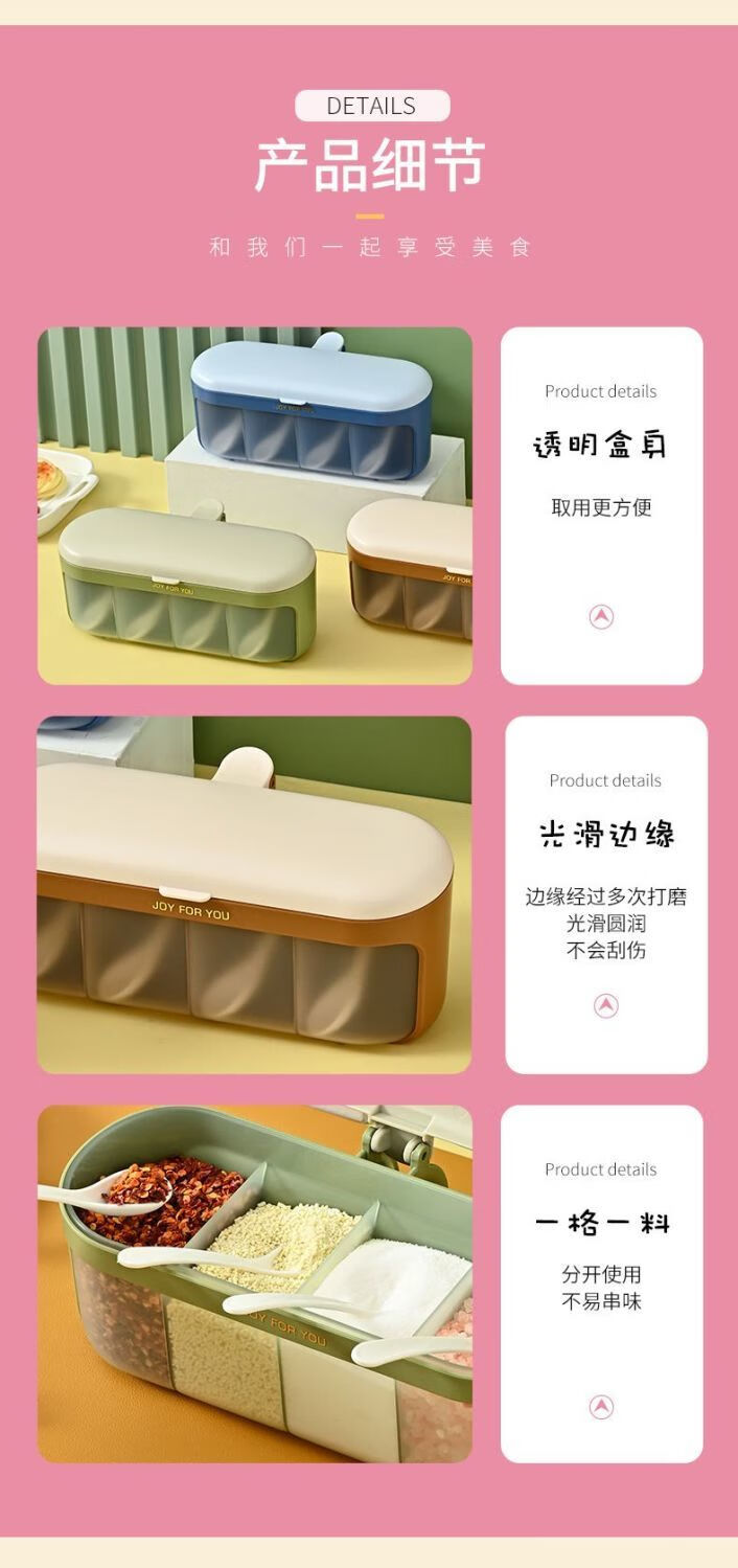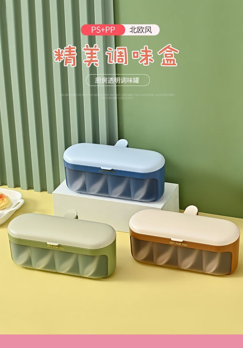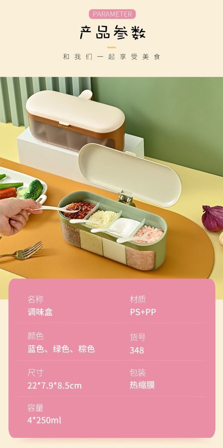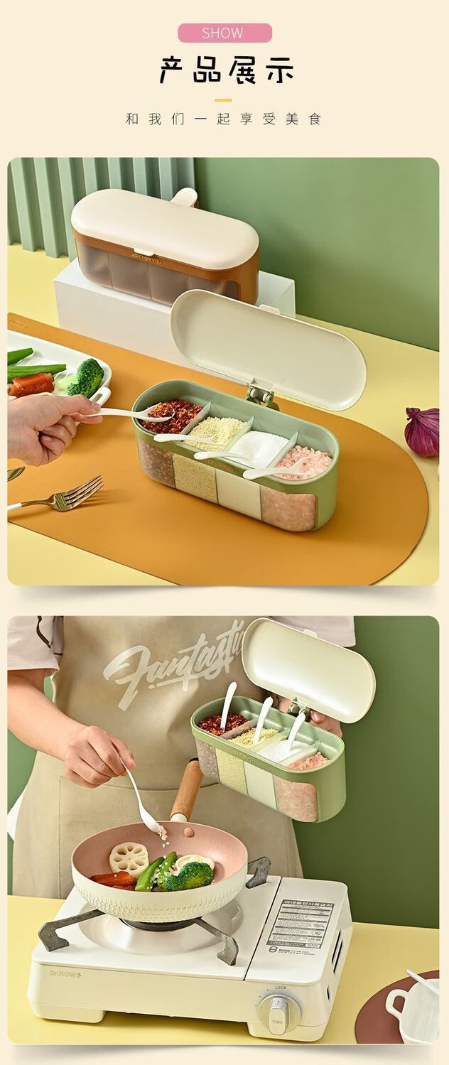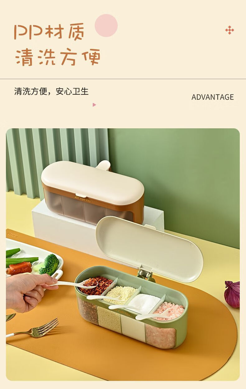 Enshousu seasoning box combination set seasoning bottle jar home kitchen sugar, MSG, salt shaker storage box one-piece 4-grid with spoon, fruit oil green, four-grid in one, inner + spoon
