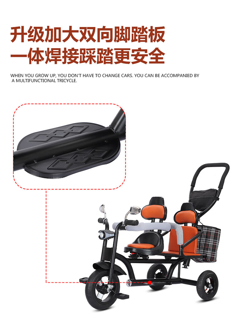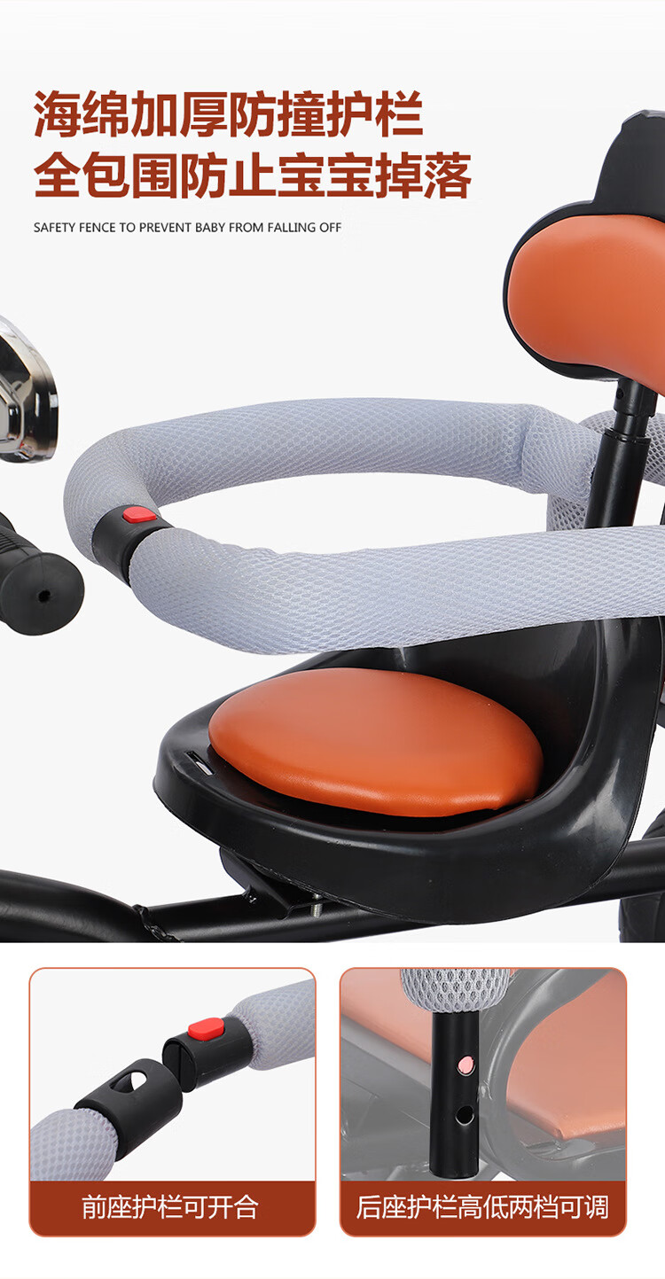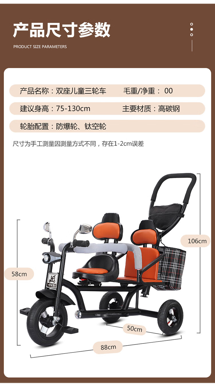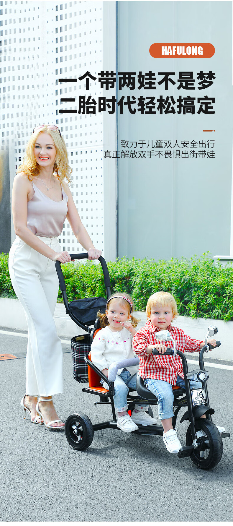 Double children's tricycle, second-child stroller, baby bicycle, twin infant stroller, powder rack + music + front and rear guardrails + shed - titanium empty wheel