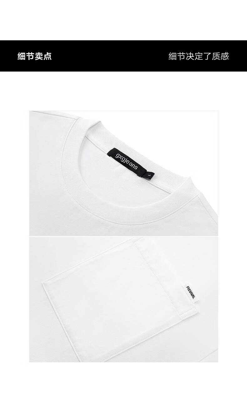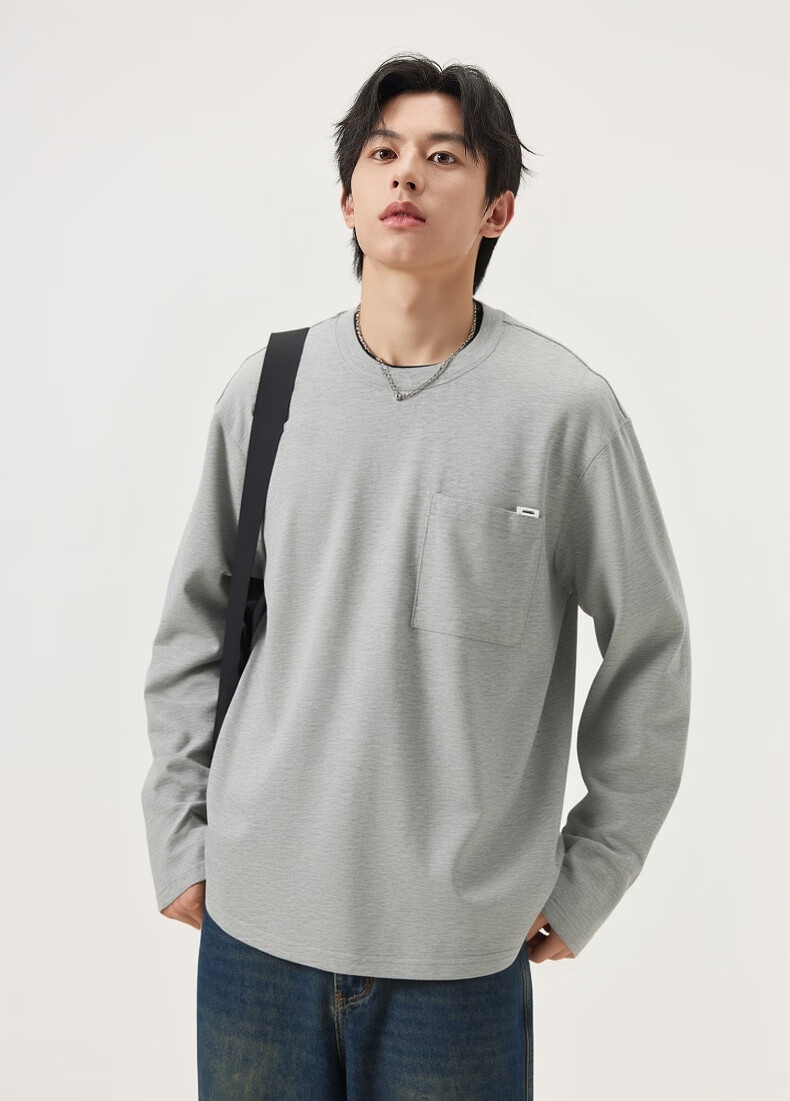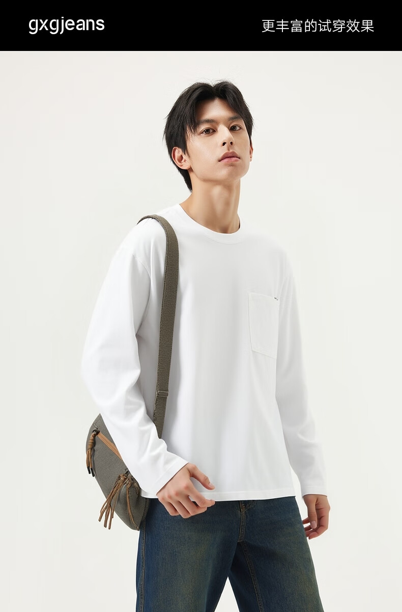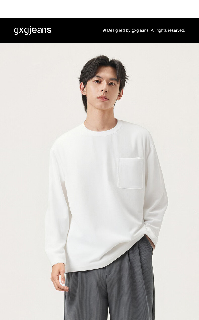 Gxgjeans men's wear thick brushed pocket design loose round neck long sleeve T-shirt for men 25 autumn and winter hot sale white spring and autumn style L (175)