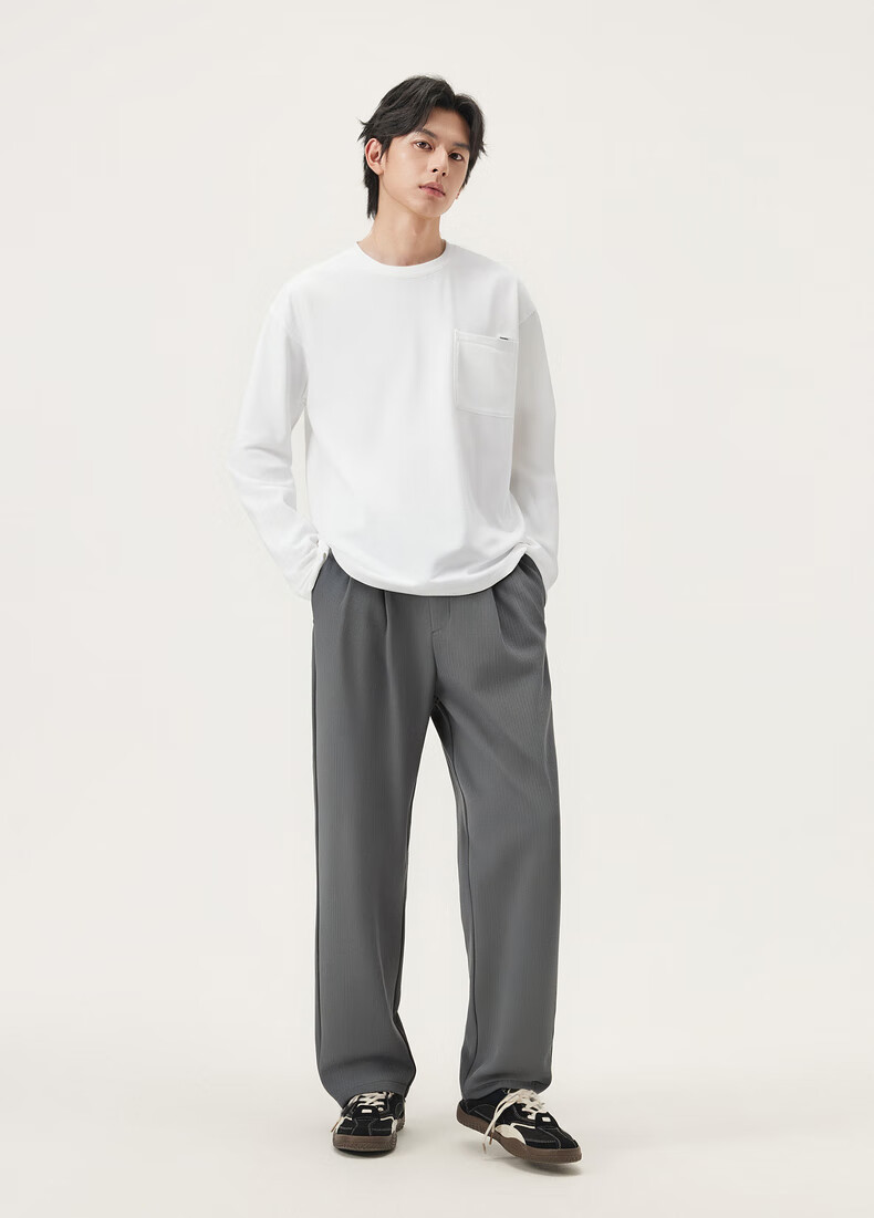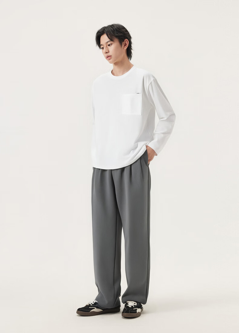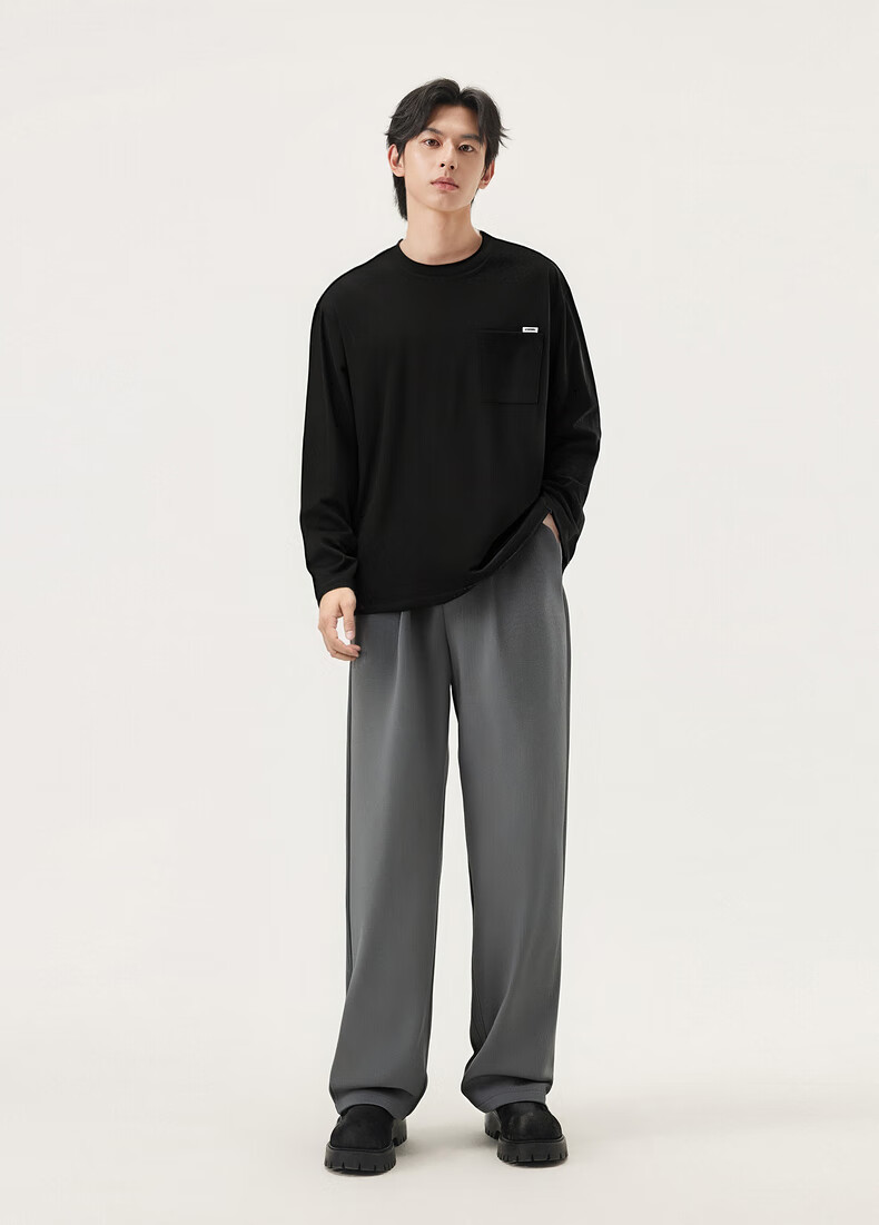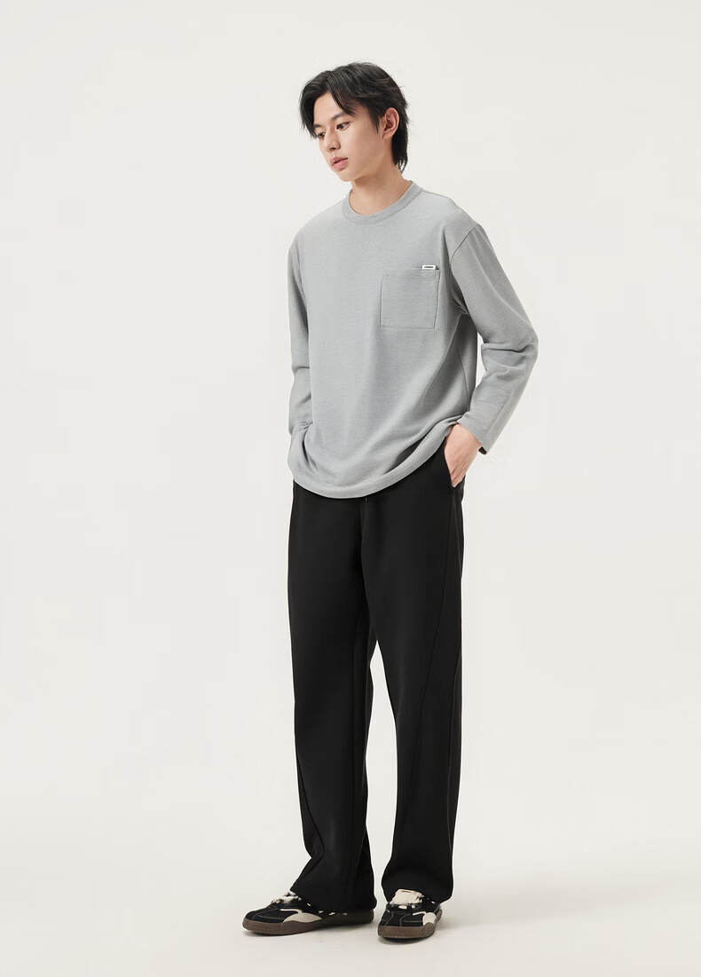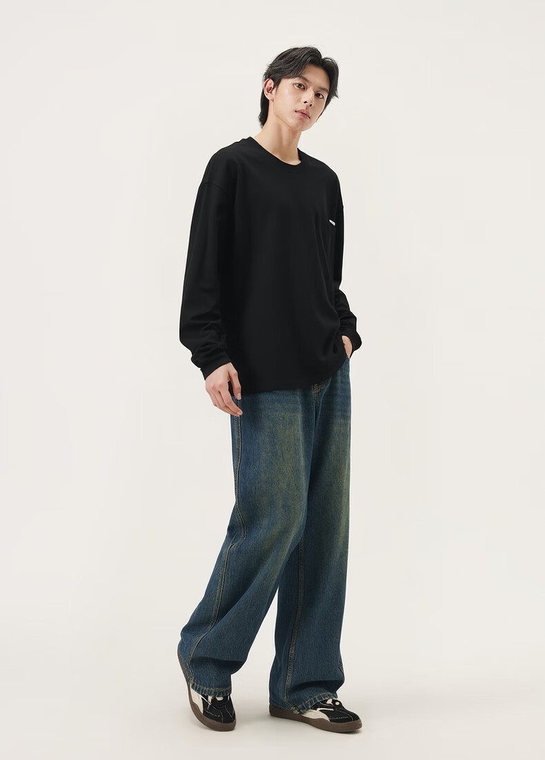 Gxgjeans men's wear thick brushed pocket design loose round neck long sleeve T-shirt for men 25 autumn and winter hot sale white spring and autumn style L (175)