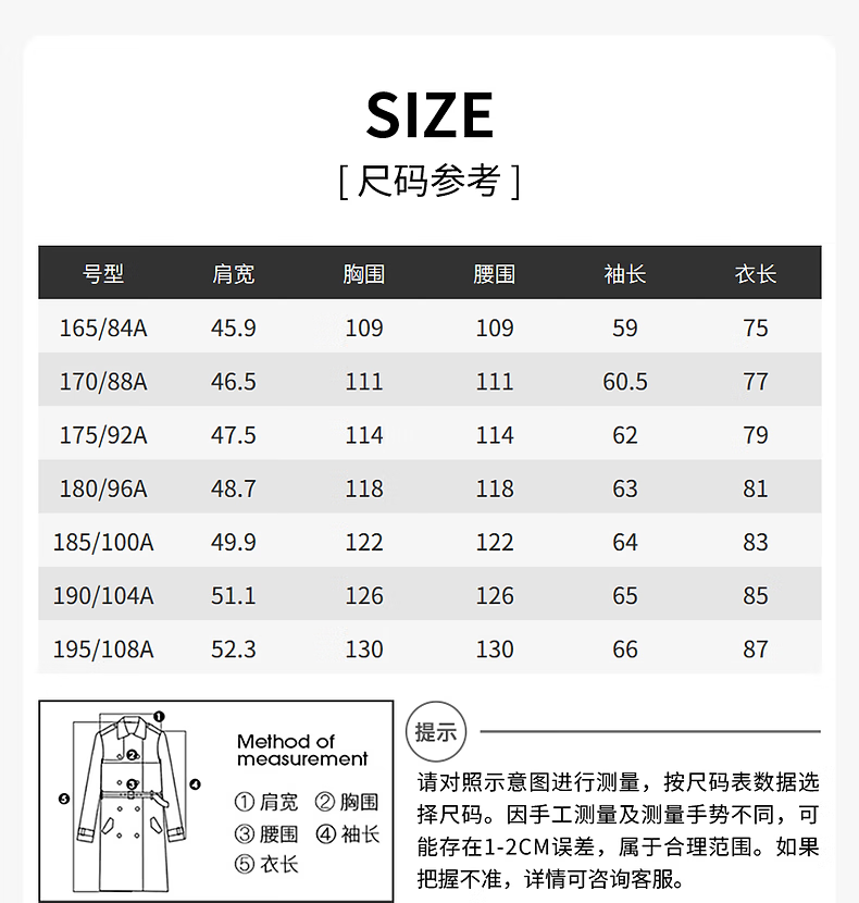 China (cm) 165 / 88-90 170 / 96-98 175 / 108-110 180 / 118-122 185 / 126-130