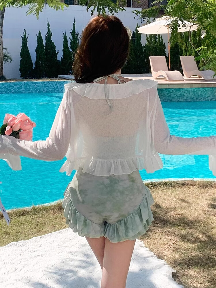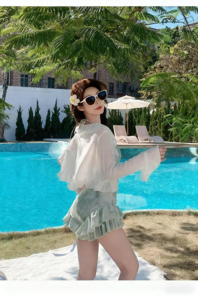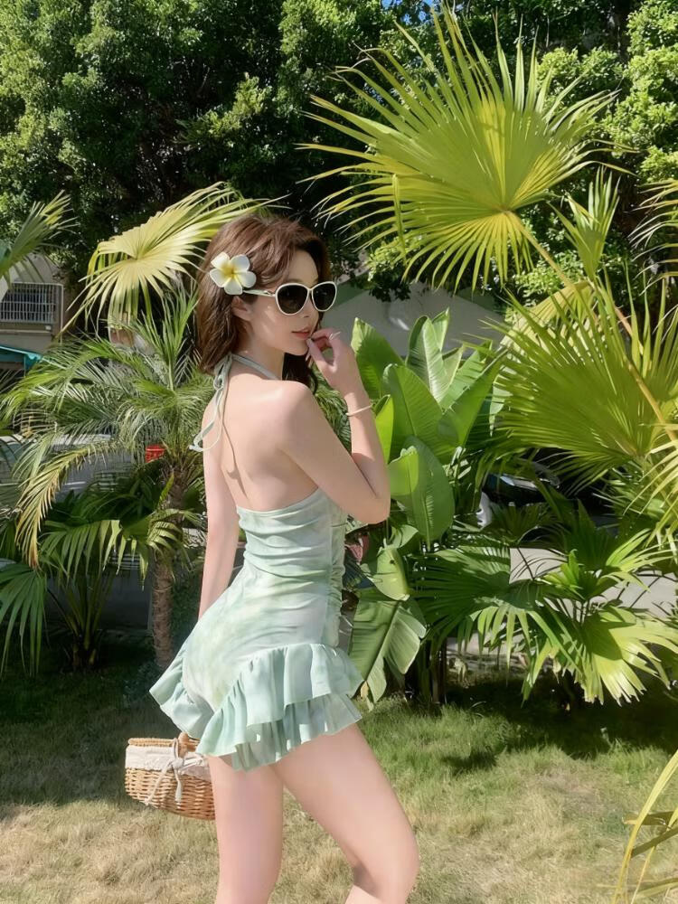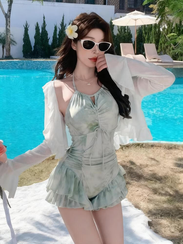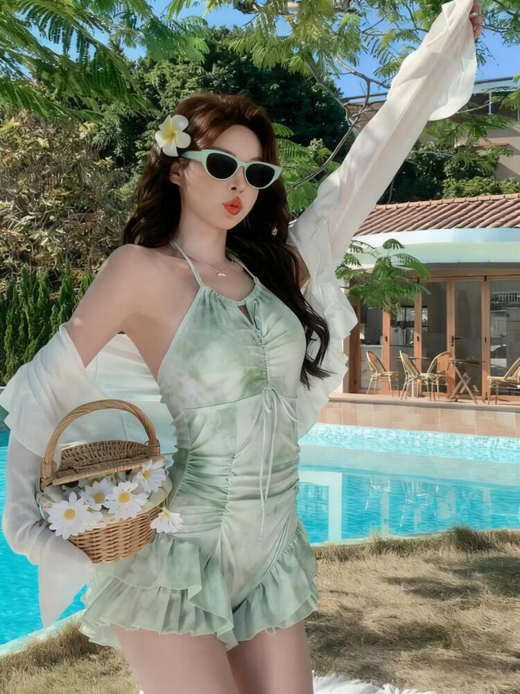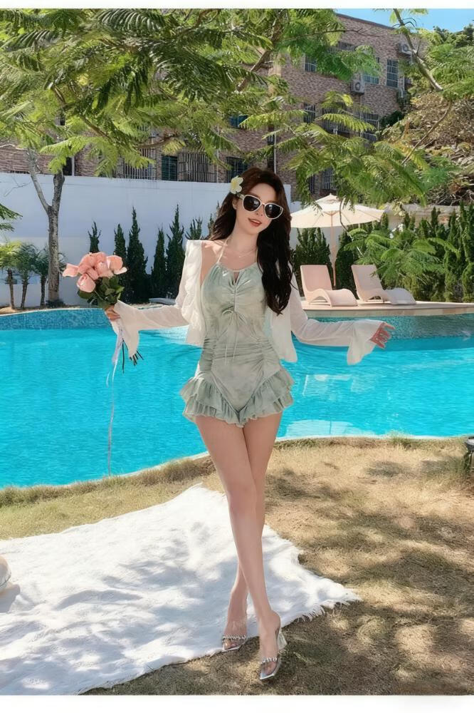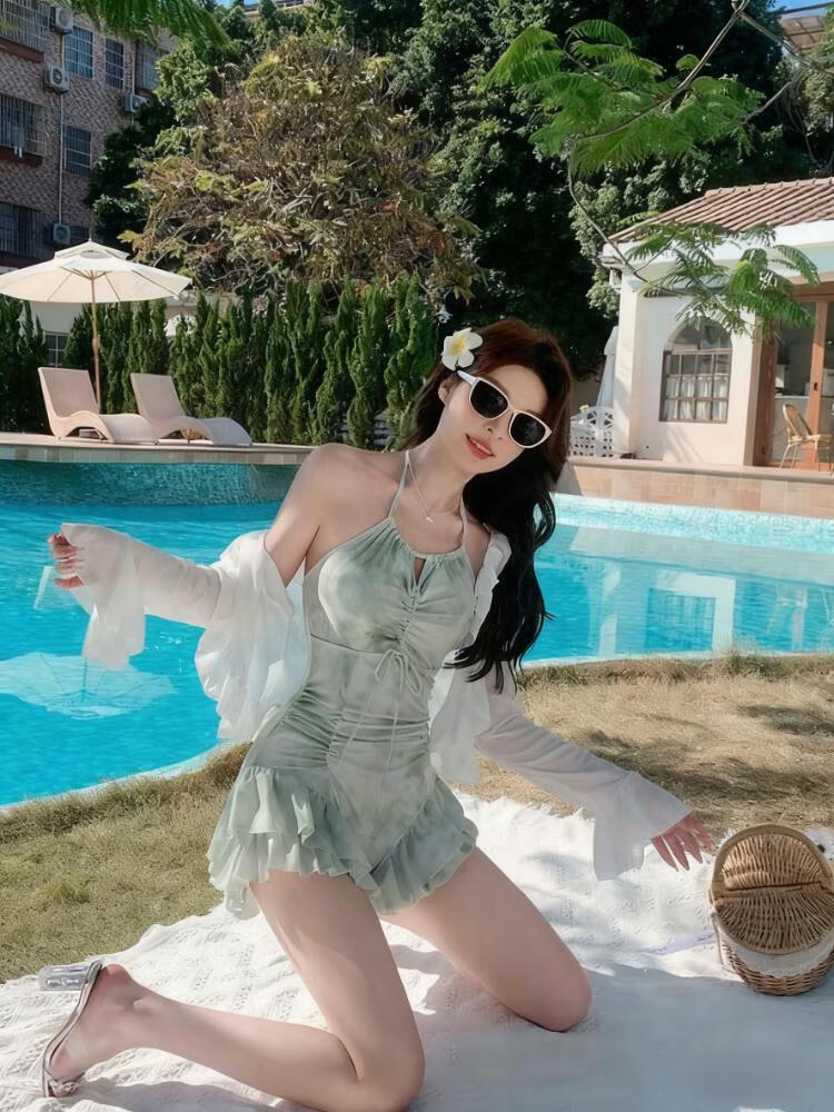 Bo Naling swimsuit women's one-piece suspender long-sleeved blouse conservative belly-covering hot spring sexy swimsuit high-end resort swimwear swimsuit two-piece set green 75-115Jin Jin equals 0.5 kg