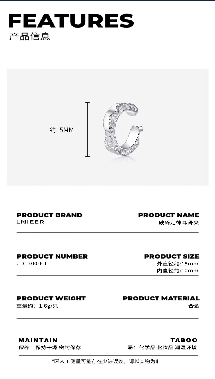 Lnieer Bai Jingting's same ear clip for men without pierced ears, niche light luxury high-end silver earrings for men and women, broken law ear clip, single