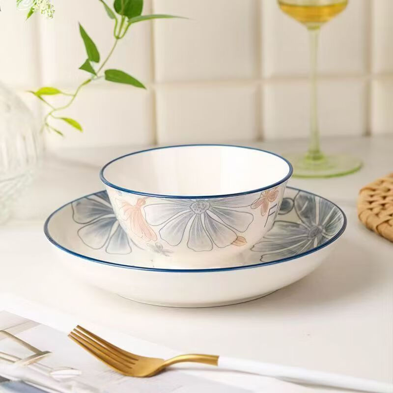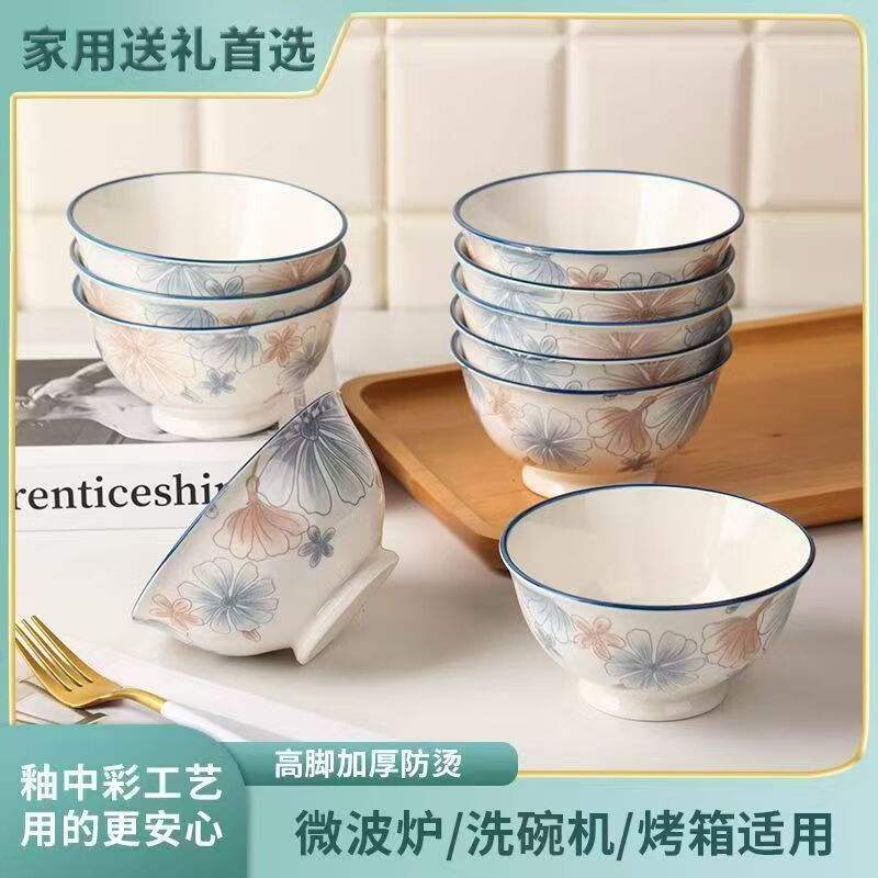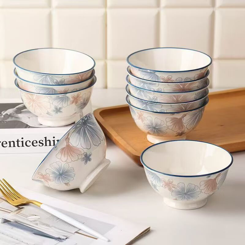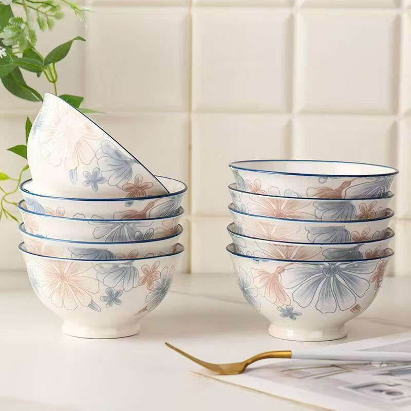 European-style high-looking 4.5-inch household ceramic rice bowl with underglaze color 4.5-inch large brown flower salad bowl 2 pieces