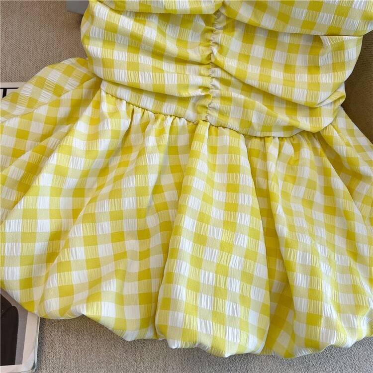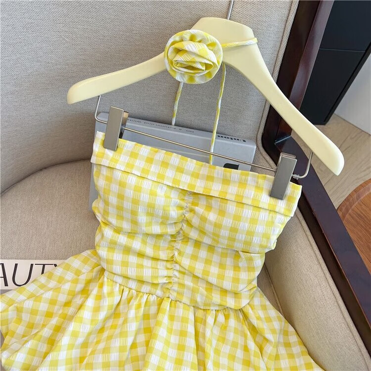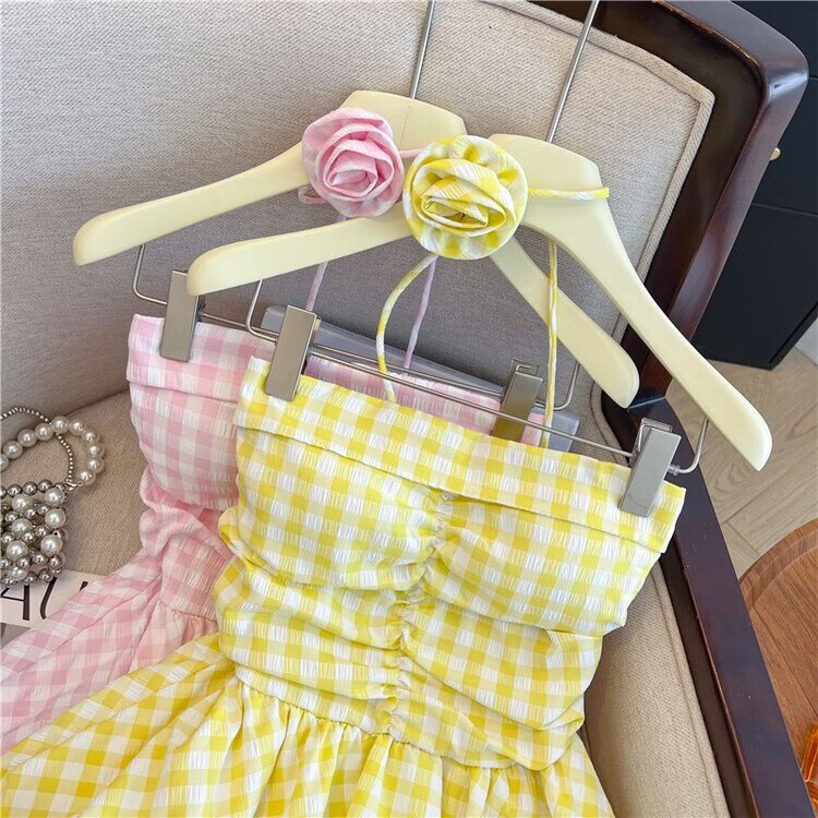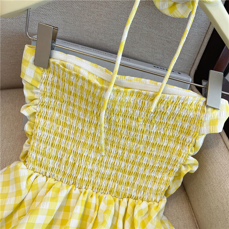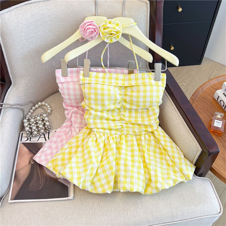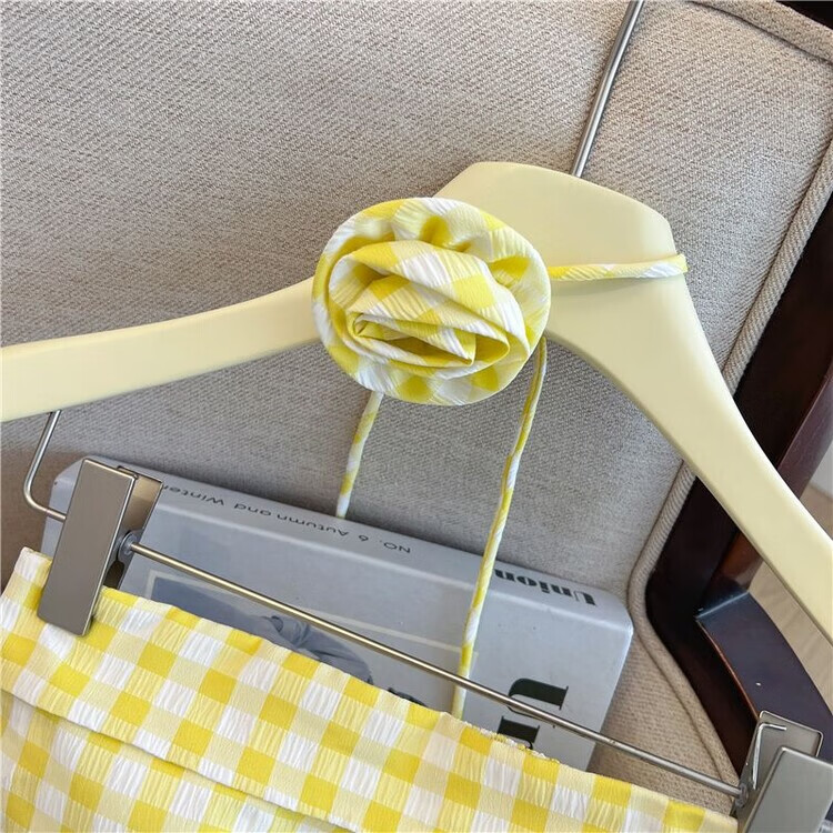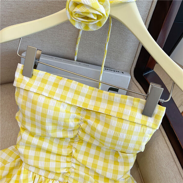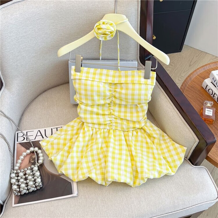 Banfishi sweet pink plaid tube top for women's summer outer wear three-dimensional flower ribbon halter neck wrap skirt small top yellow S