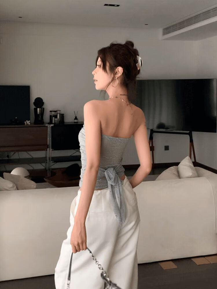 Banffish gray tube top for women, summer temperament, small sexy hot girl, slim, tight, versatile short off-shoulder top, gray S 80-90