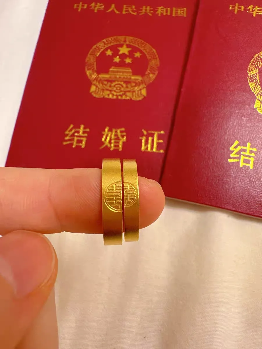 Fat Donglai has the same gold pair of rings for couples. My family has a yellow l gold color wedding ring with the word "Happy" in Chinese romantic ancient style. The ring with the word "Happiness" - women's model with an open opening and an adjustable opening.