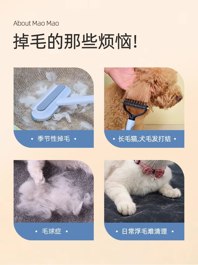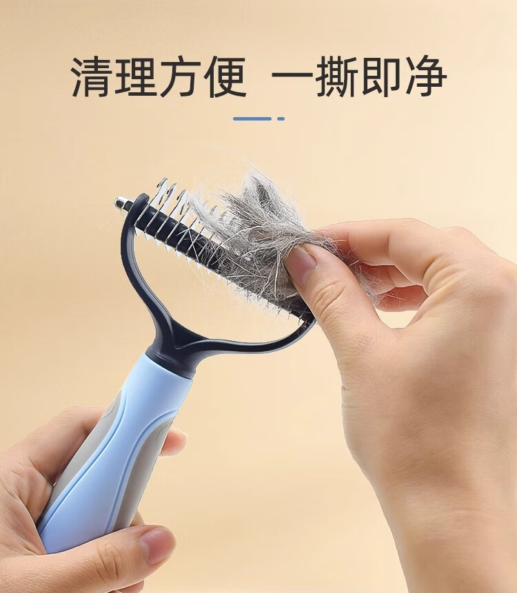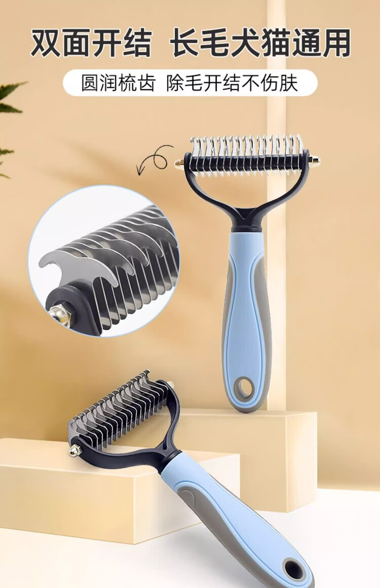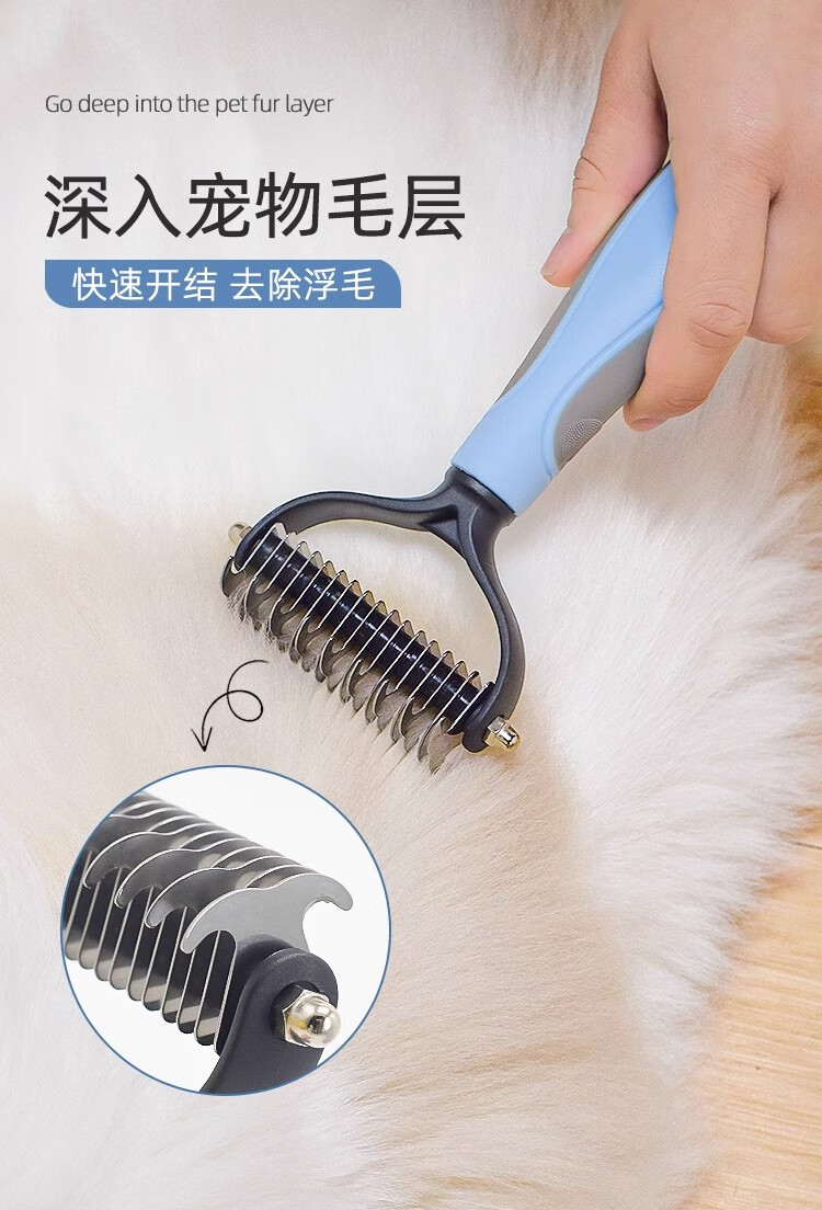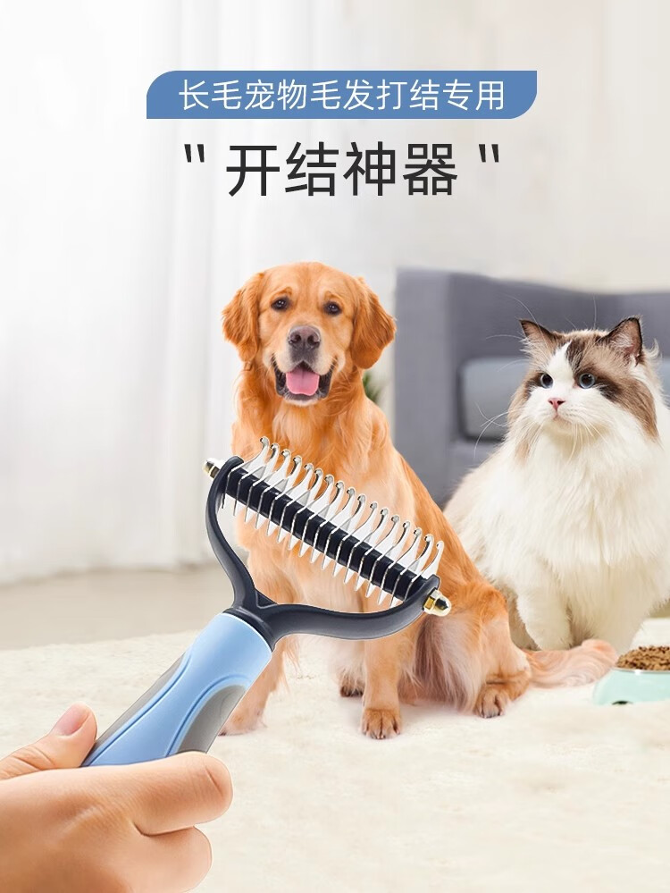 Pet knot-opening and combing cat and dog hair, thinning and removing floating hair, long-haired cat and dog comb, combing Bichon-shaped shaver, blue plus large size - stainless steel sparse-dense double-tooth comb, knot-free hair removal, one comb is done
