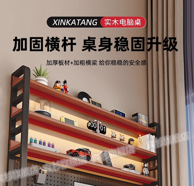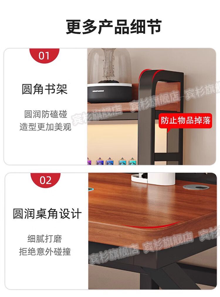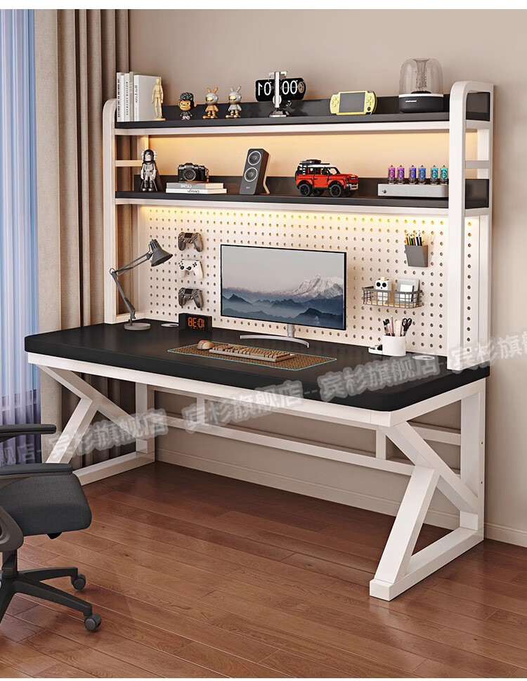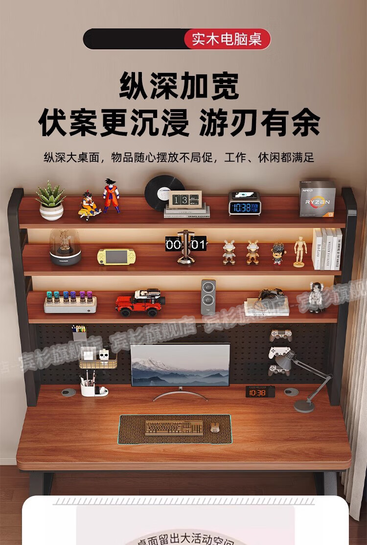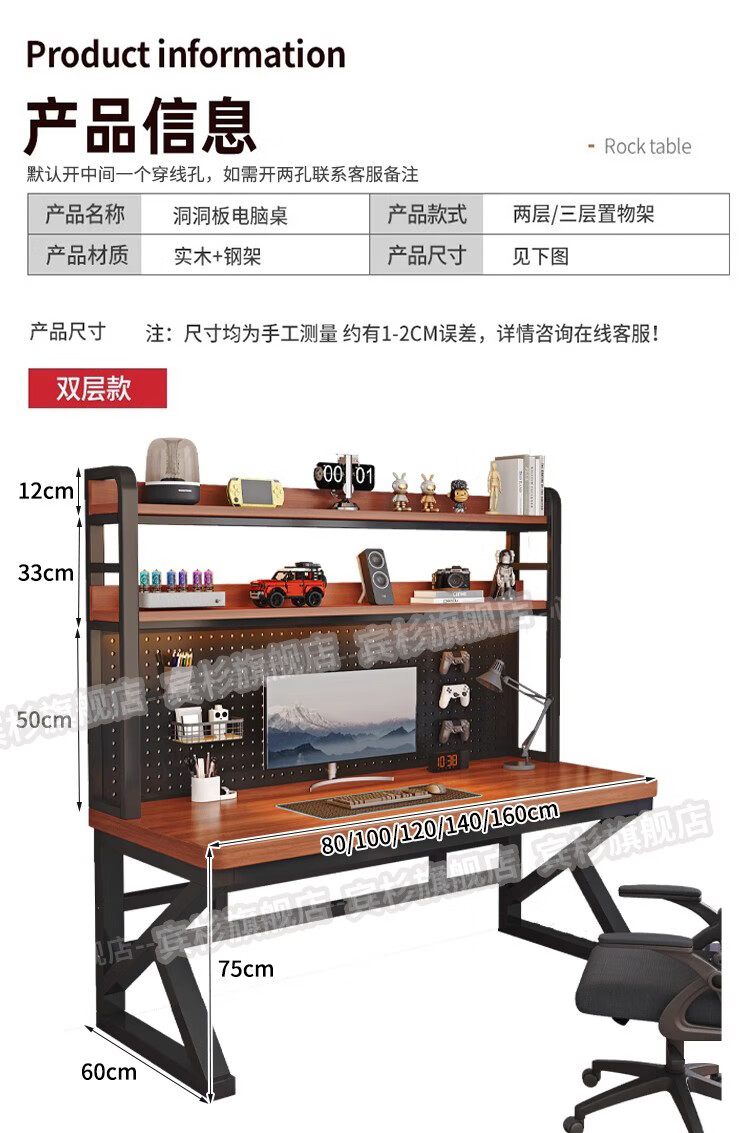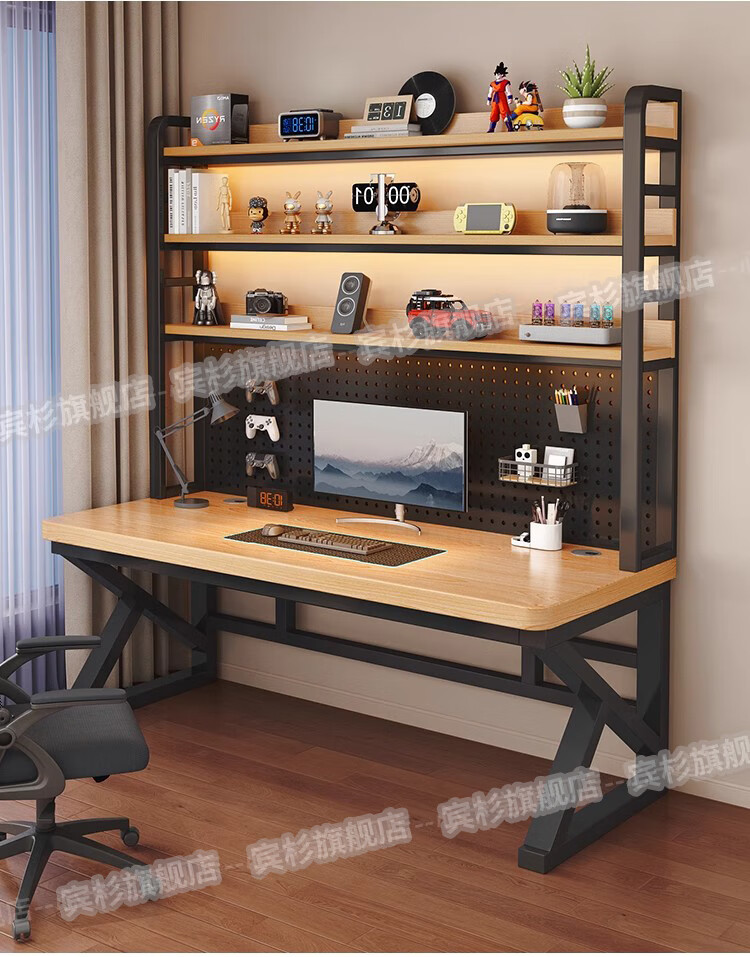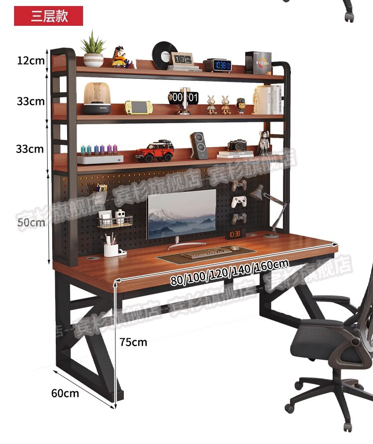 Binshan computer desk desk bookshelf integrated solid wood study table hole board e-sports table desktop desk workbench two layers + black walnut color + black shelf 80*50*75 (50mm solid wood)