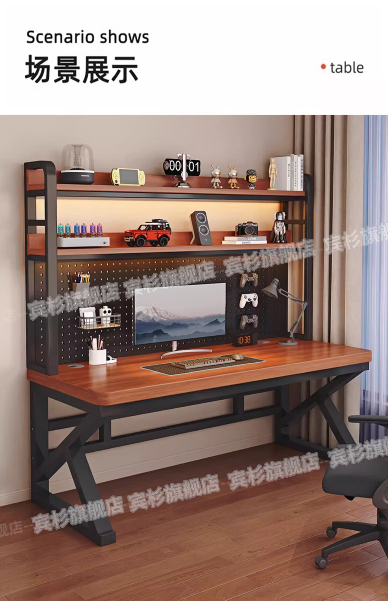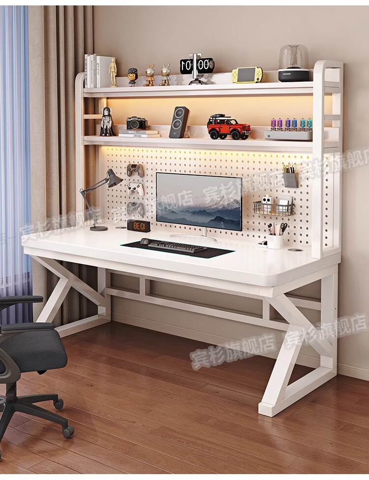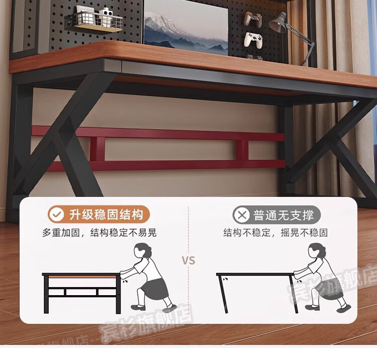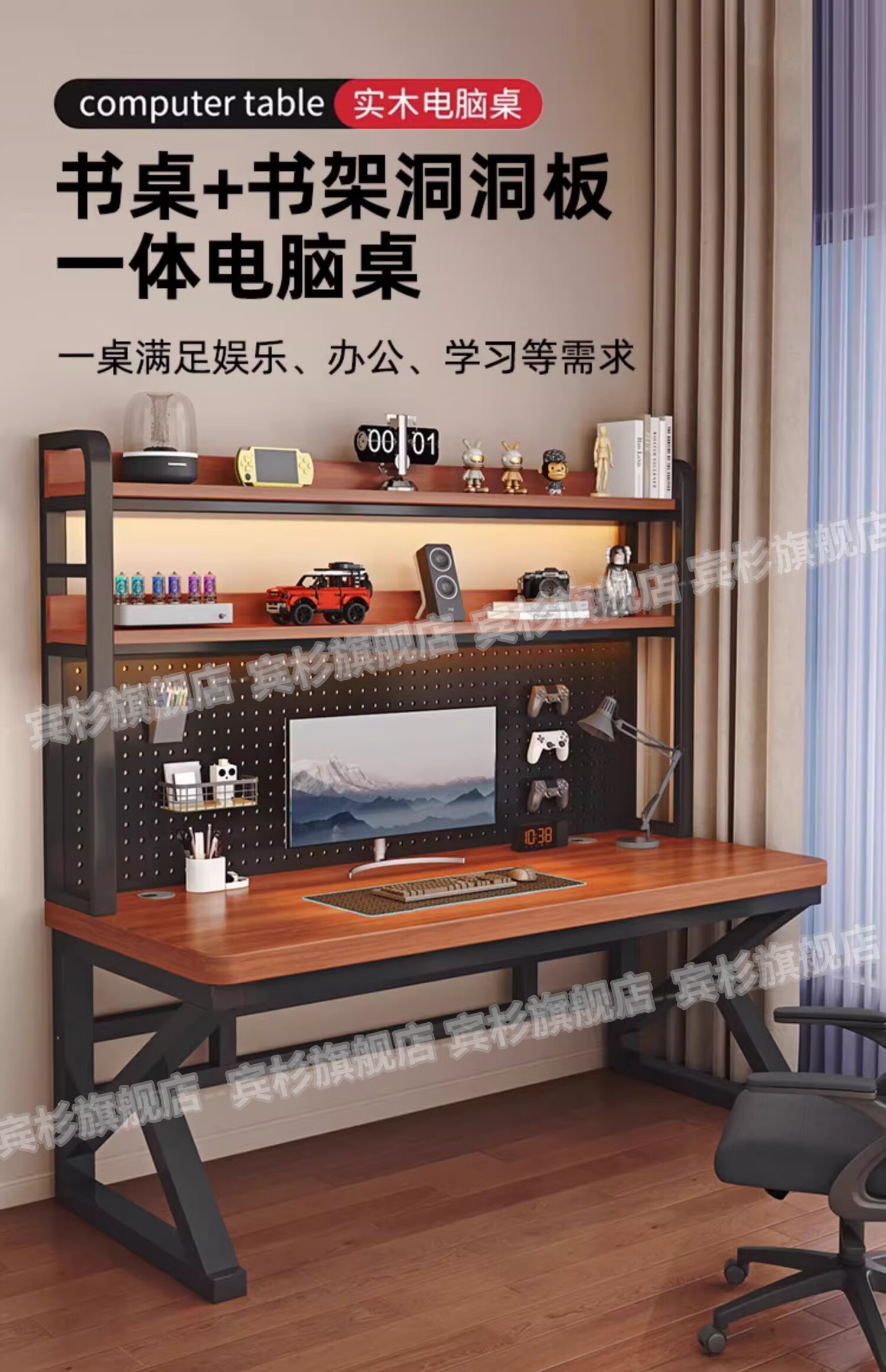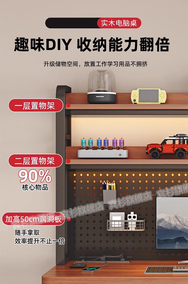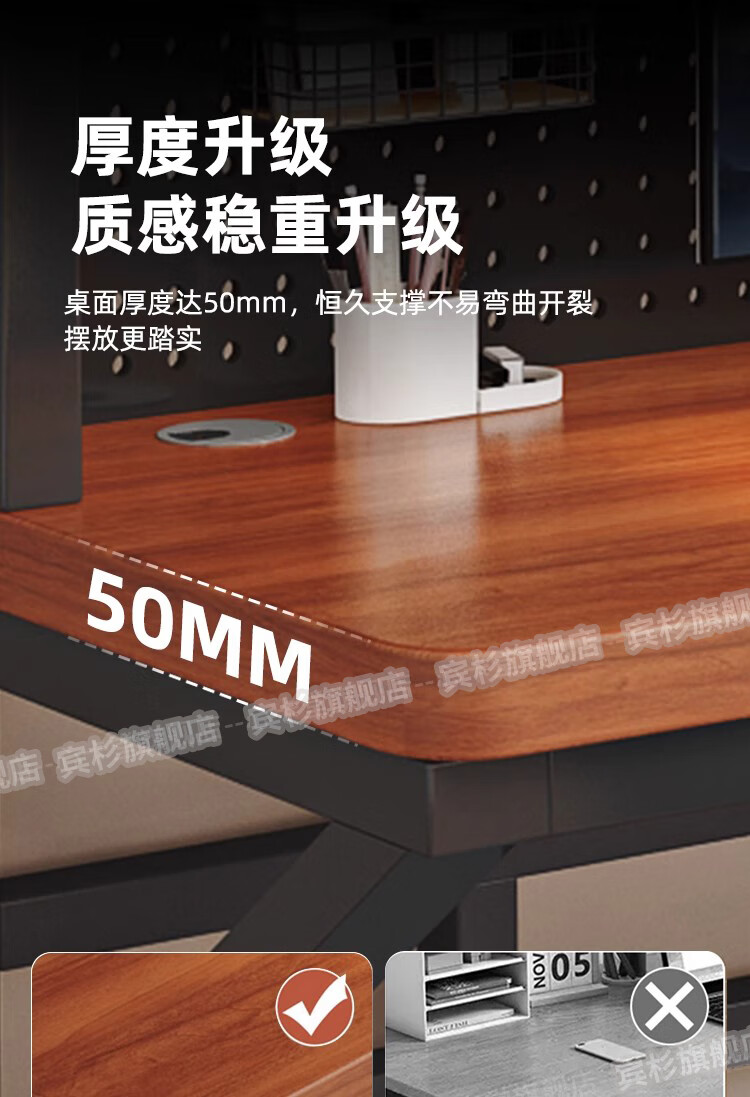 Binshan computer desk desk bookshelf integrated solid wood study table hole board e-sports table desktop desk workbench two layers + black walnut color + black shelf 80*50*75 (50mm solid wood)