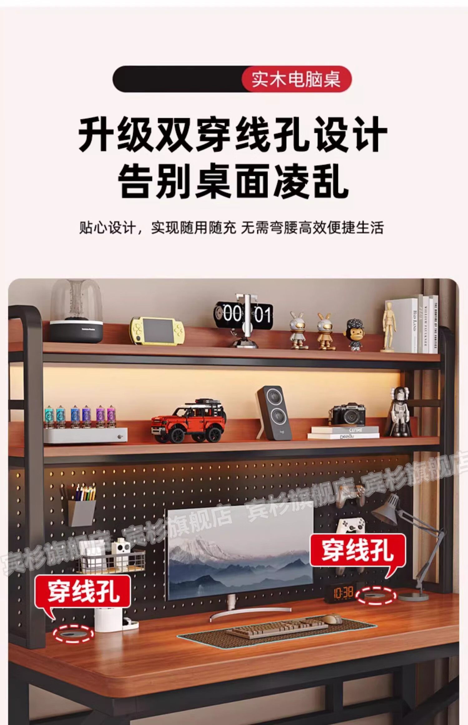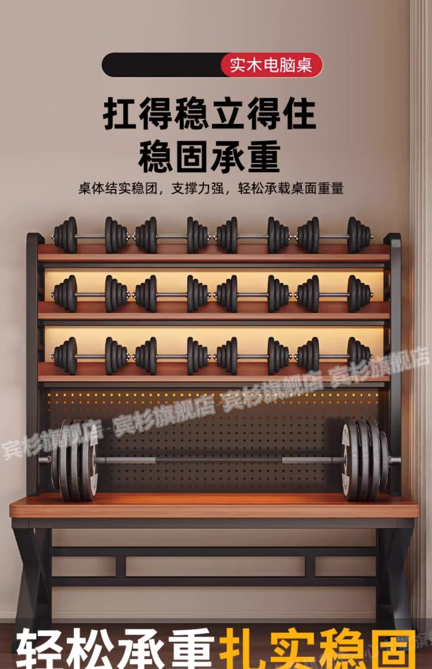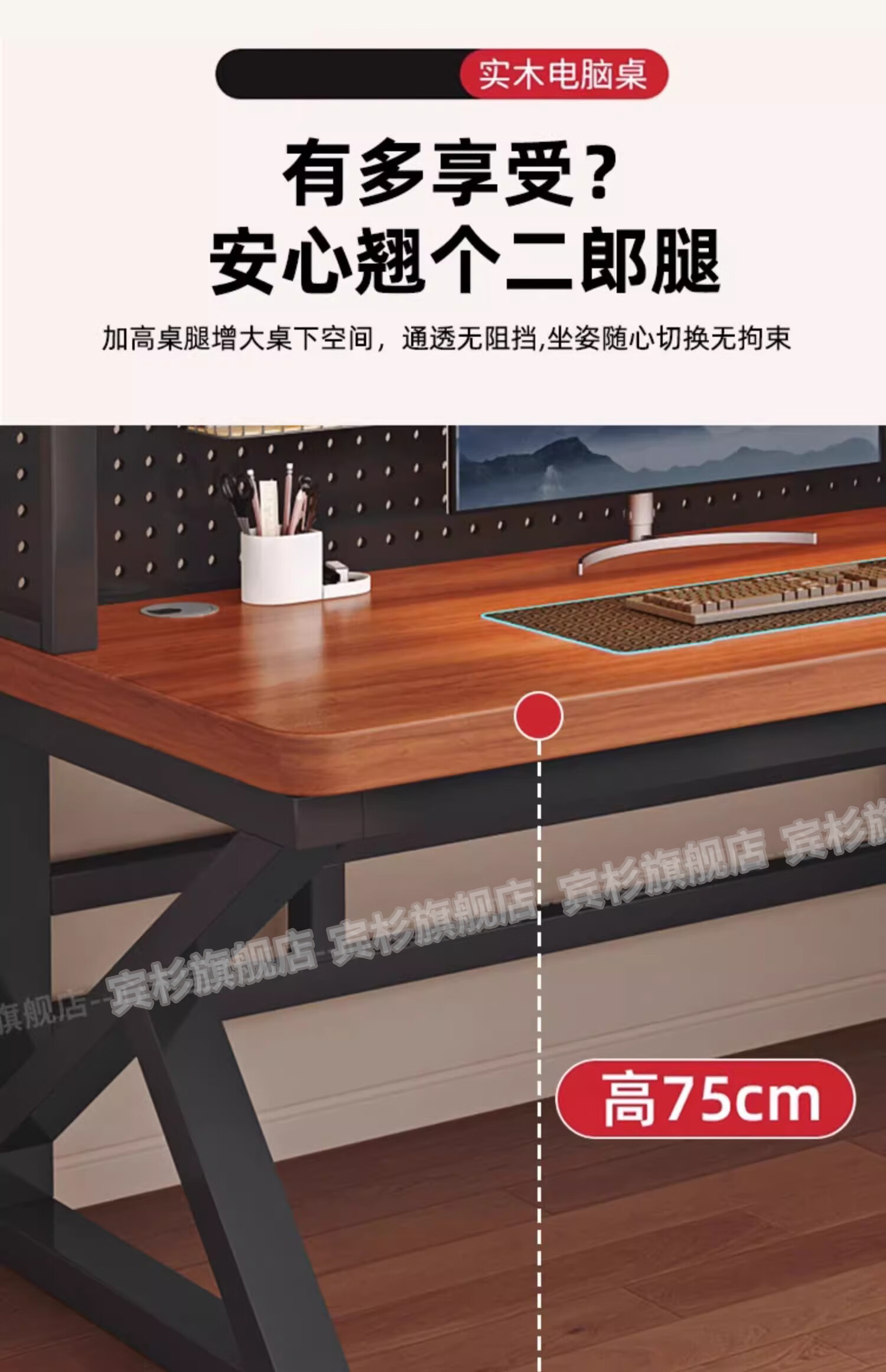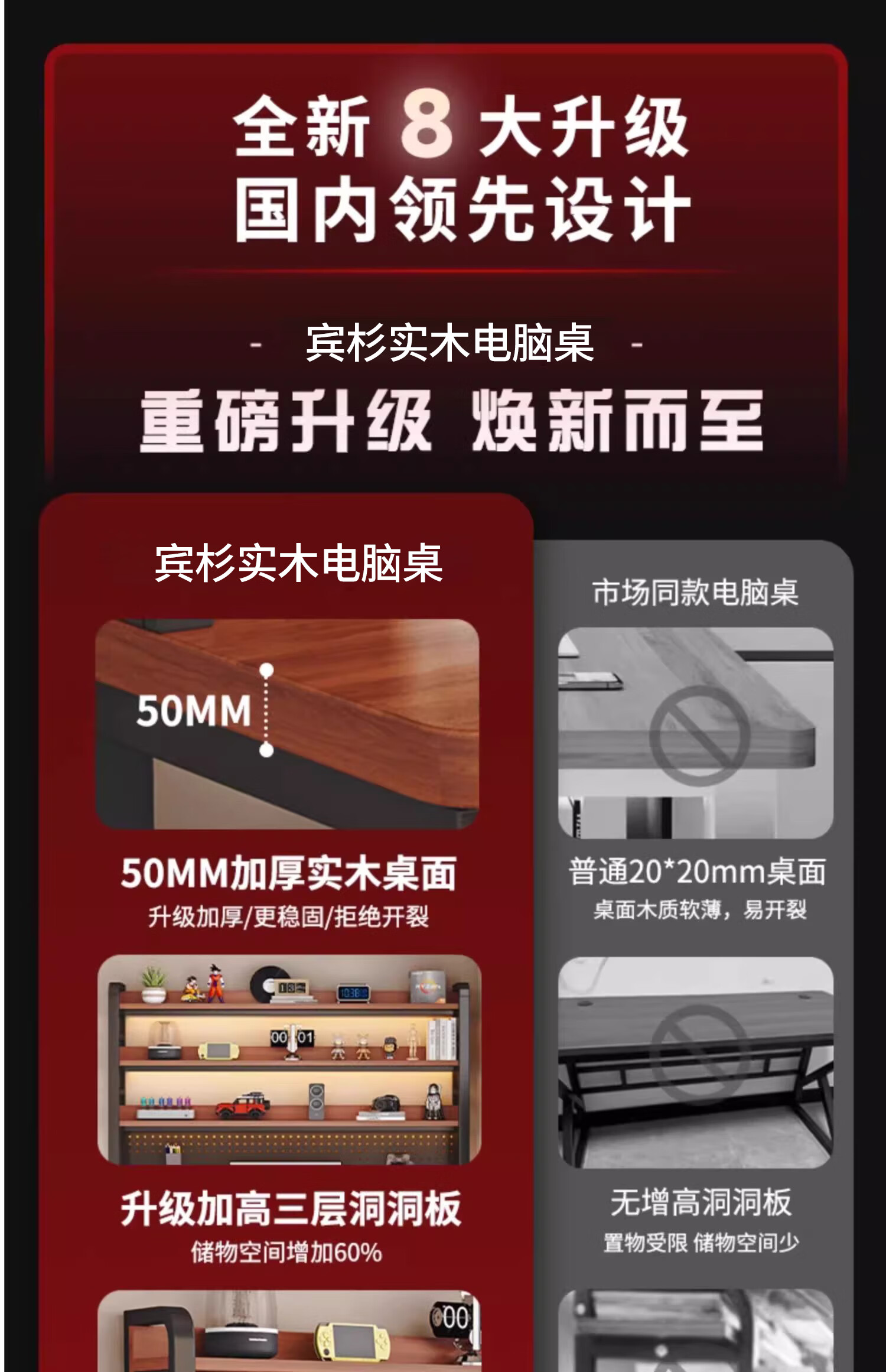 Binshan computer desk desk bookshelf integrated solid wood study table hole board e-sports table desktop desk workbench two layers + black walnut color + black shelf 80*50*75 (50mm solid wood)
