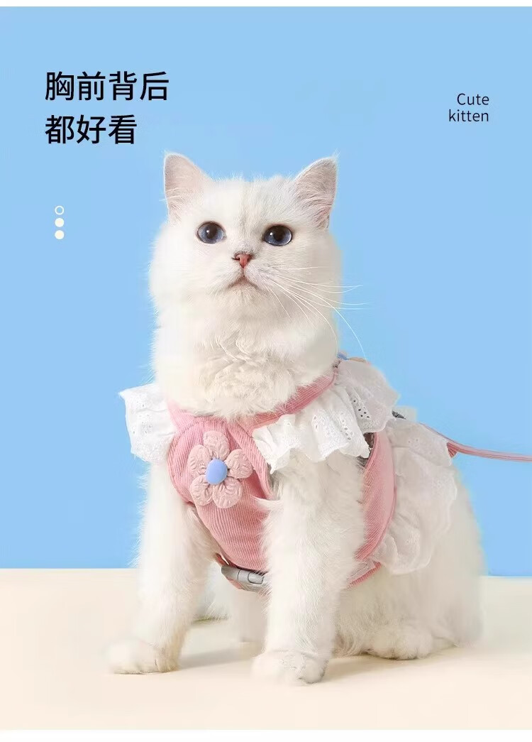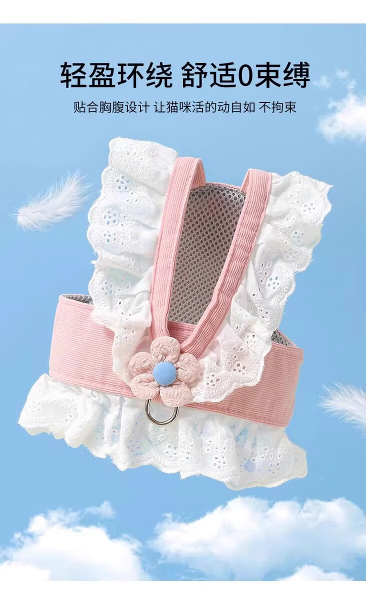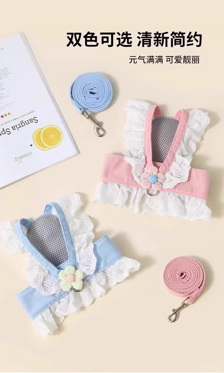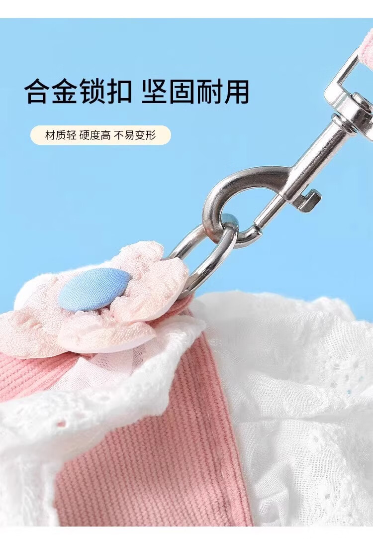 Amor's new dog leash, cute little flower skirt, breathable harness, Teddy Pomeranian pet cat, for summer outing, denim pink, Korean style, small flower harness + 1.5m rope