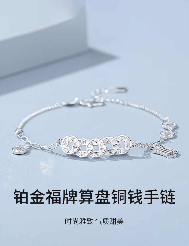 Chinese jewelry Fu brand platinum bracelet for women pt950 platinum five emperors bracelet copper coins birthday anniversary gift for girlfriend and wife platinum Fu brand copper coin bracelet + brand gift box gold weight about 6.1g
