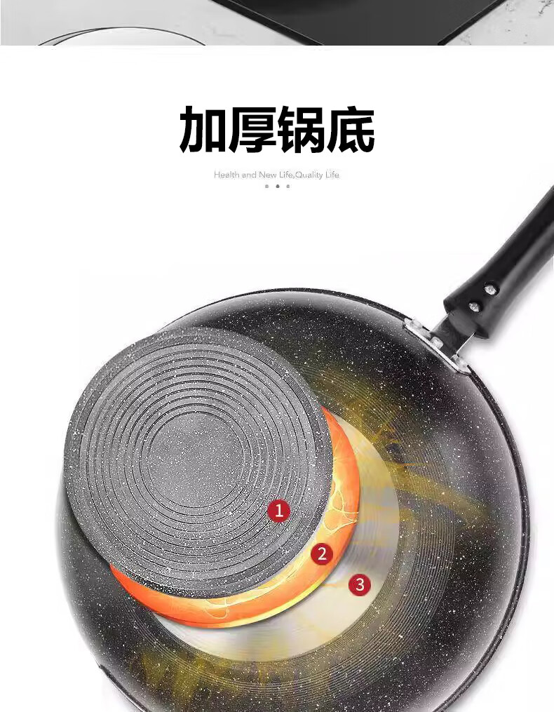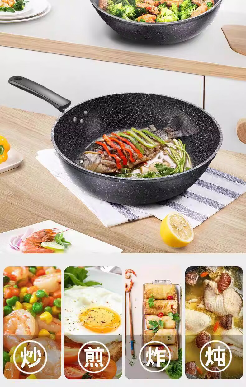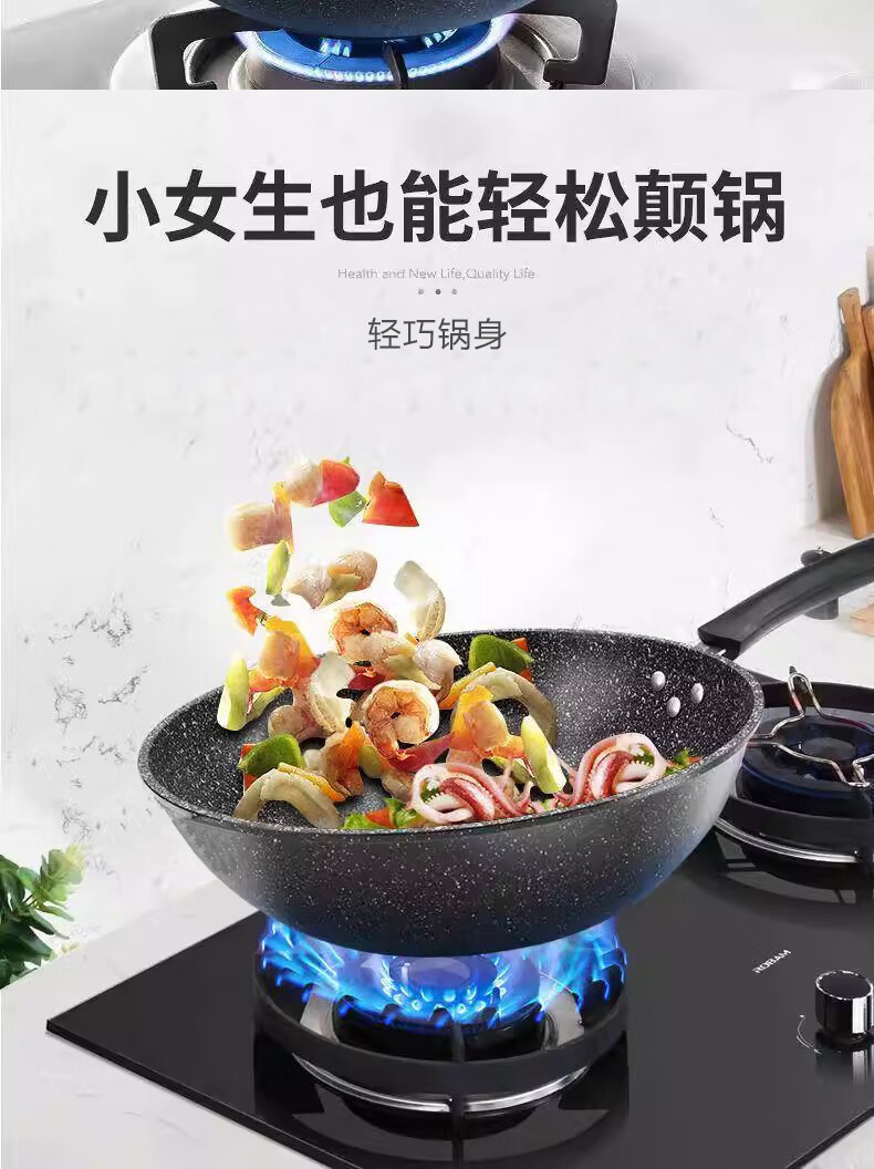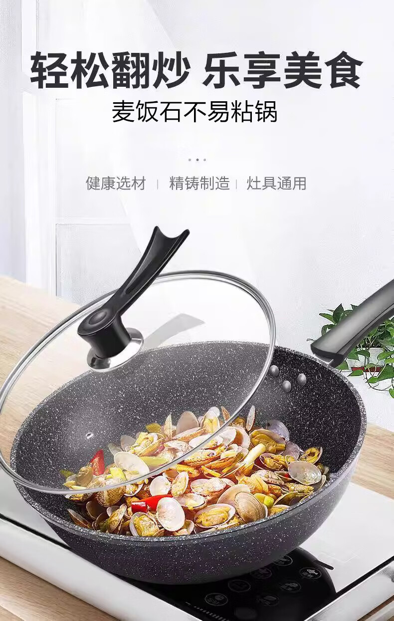 Wanjiaquan wok with lid, non-stick wheat rice stone color, induction cooker, gas stove, special frying small pot, household set, iron pot, wok + lid, free wooden spatula + sponge block 30cm