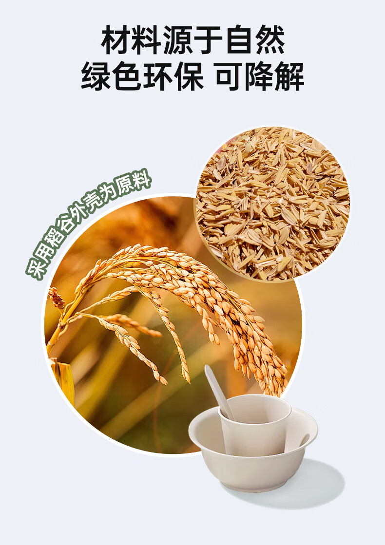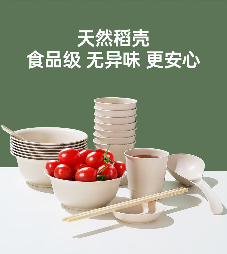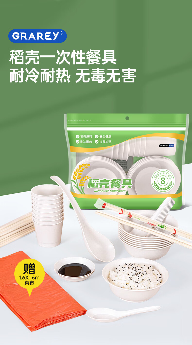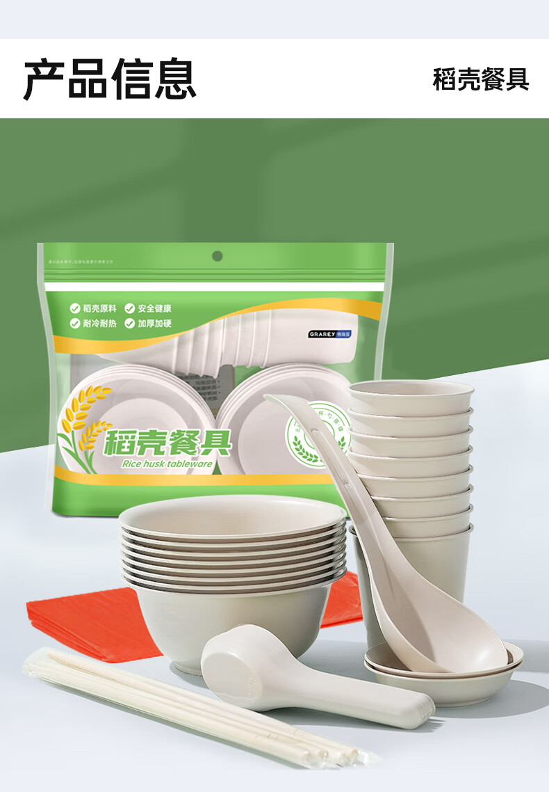 GRAREY rice husk disposable tableware bowls, chopsticks and spoon set barbecue catering banquet four-piece set food grade rice husk tableware 8 people set/bag*3 packaging