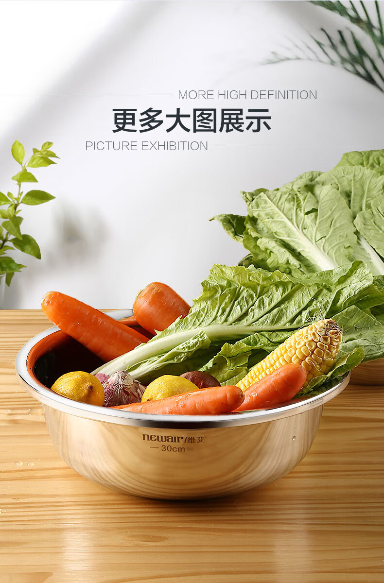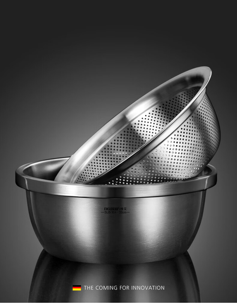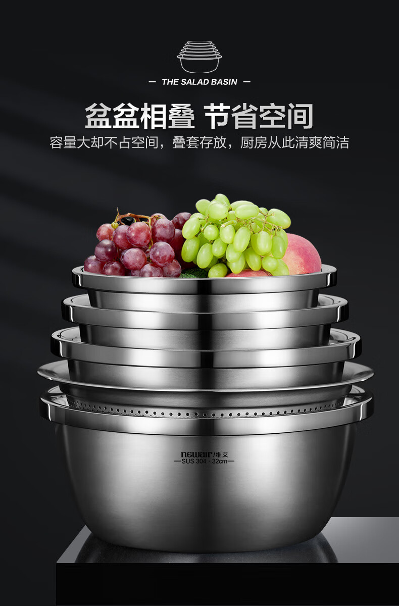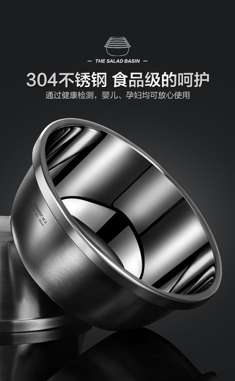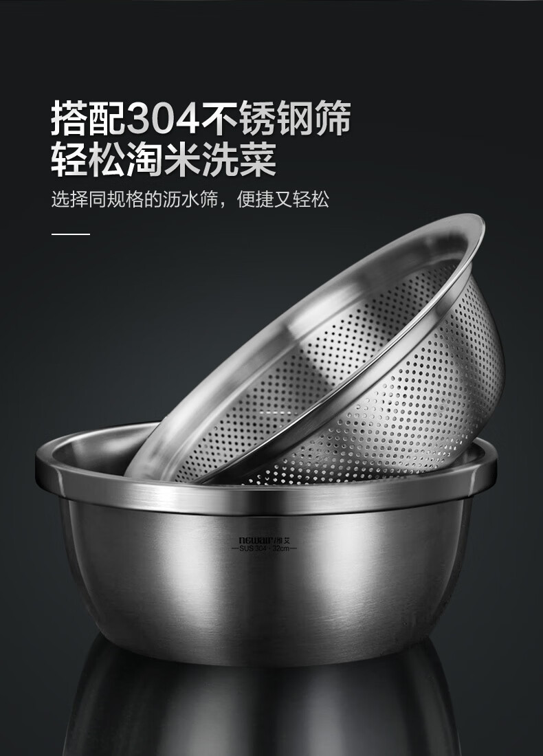 Newair Food Grade 304 Stainless Steel Basin Thickened Home Kitchen Egg Beating and Noodle Draining Basket Washing Basin Set Special Offer 304 Stainless Steel Basin 24cm