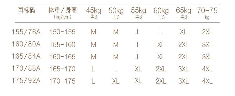 China (cm) 160-165/84-86 165-170 / 88-90 167-172 / 92-96 168-173 / 98-102 170-176 / 106-110