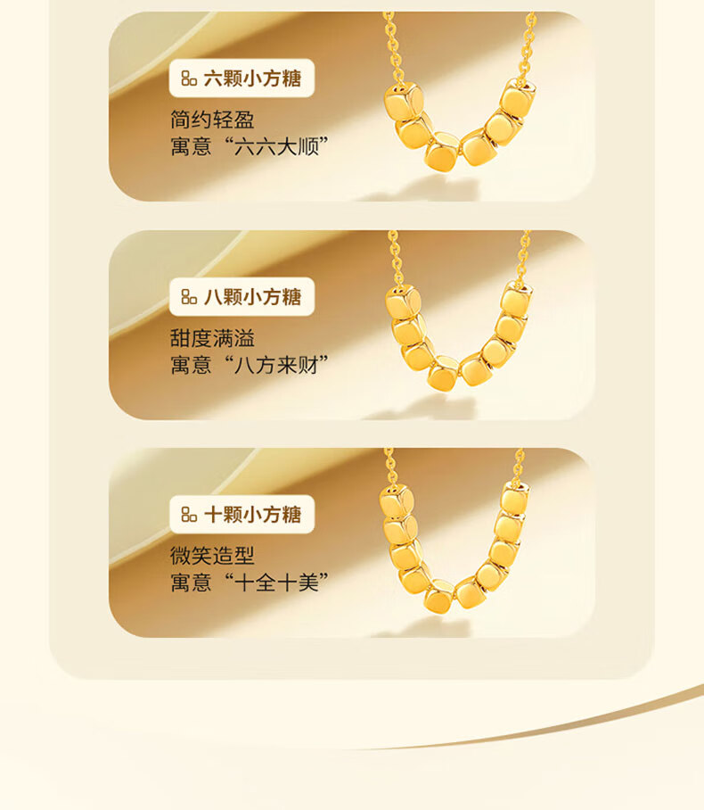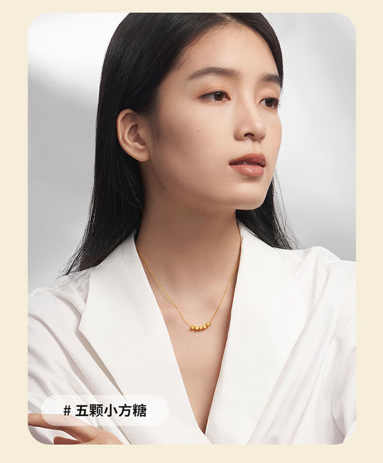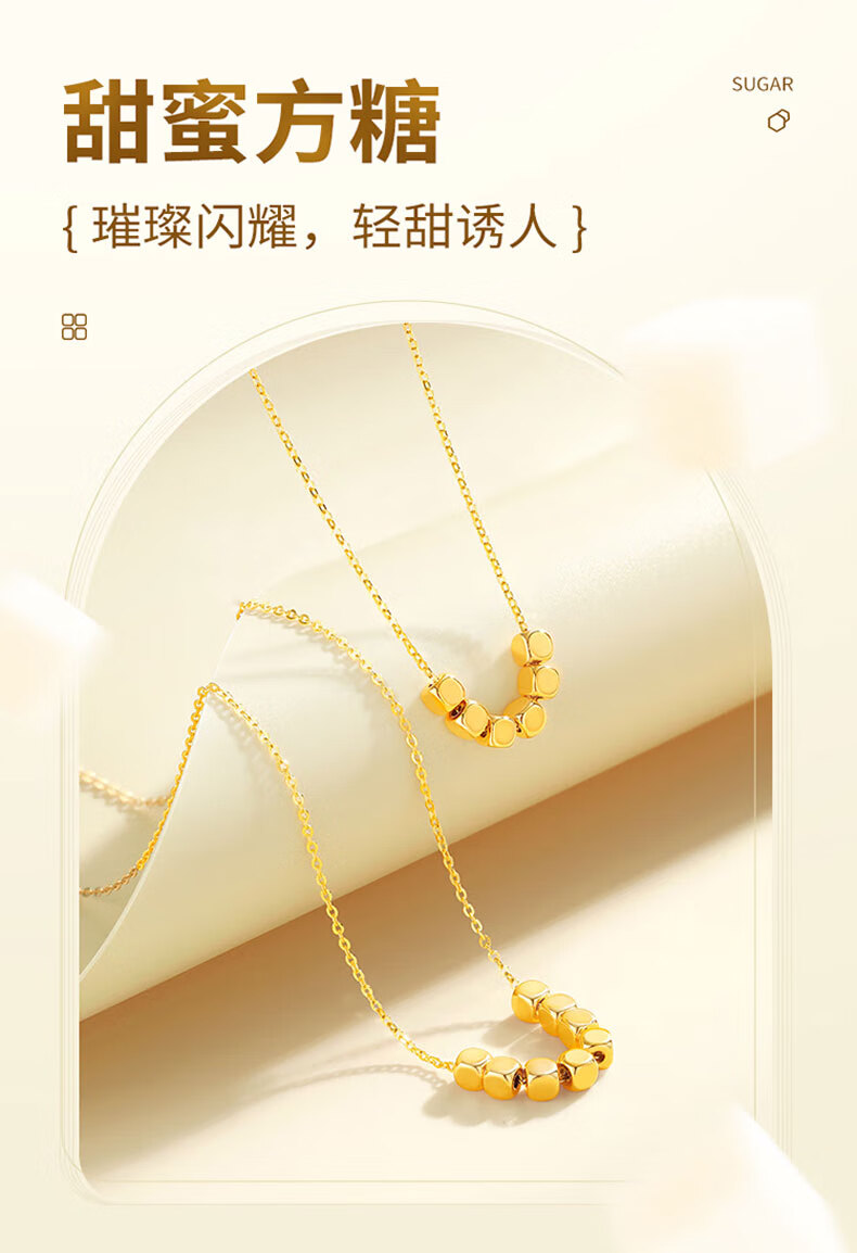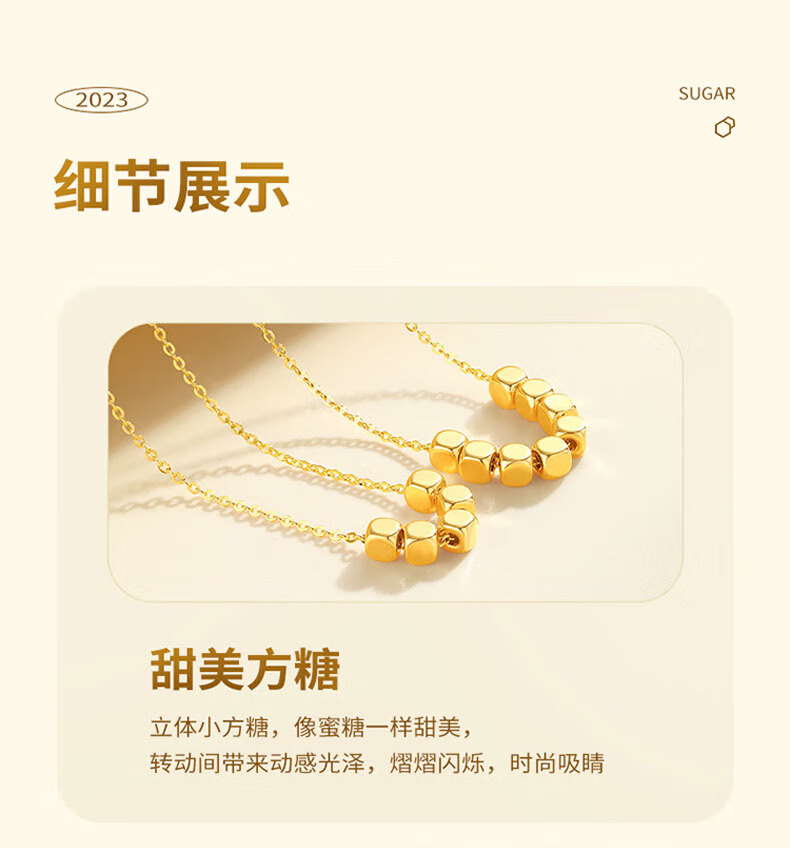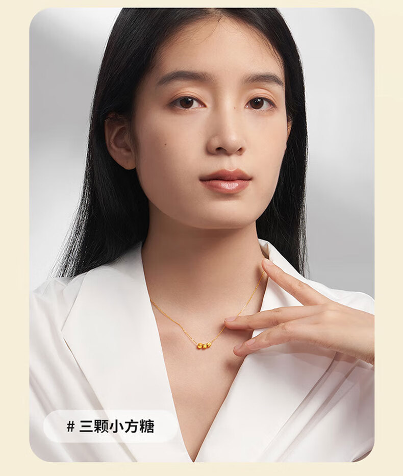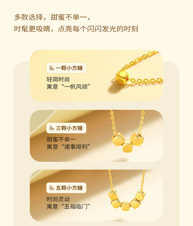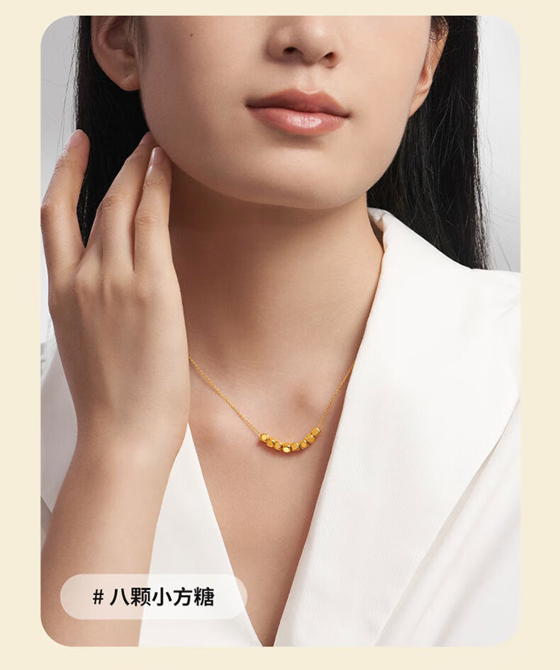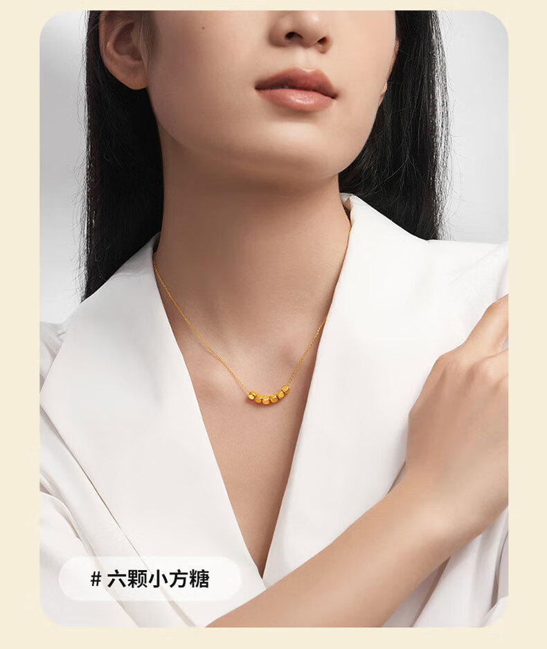 Lao Fengxiang gold small sugar cube pendant women's necklace pure gold versatile clavicle chain Valentine's Day birthday gift for girlfriend and lover three small sugar cube pendants with S925 silver chain about 0.15g