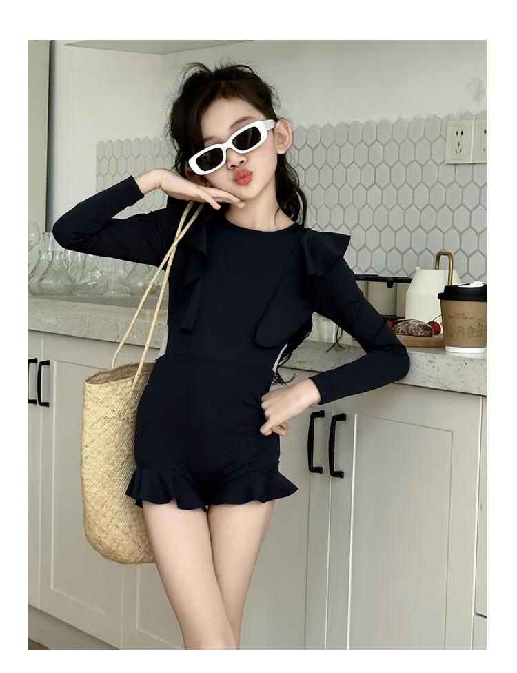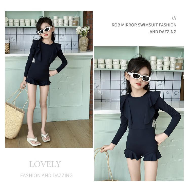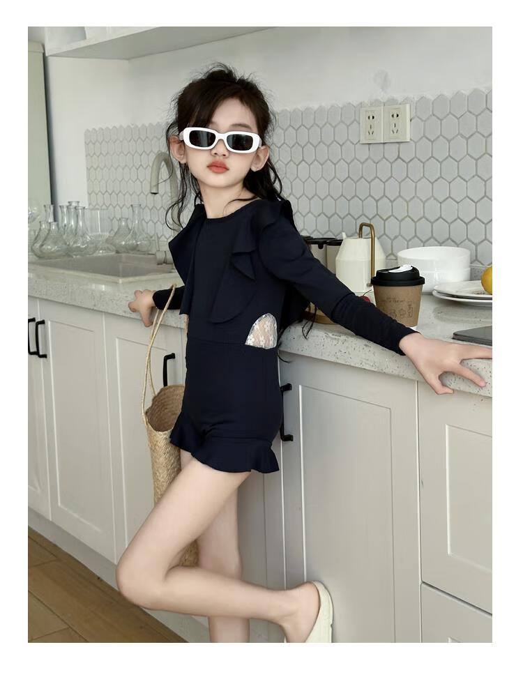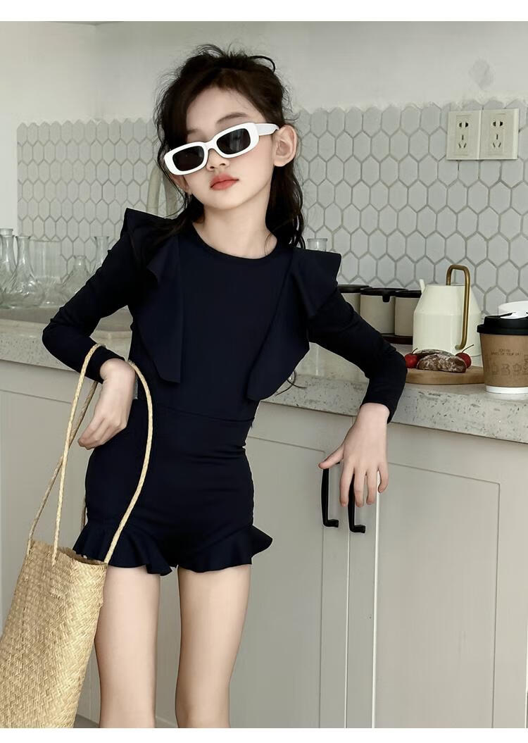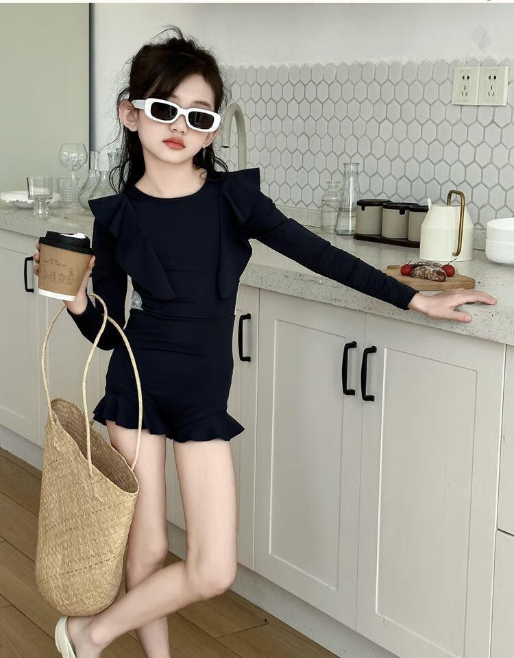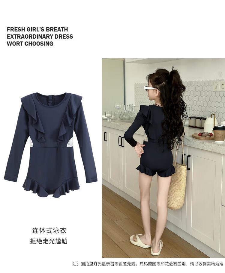 Jingyouyu children's swimsuit girls 2025 new hot spring style dress princess style junior high school student sun protection swimsuit navy blue one-piece swimsuit 120 cm