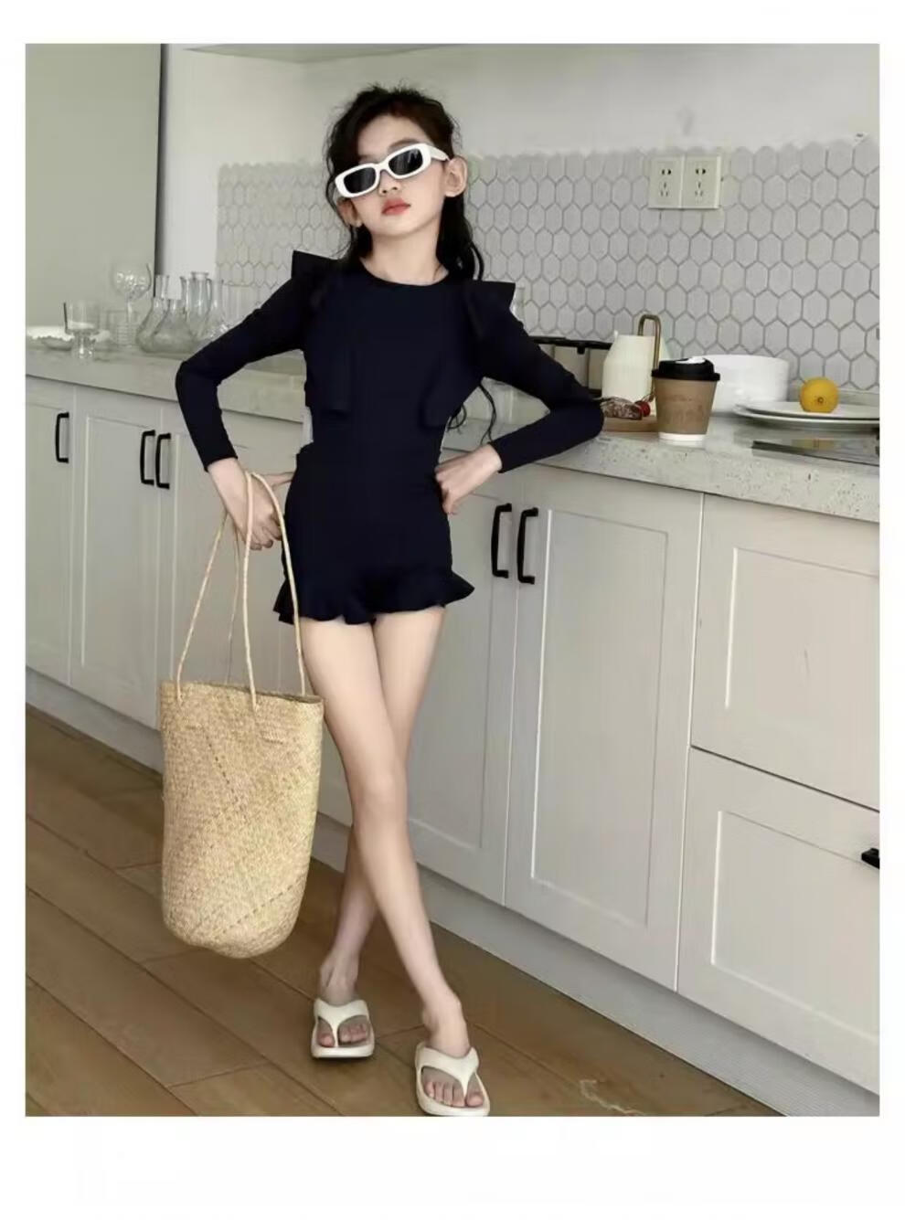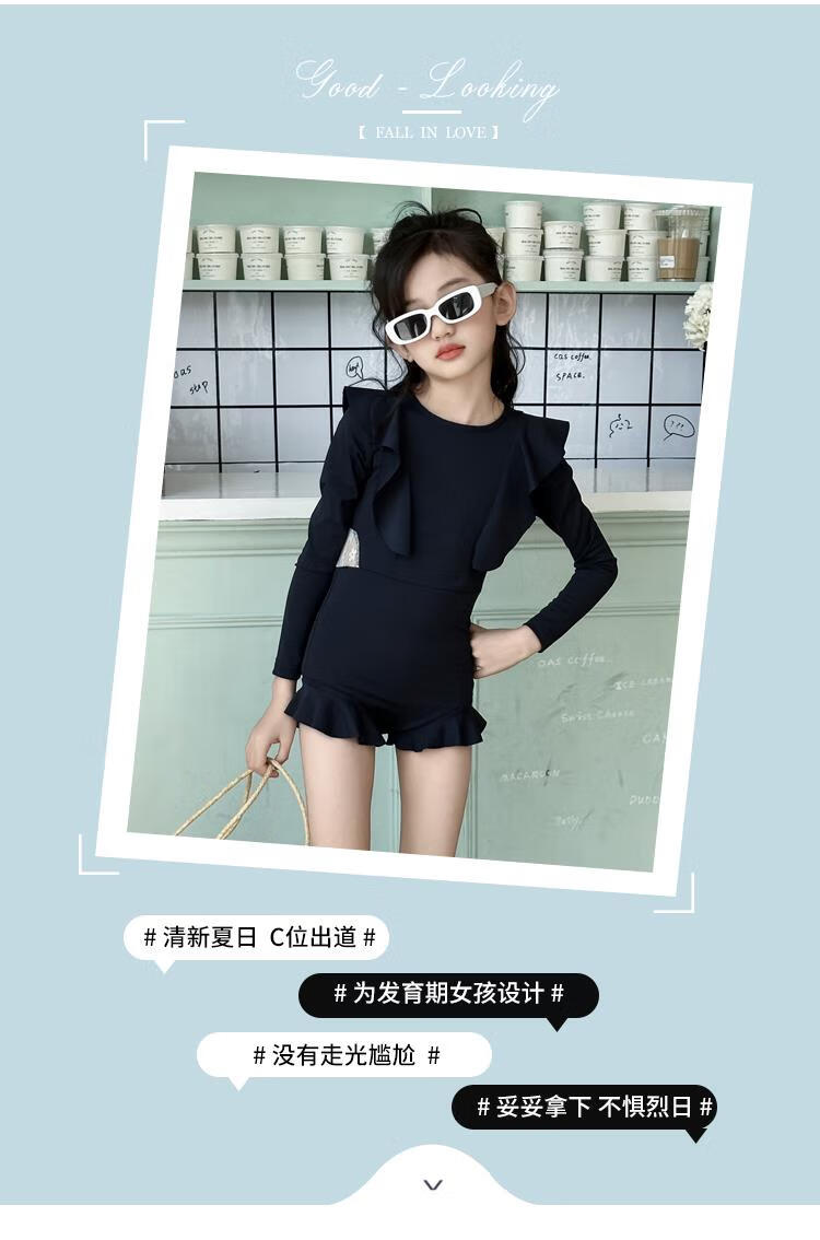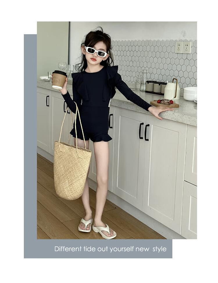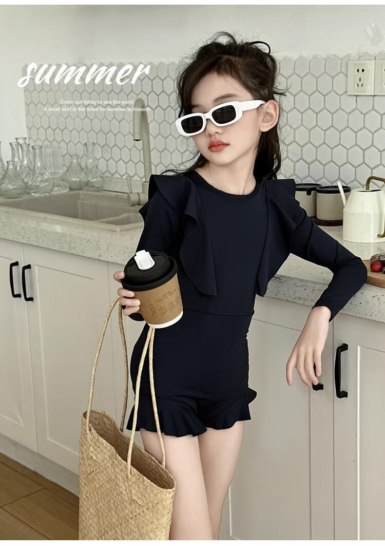 Jingyouyu children's swimsuit girls 2025 new hot spring style dress princess style junior high school student sun protection swimsuit navy blue one-piece swimsuit 120 cm