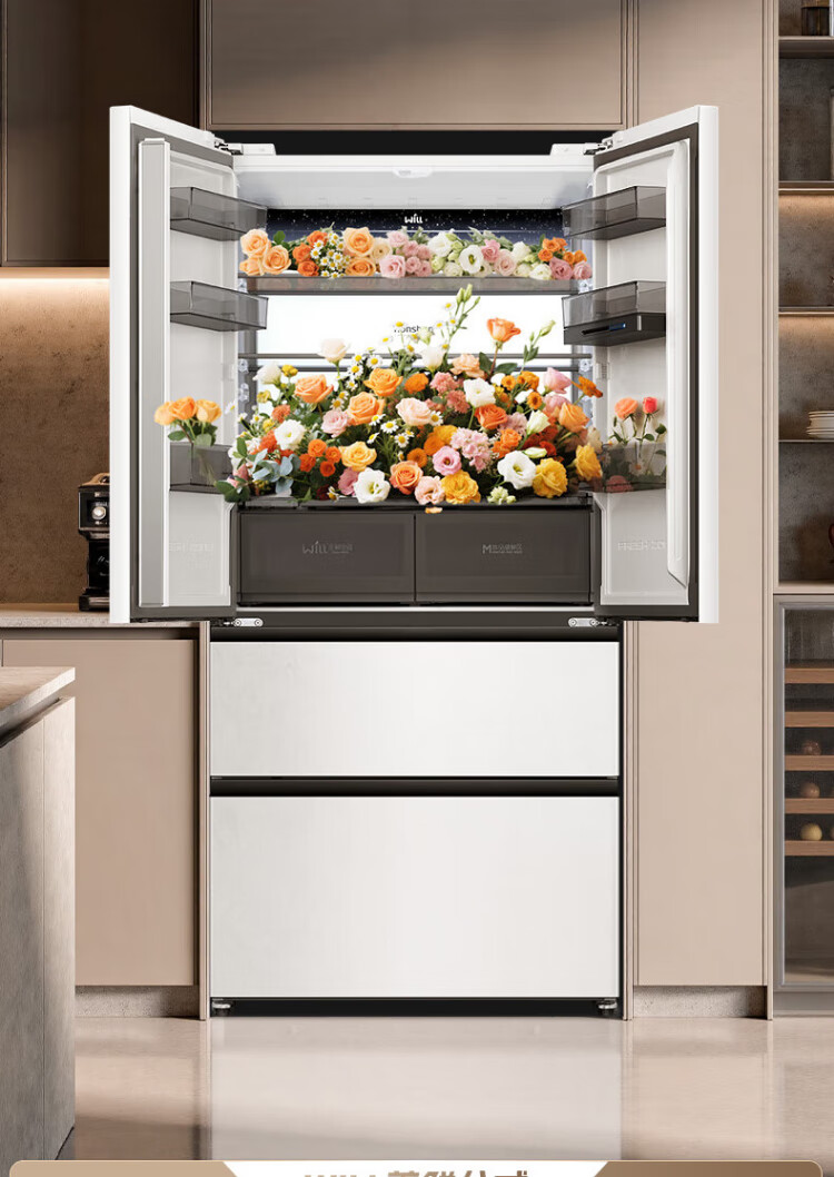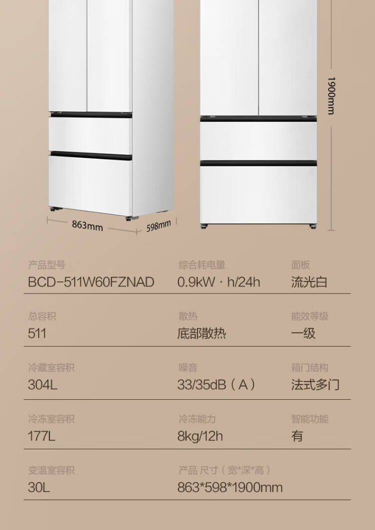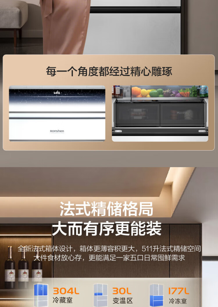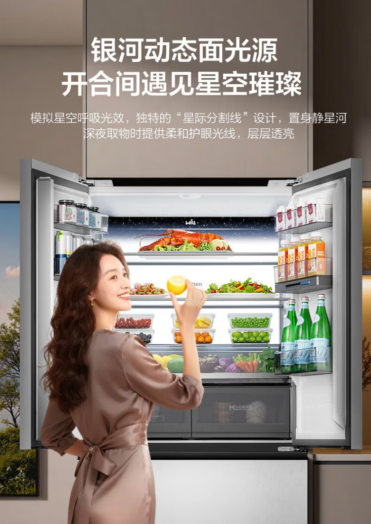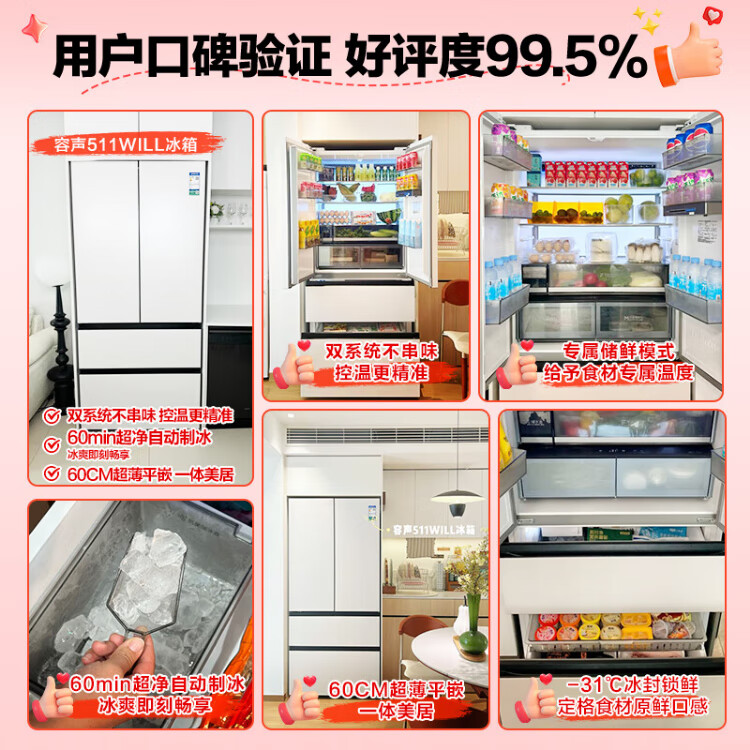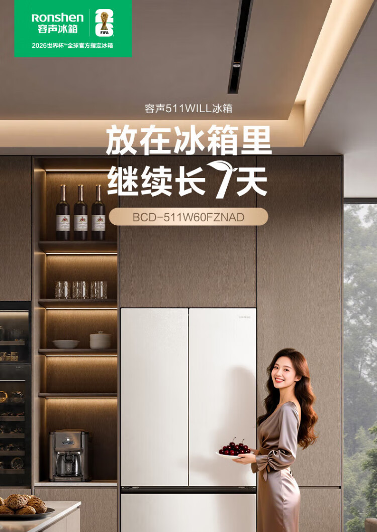 Rongsheng World Cup customized model 511WILL fresh dual system French multi-door four-door ultra-thin zero-embedded refrigerator home automatic ice making first-level energy efficiency national subsidy BCD-511W60FZNAD streamer white