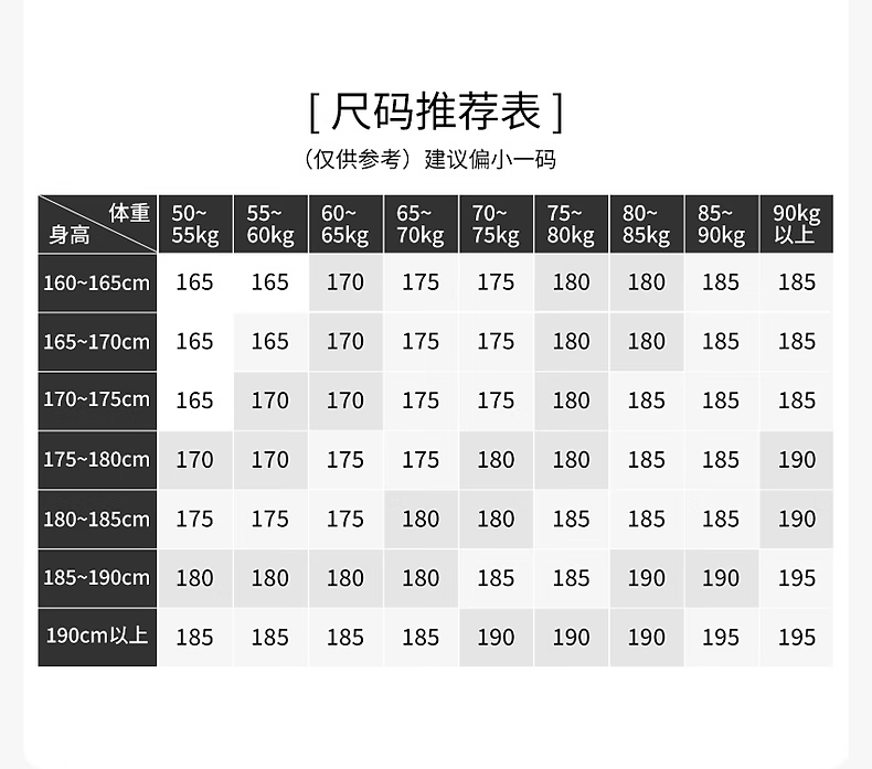 China (cm) 165 / 88-90 170 / 96-98 175 / 108-110 180 / 118-122 185 / 126-130