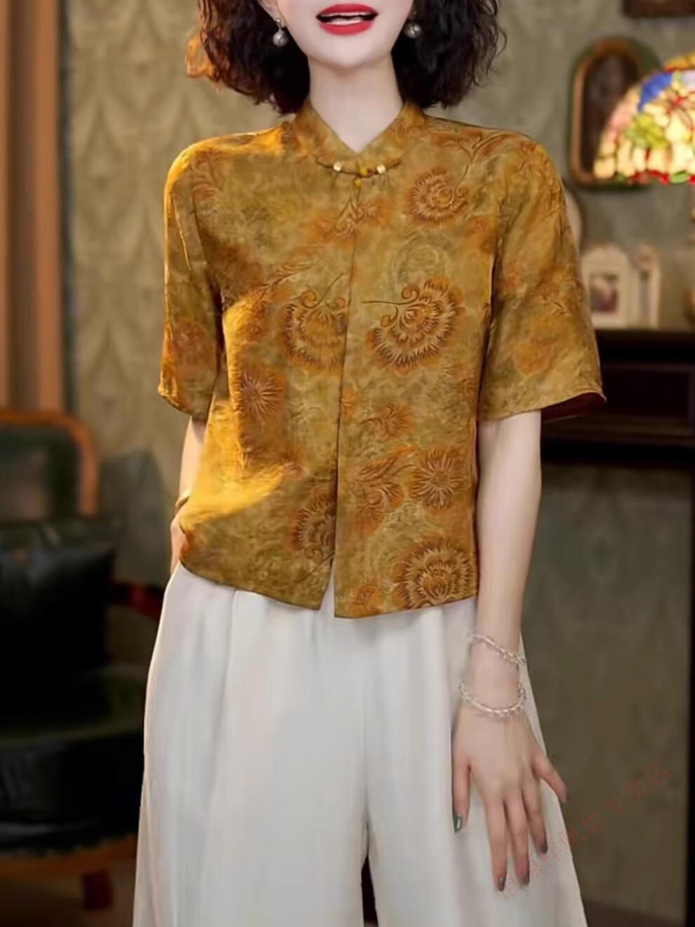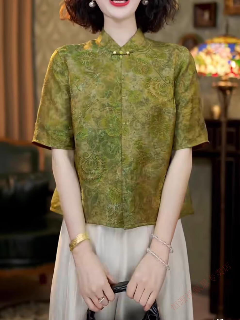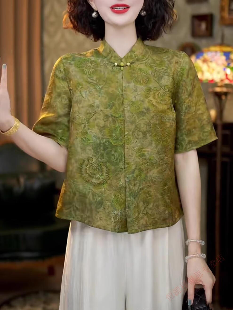 Hengyuanxiang New Chinese Style National Style Mother's Clothing Xiangyunsha Silk Jacquard Short Sleeve Shirt Women's 2026 Summer Tang Suit Small Shirt Top Green M 105-115Jin Jin equals 0.5 kg