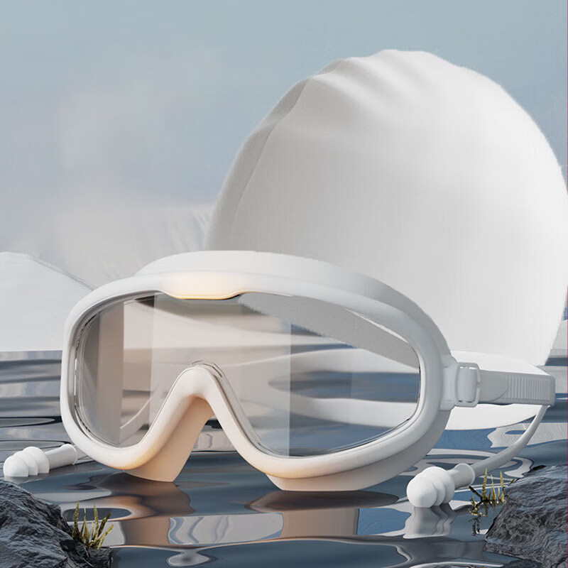 Jingchuan Asahi swimming goggles HD anti-fog waterproof glasses with earplugs swimming cap HD large frame adult swimming flat light diving equipment swimming goggles and swimming cap set white