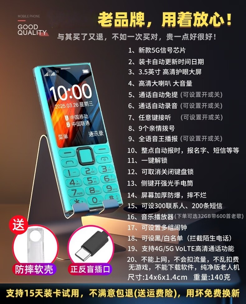 2025 newly launched high-end 5G full network mobile phone for the elderly, super long standby, special mobile phone for students and the elderly, loud and large characters, blue, call to register - 2025 new model, mobile 5G, supports all mobile cards, mobile phone + battery + charger