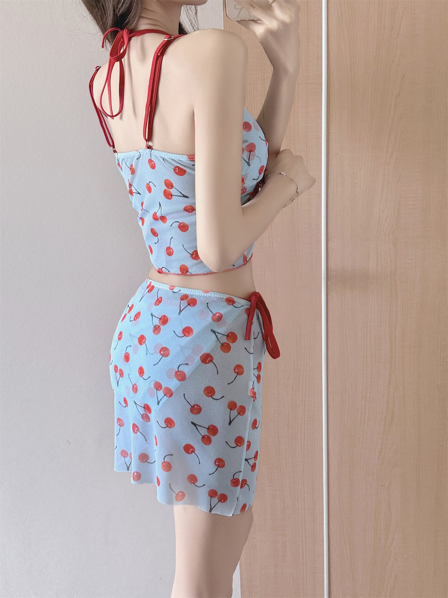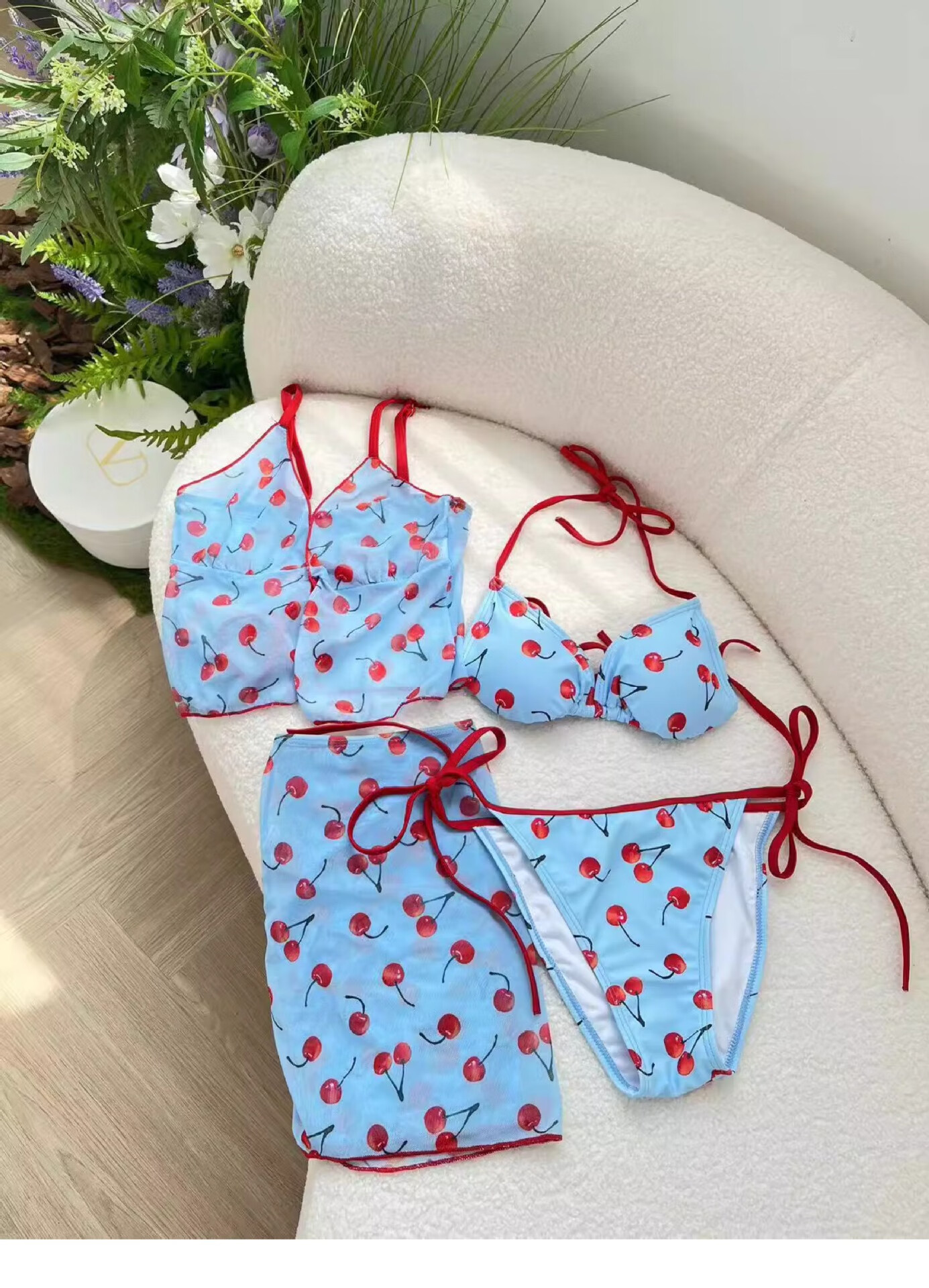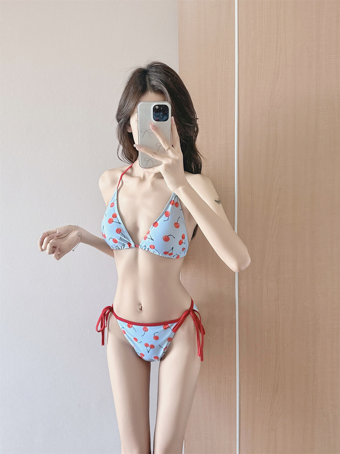 Bo Na Ling Cherry Girl Split Bikini Cute Student Belly Covering Slim Hot Spring Swimwear Four-piece Sexy Resort Swimsuit Blue One Size Recommended 80-120 Jin Jin equals 0.5 kg
