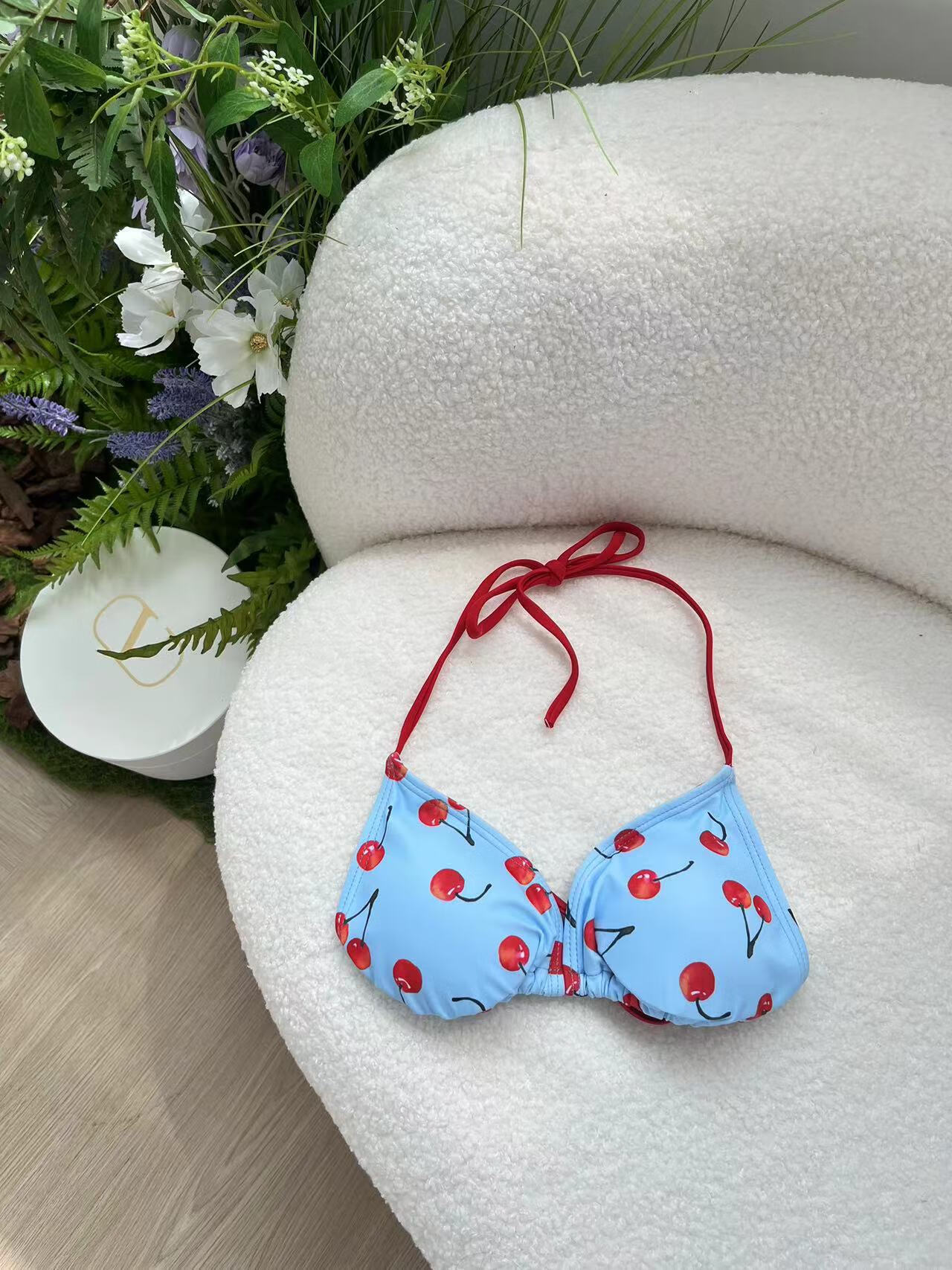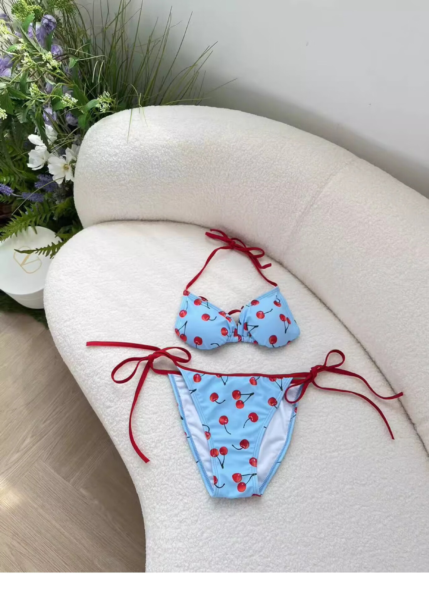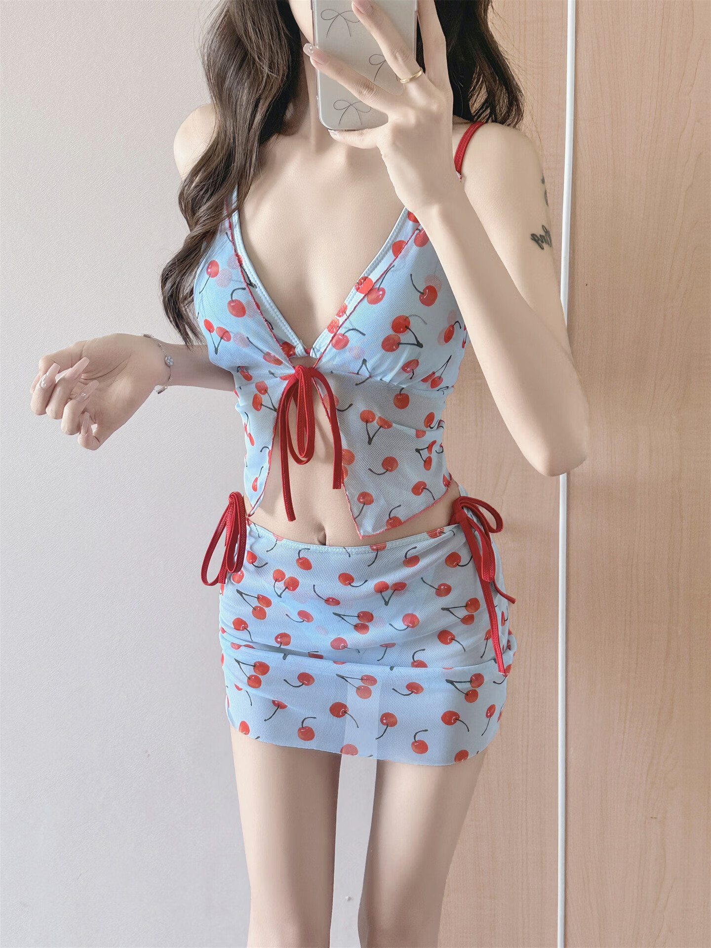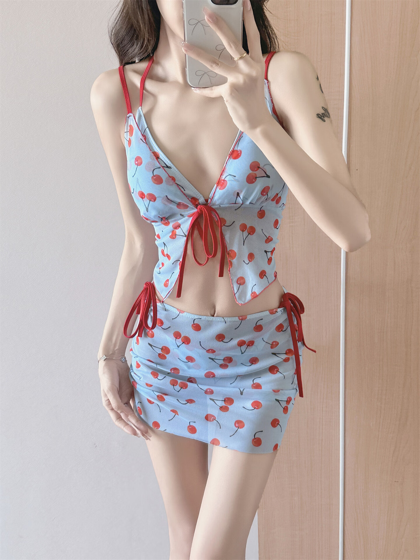 Bo Na Ling Cherry Girl Split Bikini Cute Student Belly Covering Slim Hot Spring Swimwear Four-piece Sexy Resort Swimsuit Blue One Size Recommended 80-120 Jin Jin equals 0.5 kg
