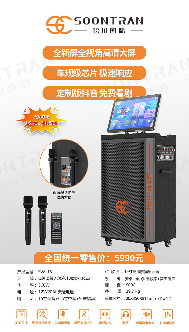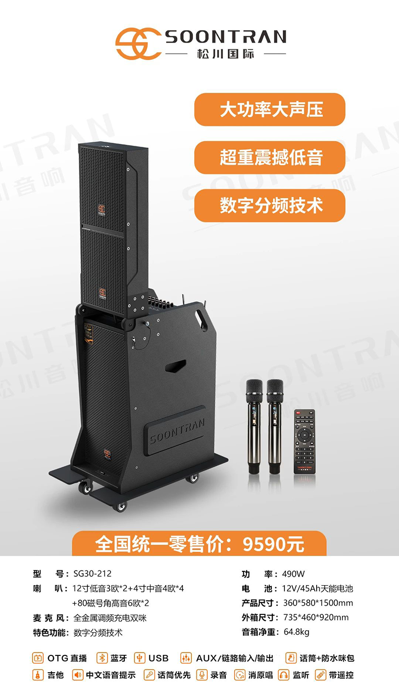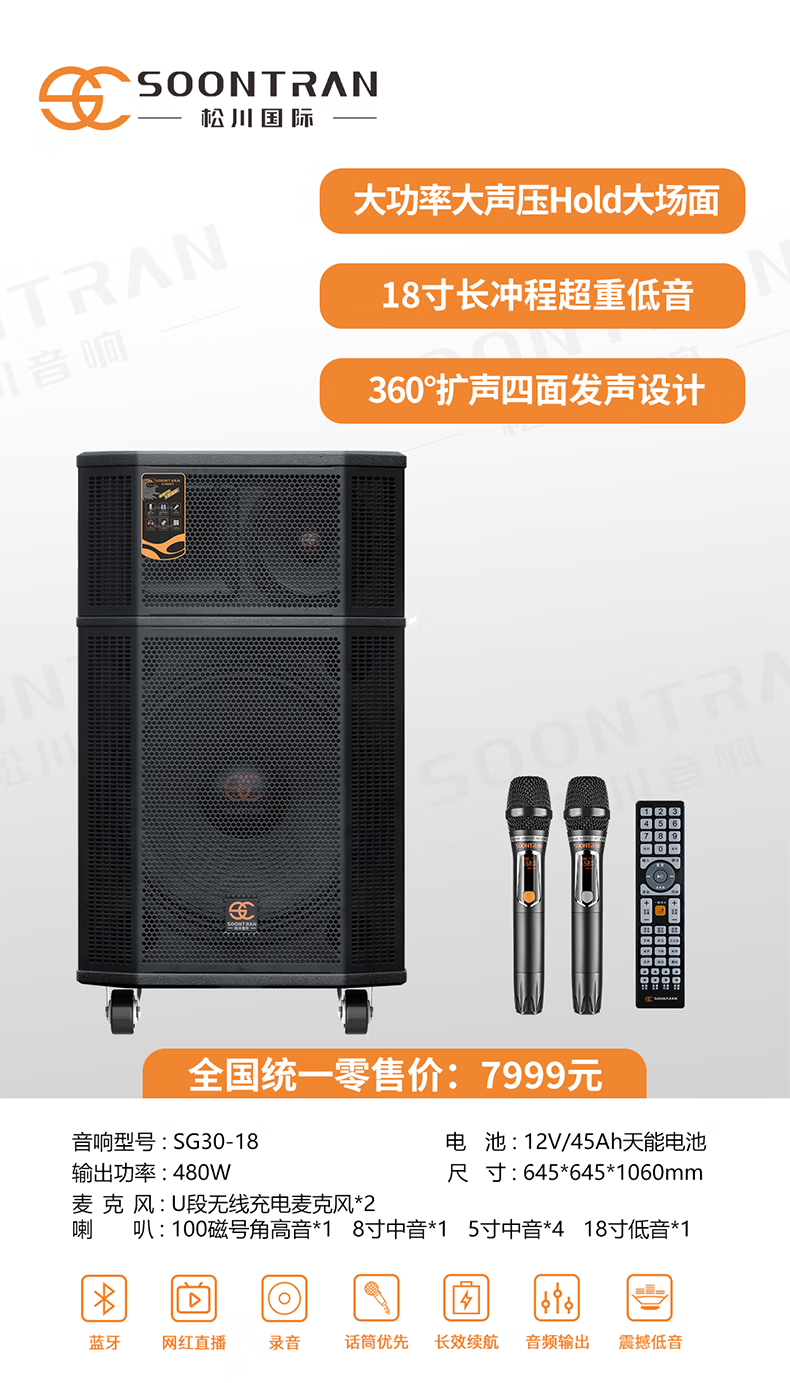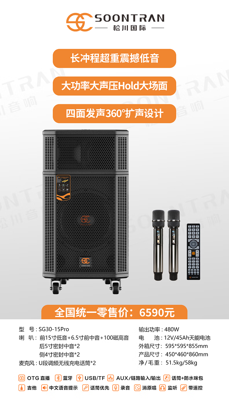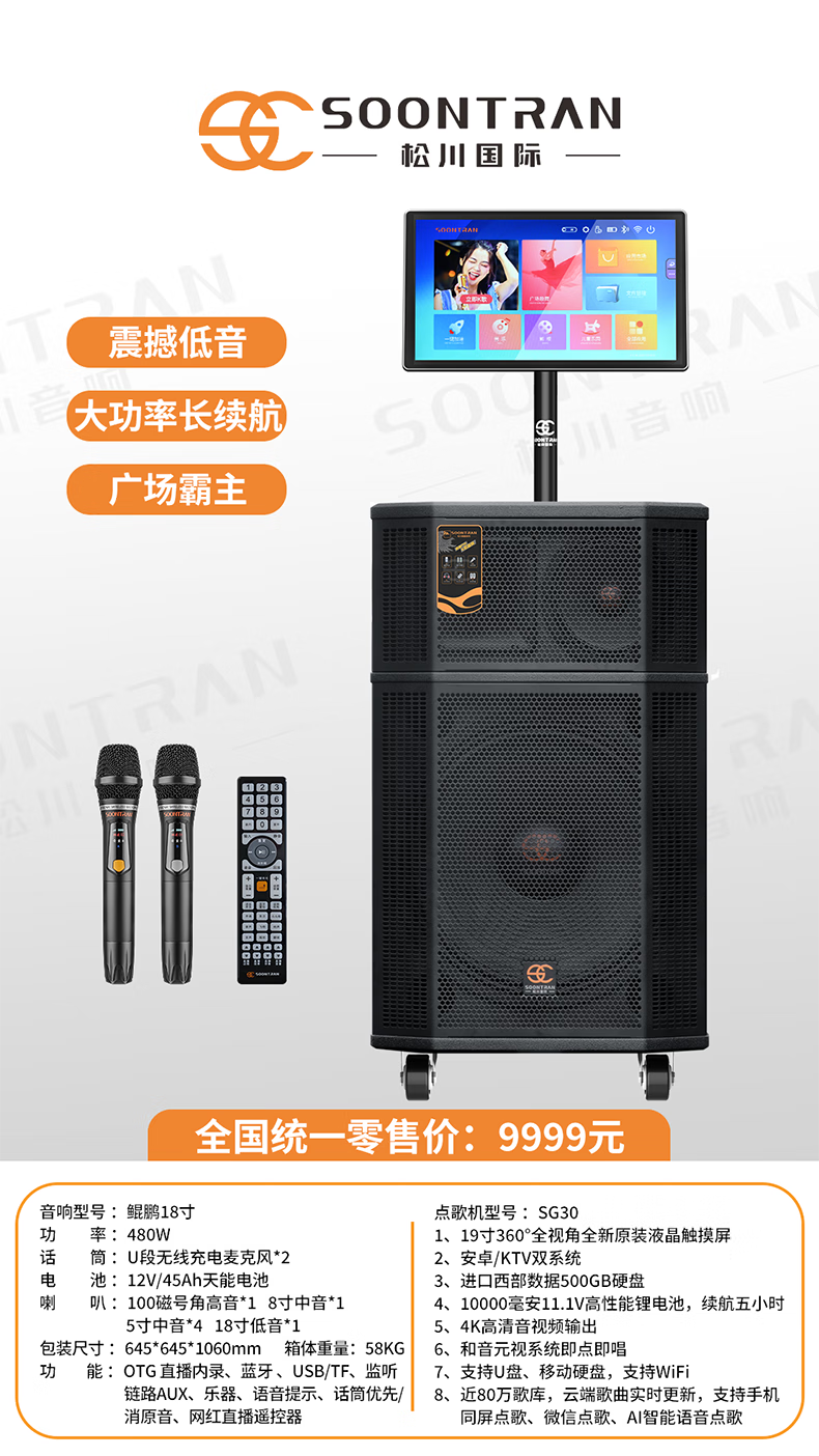 Songchuan International SG30-12/18-inch square dance high-power audio outdoor karaoke lever karaoke speaker professional live broadcast with sound card all-in-one Bluetooth audio KTV Songchuan International Audio SG3-15Pro (480W) metal rechargeable microphone*2