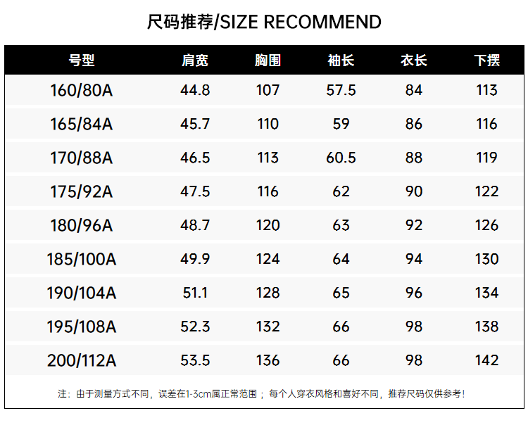 China (cm) 160-165/84-86 165-170 / 88-90 167-172 / 92-96 168-173 / 98-102 170-176 / 106-110