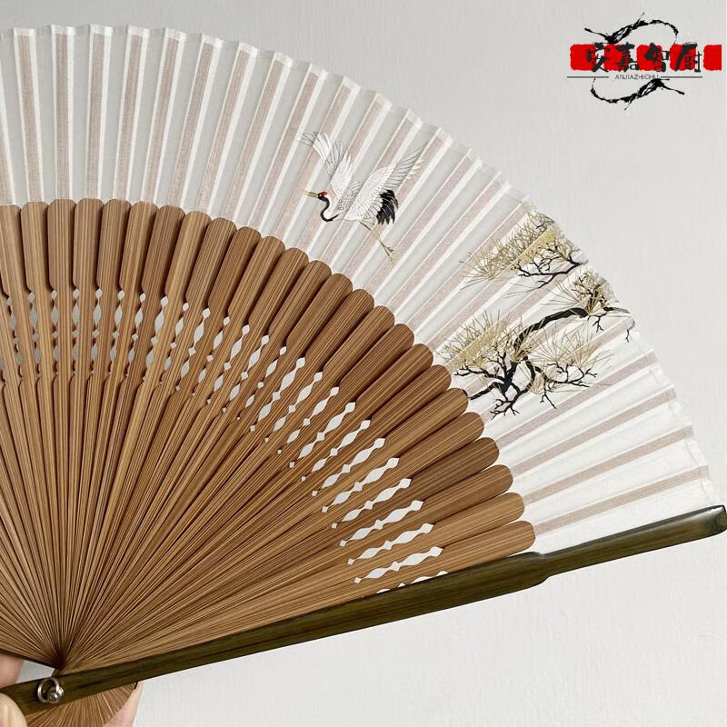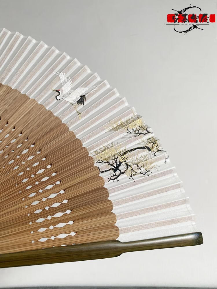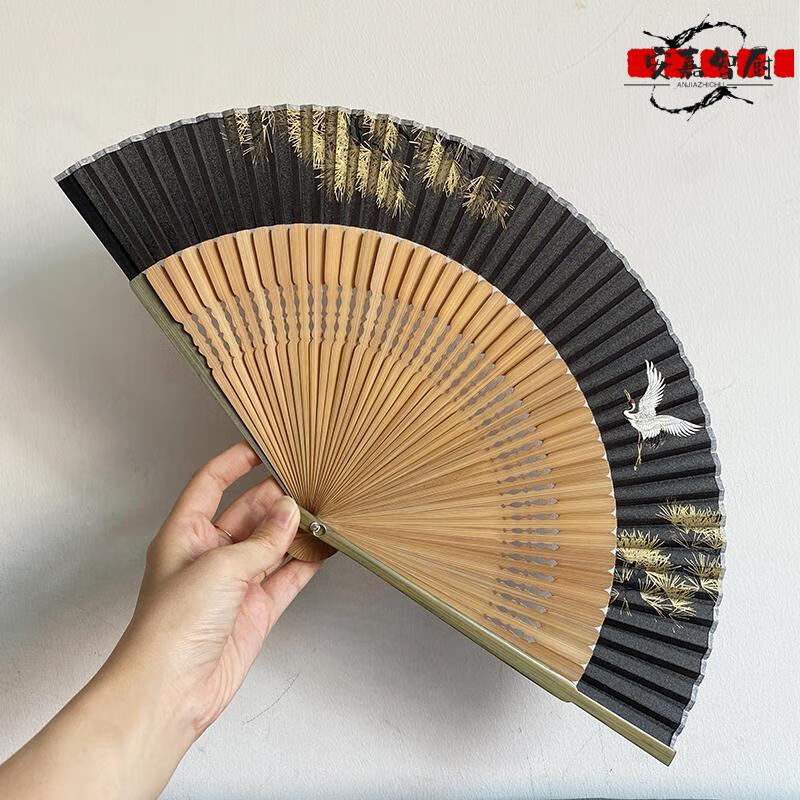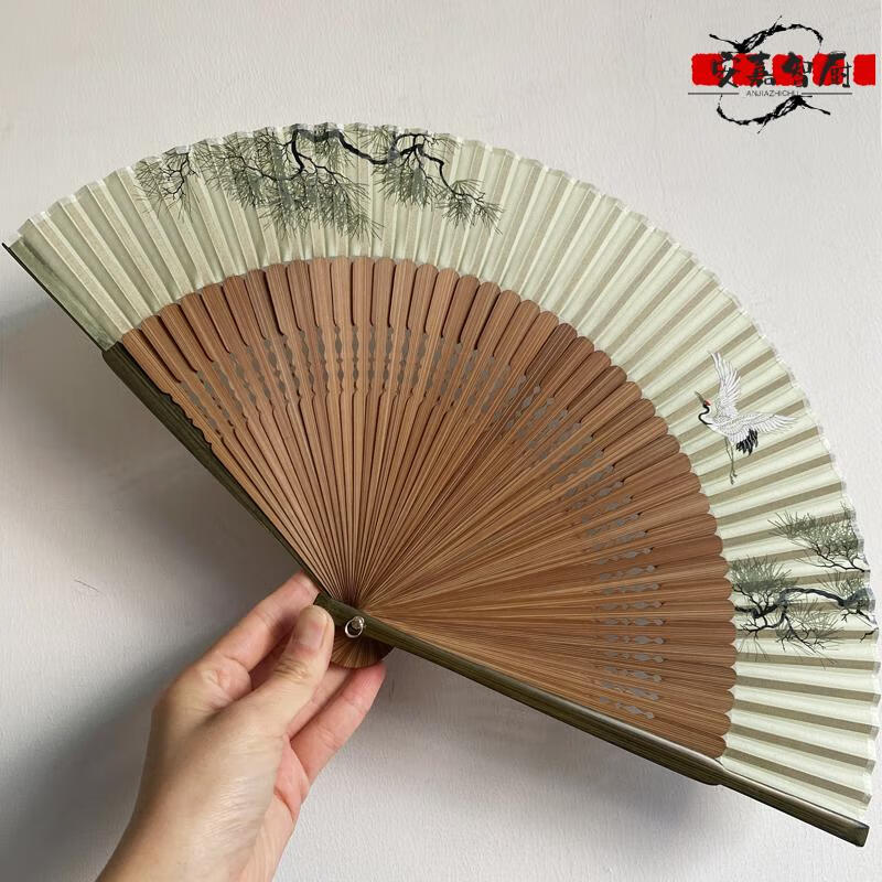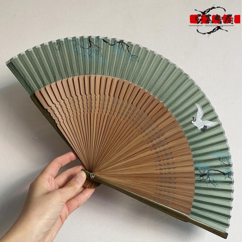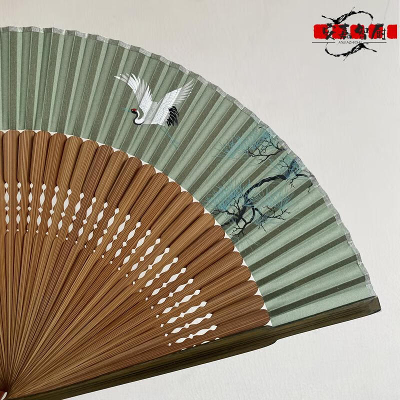 High-end fan, ancient style, high-end exquisite crane, longevity pine tree, national style, 7-inch Chinese style, can be paired with Hanfu yukata, yellow-green daily fan