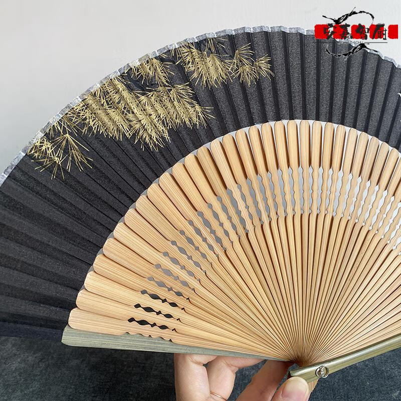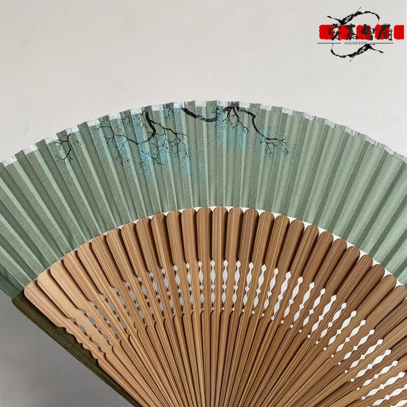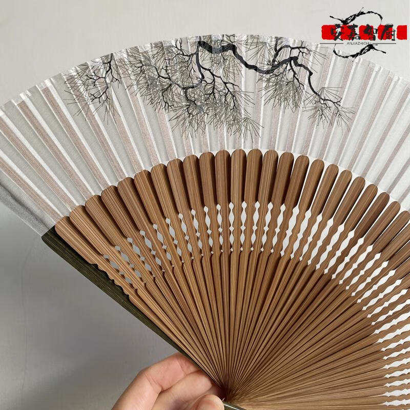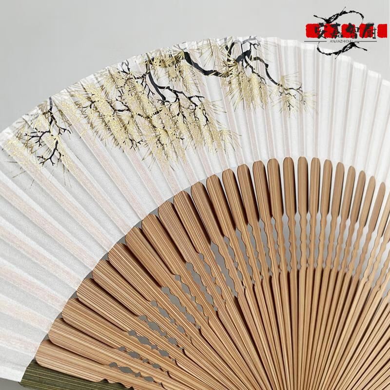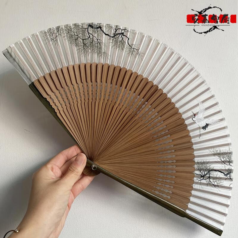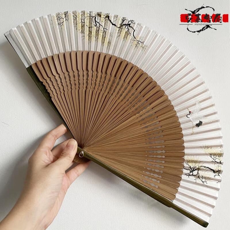 High-end fan, ancient style, high-end exquisite crane, longevity pine tree, national style, 7-inch Chinese style, can be paired with Hanfu yukata, yellow-green daily fan