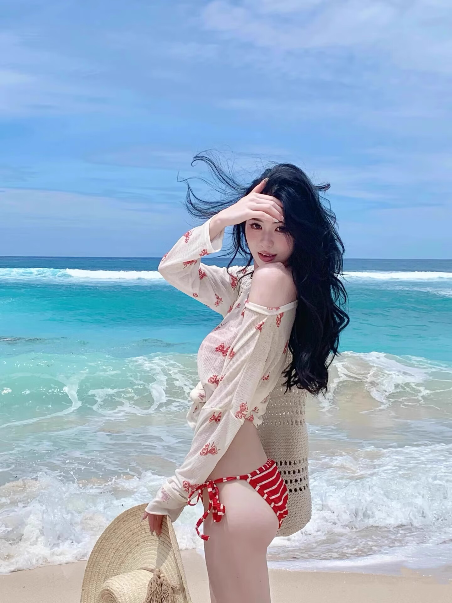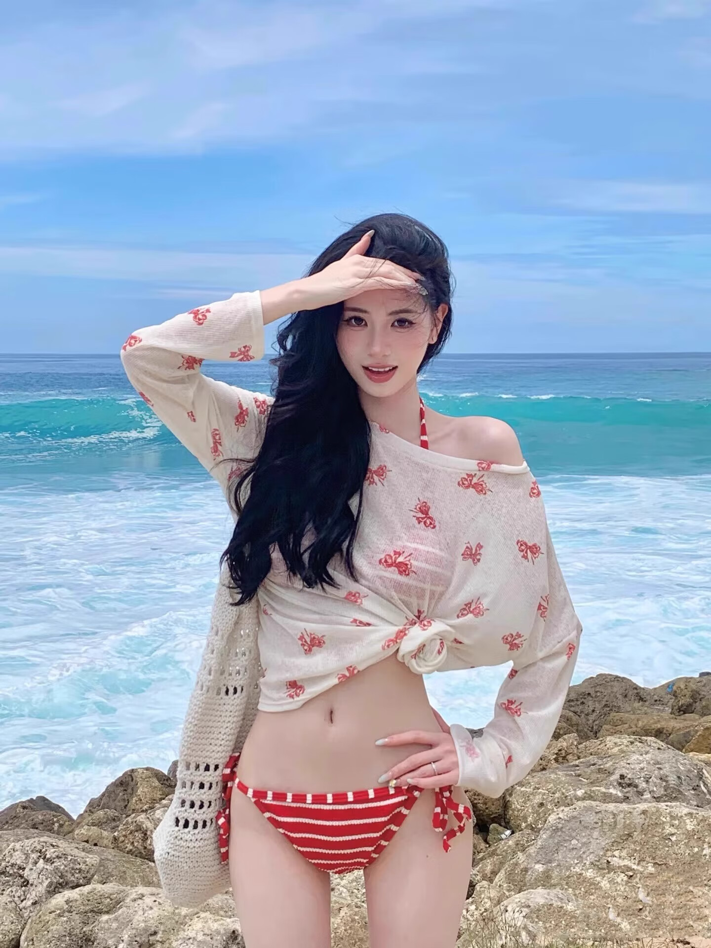 Nanmu Xiong bikini swimsuit women's split cover-up three-piece hot spring swimsuit sexy beach seaside vacation swimsuit red bikini three-piece set 75-120Jin Jin equals 0.5 kg