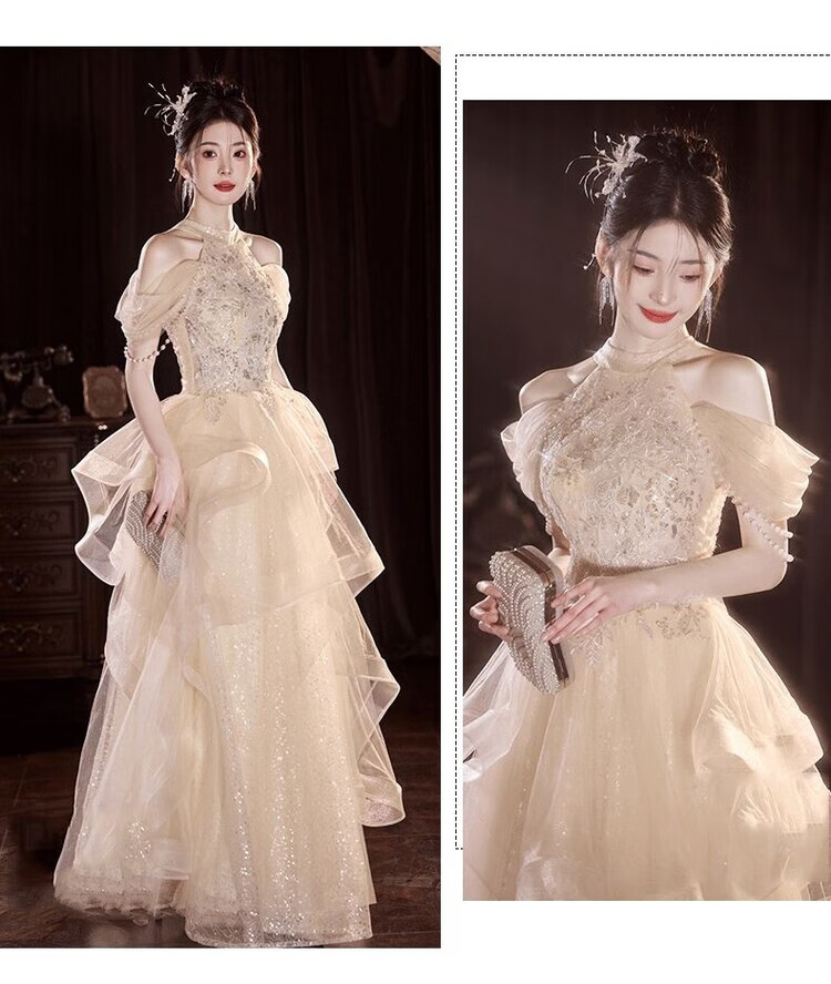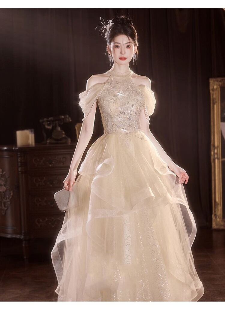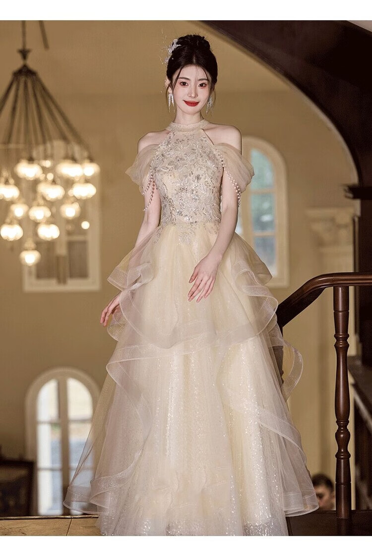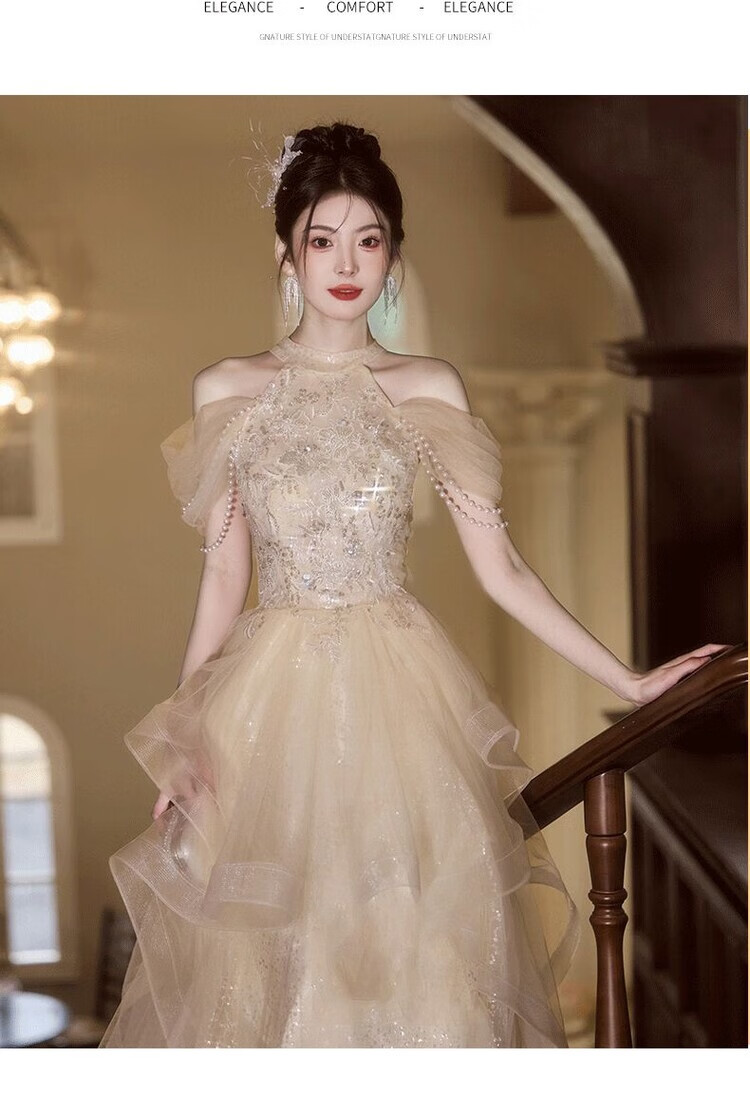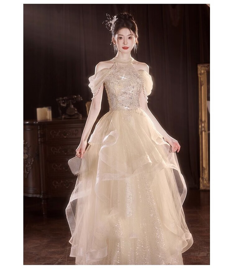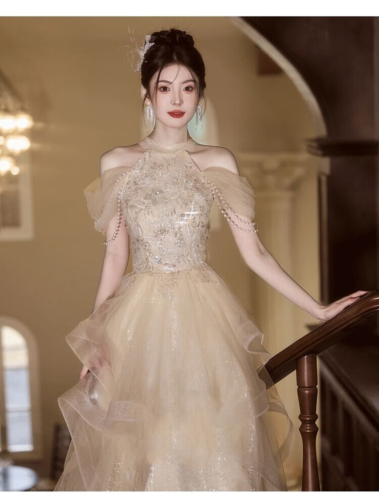 Champagne halterneck tassel evening dress for host adult ceremony, light wedding dress, high-end dressing gown, female bride's toast dress, engagement dress, champagne color XS